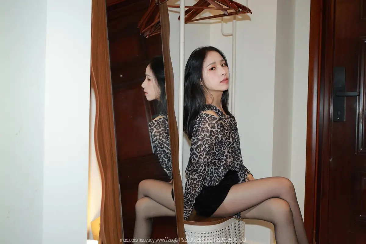 In the IESS SXJ No.2078 photoshoot, model Mei Ko captivates with her refined East Asian beauty. She confidently poses before a mirror, showcasing an elegant and alluring demeanor. Her unique patterned blouse, paired with black shorts and sheer stockings, accentuates her slender legs, creating a look that is both modern and enchanting. The warm lighting and minimalist interior setting further highlight Mei Ko's graceful charm. This series of images not only displays impressive fashion sense but also captures the natural, captivating aura of the young woman, inviting viewers to explore more.#IESS #MeiKo #ChineseModel #FashionPhotography #ElegantStyle