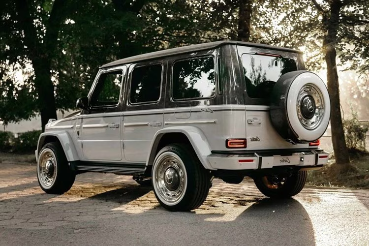 The ultra luxury SUV Mercedes AMG G63 Himalaya makes a powerful statement amidst the beautiful natural scenery Golden sunlight streaming through the tree canopy highlights every strong line and the prestigious appearance of this bespoke vehicle It is not just a car but a symbol of opulence and exclusivity custom built by Carlex Design With its rumored diamond covered exterior and a value approaching 45 billion VND the Mercedes AMG G63 Himalaya is truly a mobile masterpiece for the elite The perfect blend of AMG performance power and the sophistication of this special edition creates an unparalleled driving experience