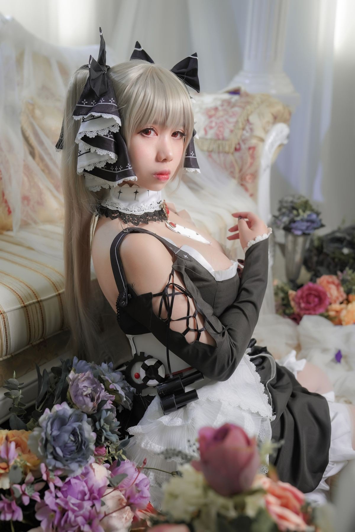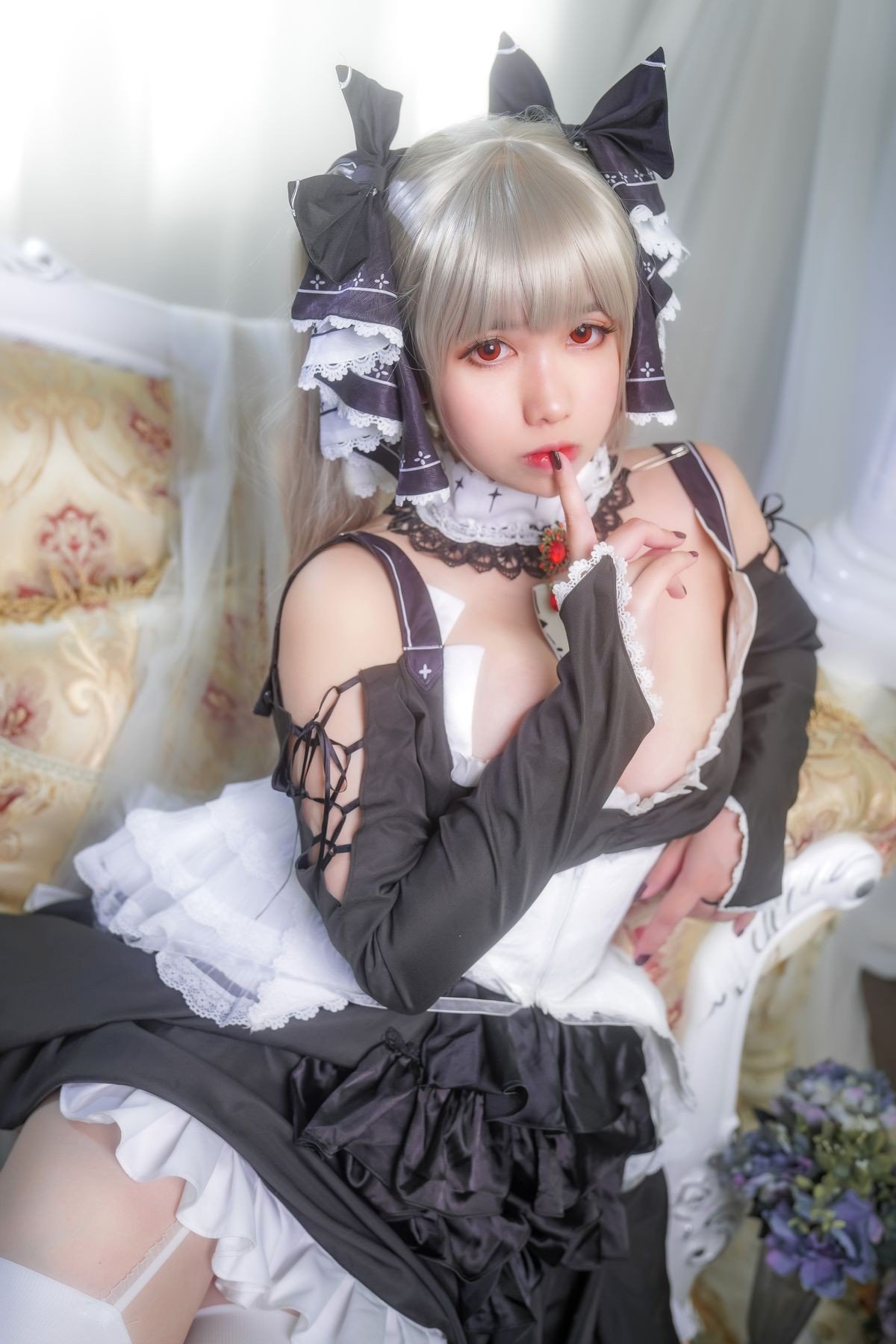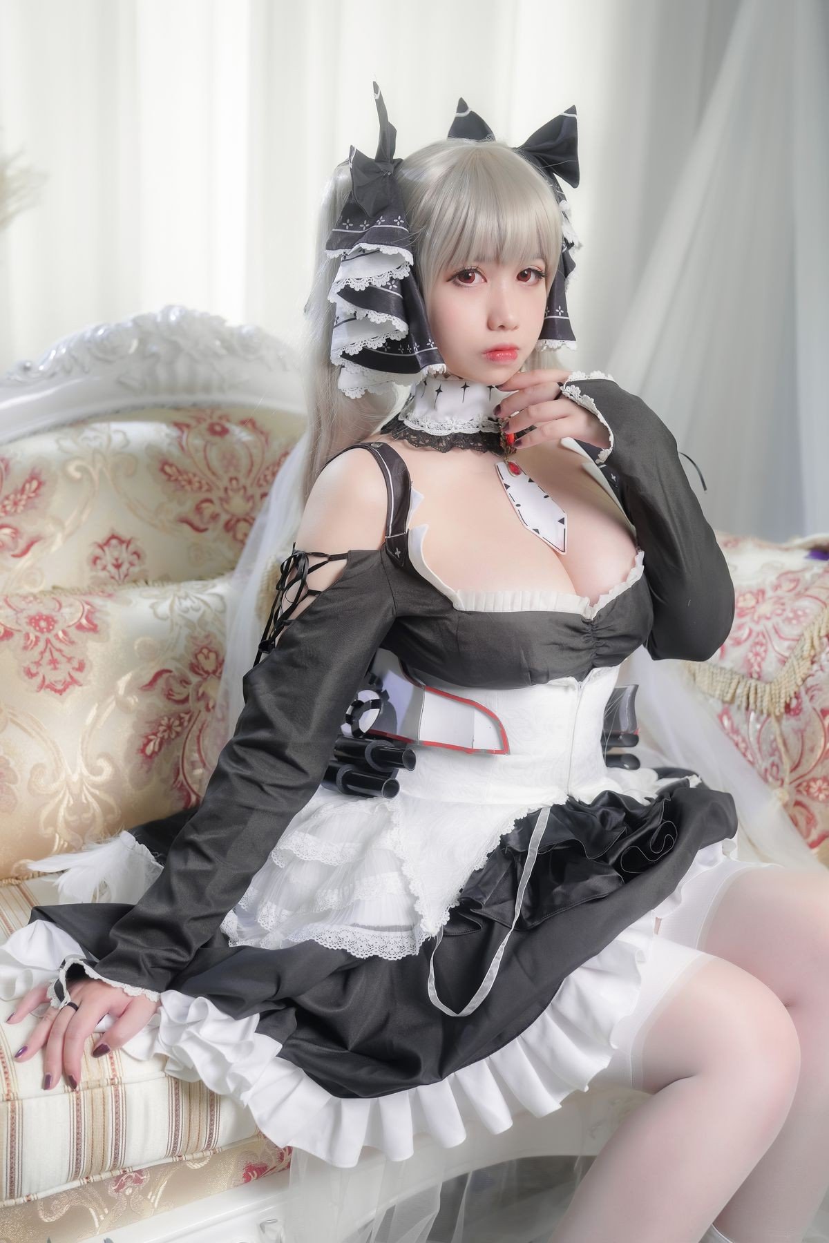 This stunning image features Coser Meitong Meroko embodying Formidable from the popular game Azur Lane Dressed in an exquisitely detailed black and white maid outfit Meitong Meroko perfectly recreates the characters elegant and captivating beauty Every detail from her platinum blonde hair to the delicate lace and bows on the dress is meticulously crafted exuding sophistication and grace Her elegant sitting pose and enchanting gaze further highlight the battleship goddess charisma This artistic cosplay masterfully conveys Formidables allure to fans and captures every eye with its charm and precision