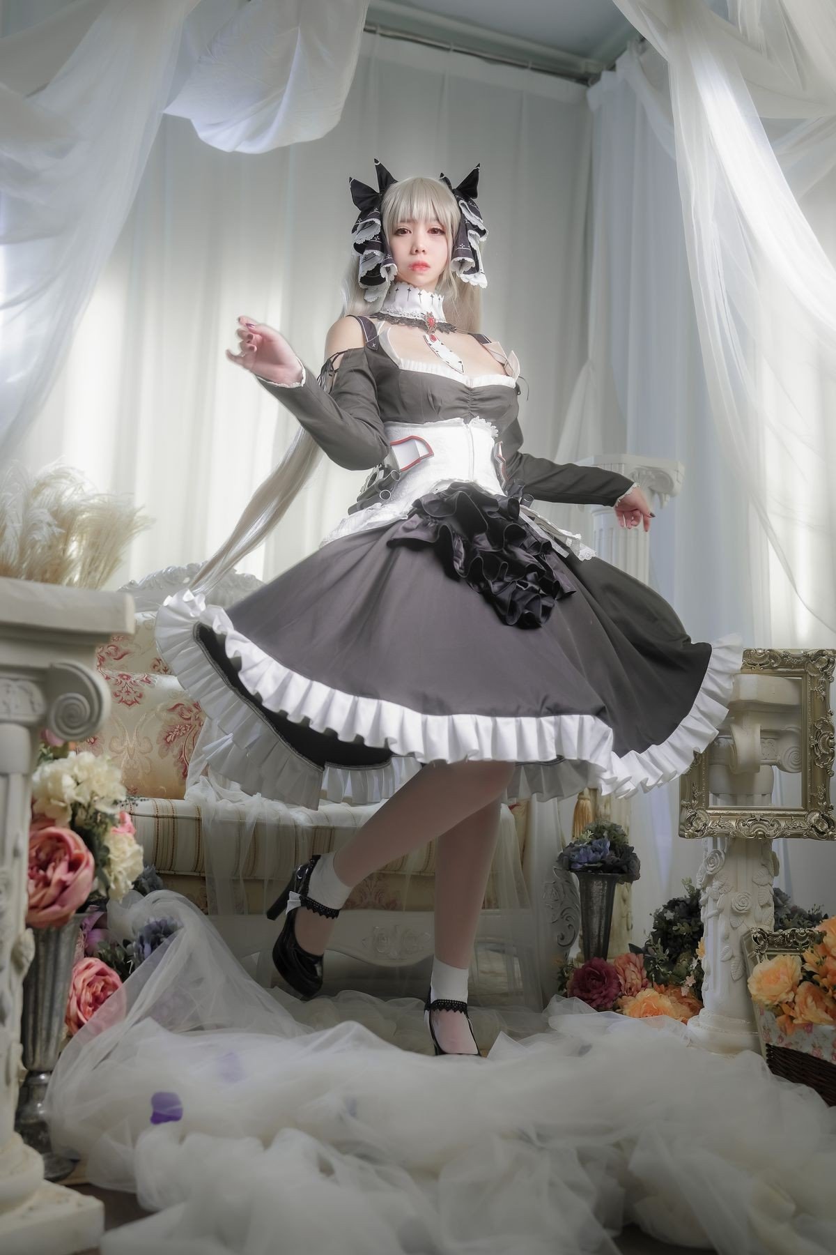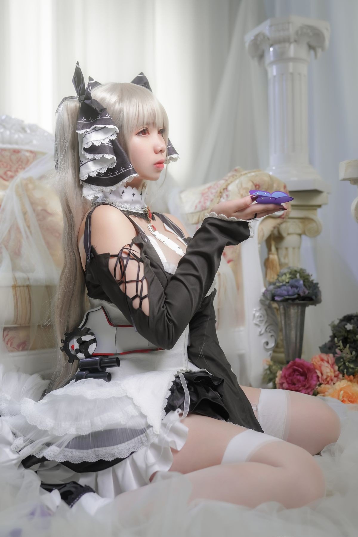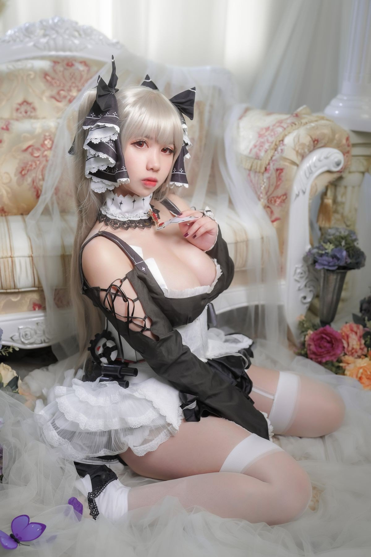 This stunning image features Coser Meitong Meroko embodying Formidable from the popular game Azur Lane Dressed in an exquisitely detailed black and white maid outfit Meitong Meroko perfectly recreates the characters elegant and captivating beauty Every detail from her platinum blonde hair to the delicate lace and bows on the dress is meticulously crafted exuding sophistication and grace Her elegant sitting pose and enchanting gaze further highlight the battleship goddess charisma This artistic cosplay masterfully conveys Formidables allure to fans and captures every eye with its charm and precision
