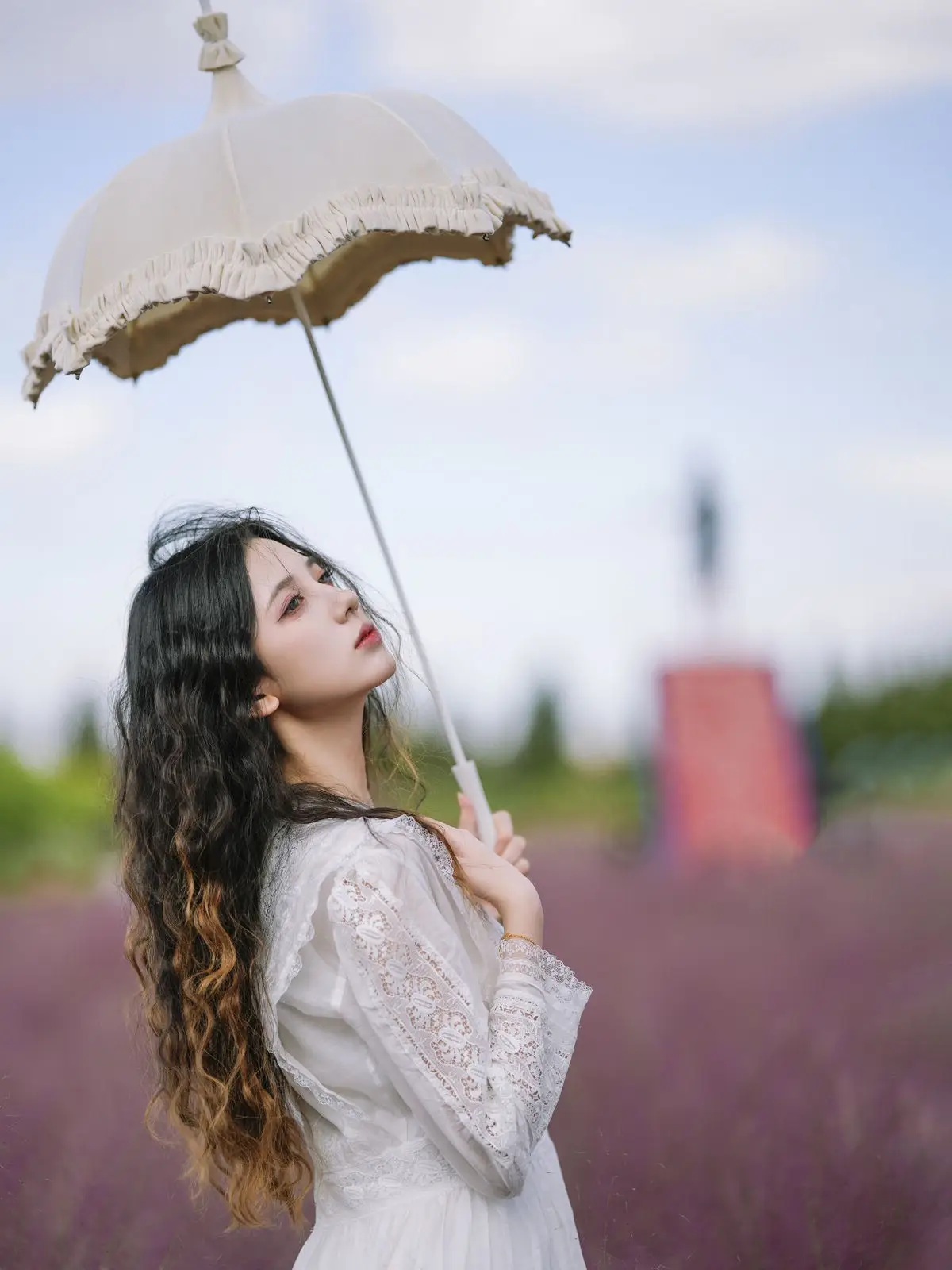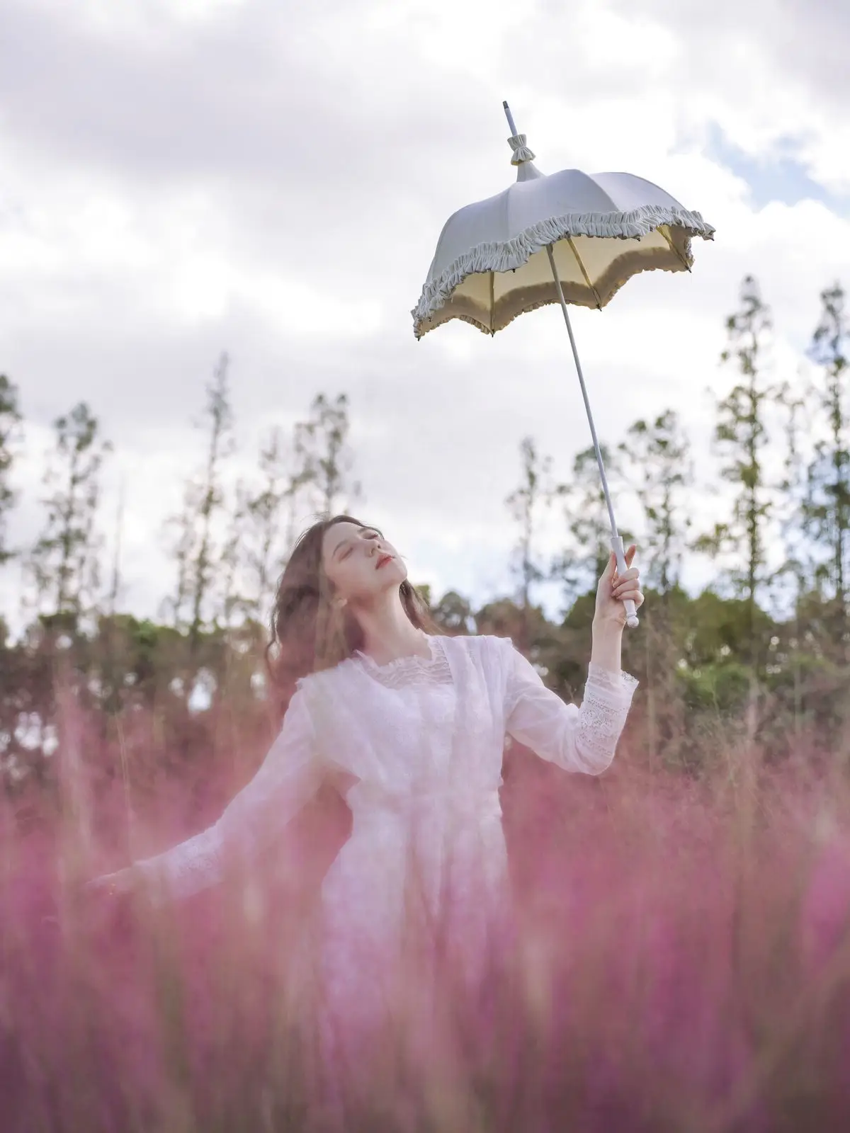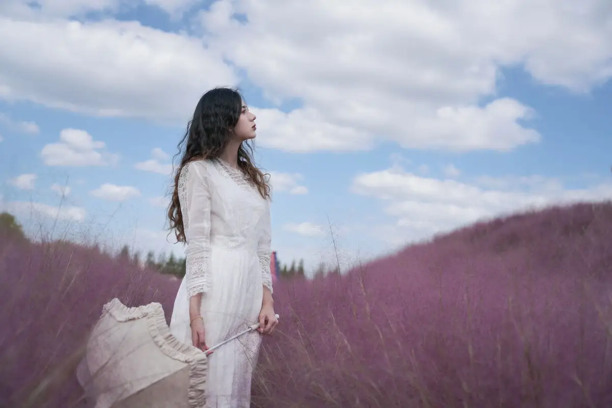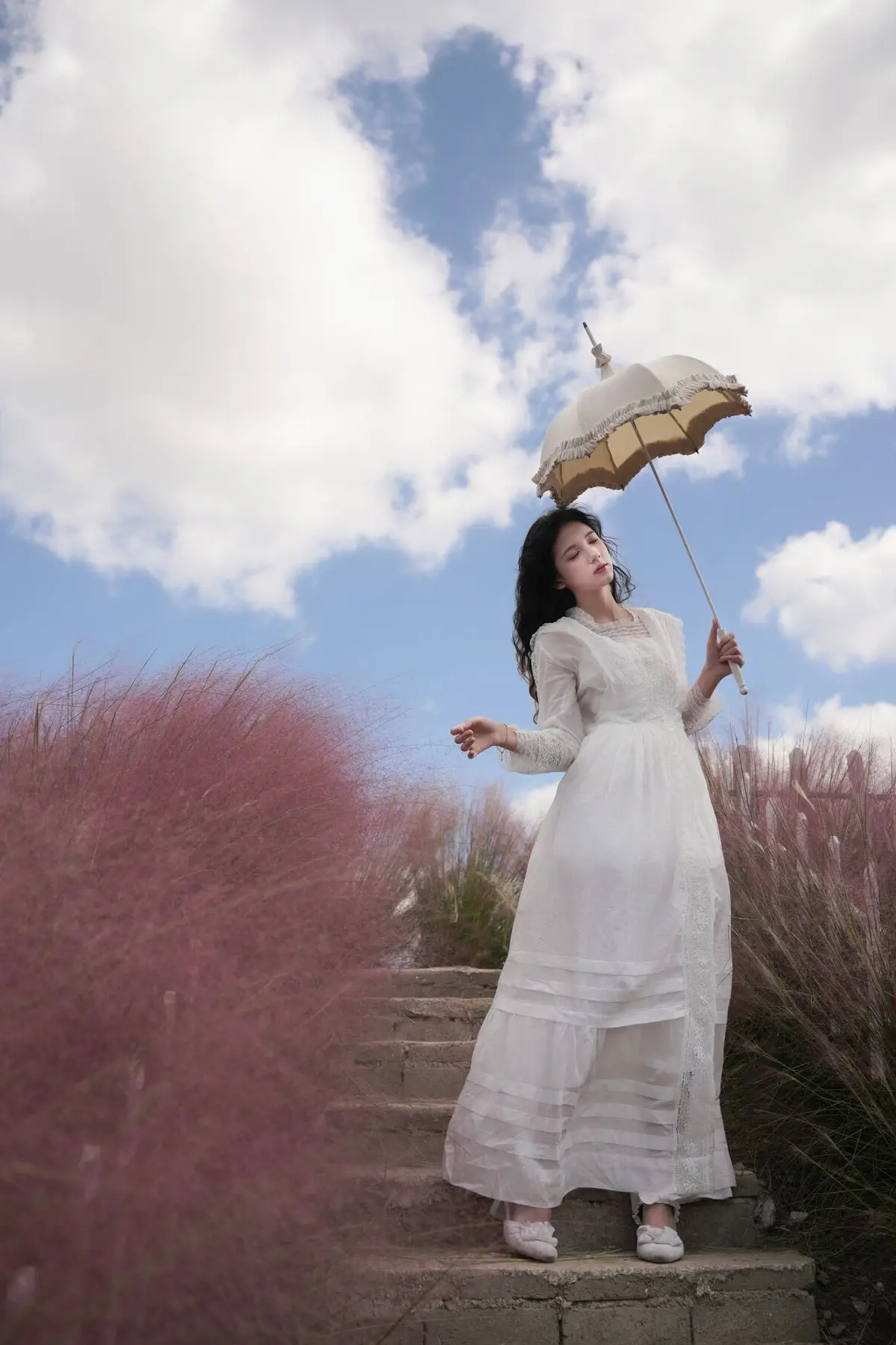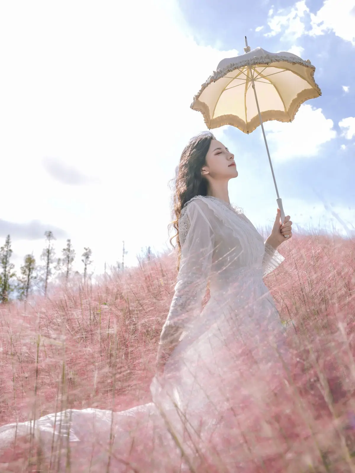 In the YiTuYu Vol.8630 photo collection, model Enyyyn emerges as a muse amidst a romantic pink grass field. Dressed in a pristine white gown, she gracefully holds a white umbrella, exuding an ethereal and captivating charm. Enyyyn's flowing hair and distant gaze blend beautifully with the endless expanse of purple-pink Muhly grass under a clear blue sky. This image evokes a dreamy autumn landscape where human beauty and nature intertwine, offering a profound sense of peace and romance. It is truly an artistic moment filled with emotion.#Enyyyn #PinkGrass #NatureBeauty #ModelPhotography #RomanticVibes