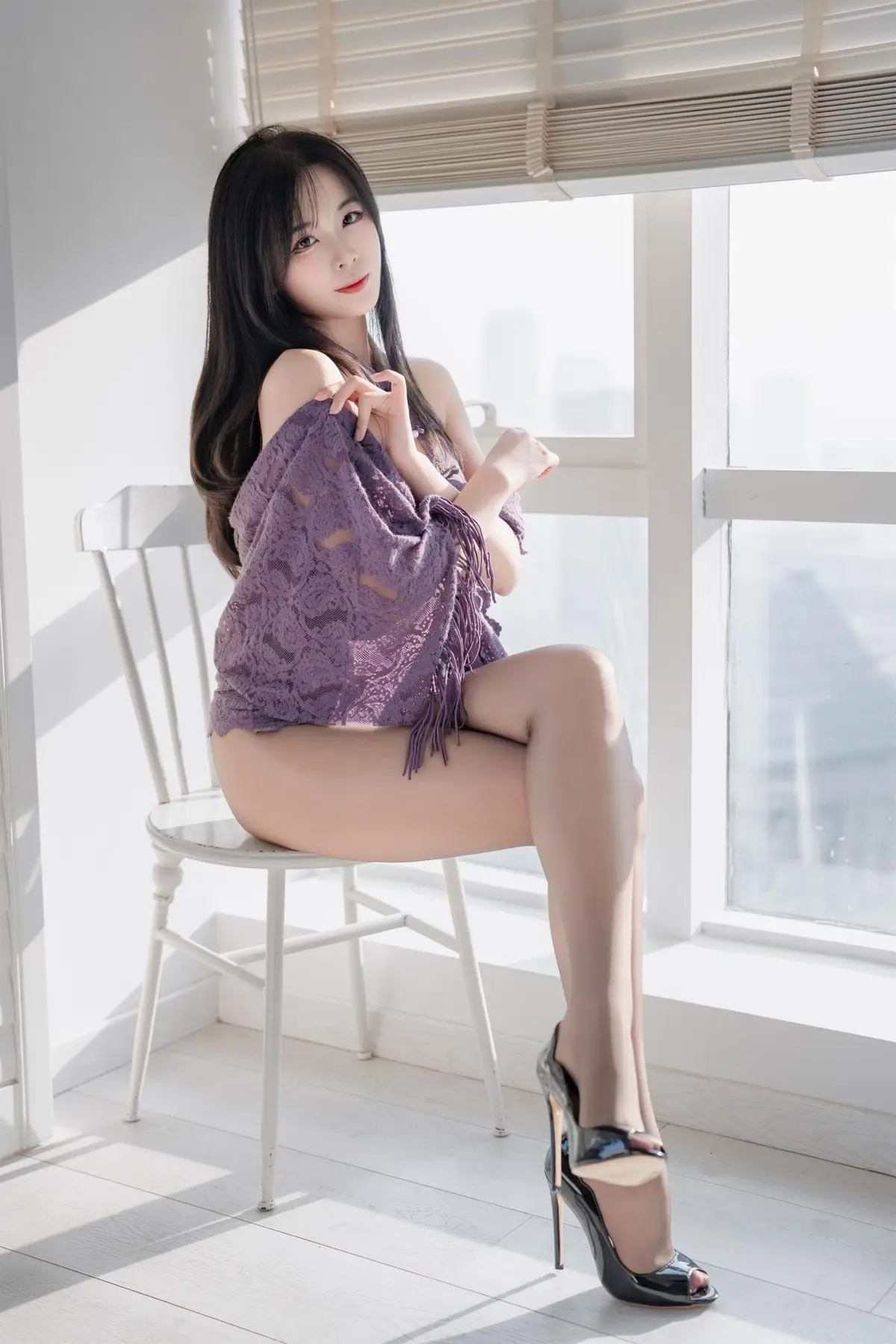 Coser Xuan Xiao Xue Jie radiates captivating beauty in a mesmerizing purple cheongsam This exquisitely designed outfit elegantly embraces her figure highlighting her slender physique and long graceful legs The mysterious purple hue combined with soft fabric creates a look that is both classic and contemporary full of unique personality Her graceful sitting pose captivating gaze and gentle smile further enhance her undeniable allure This image not only showcases a distinctive cosplay style but also vividly portrays the models confidence and compelling charisma It is undoubtedly a striking picture leaving viewers with profound emotions about the harmonious blend of tradition and modern beauty