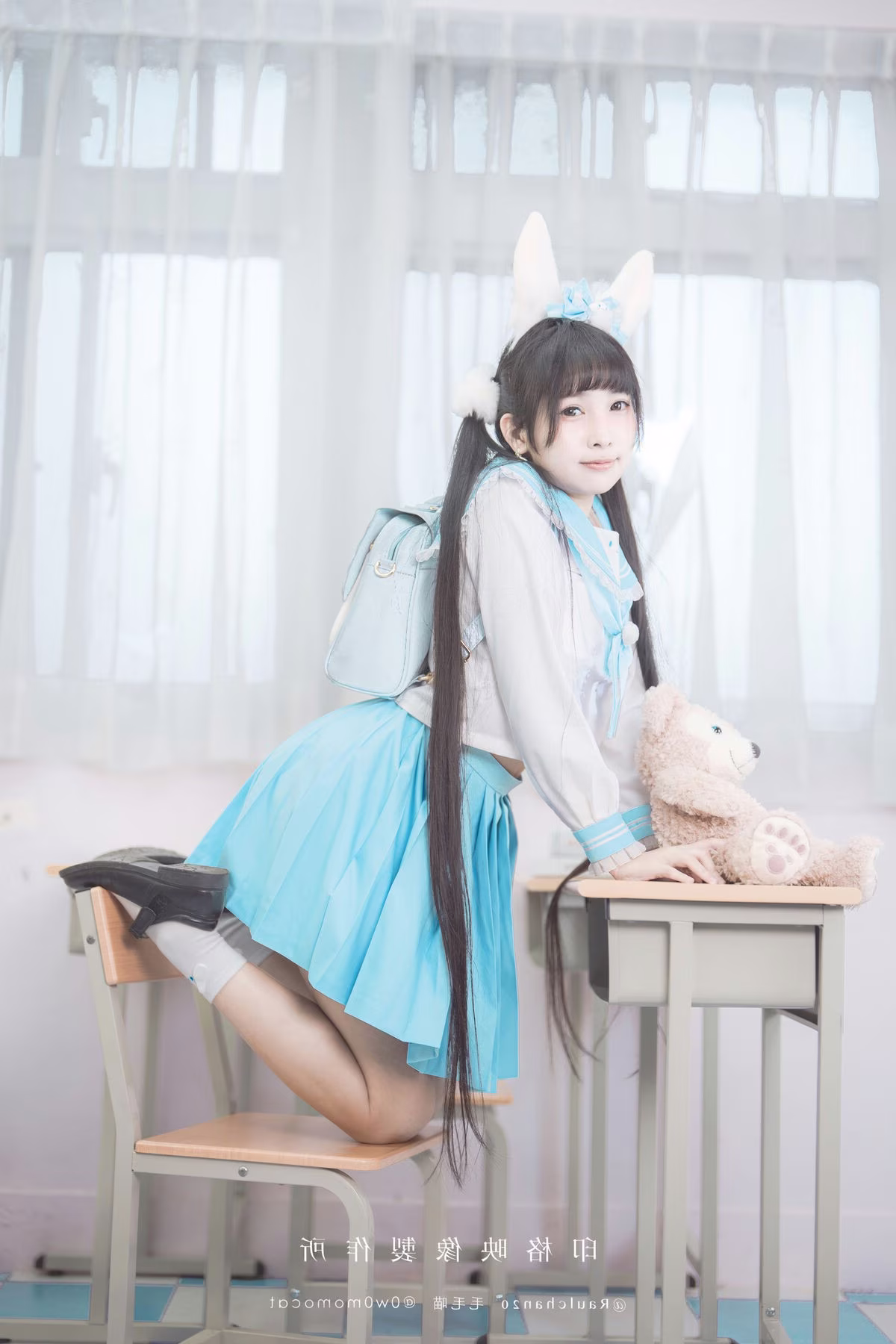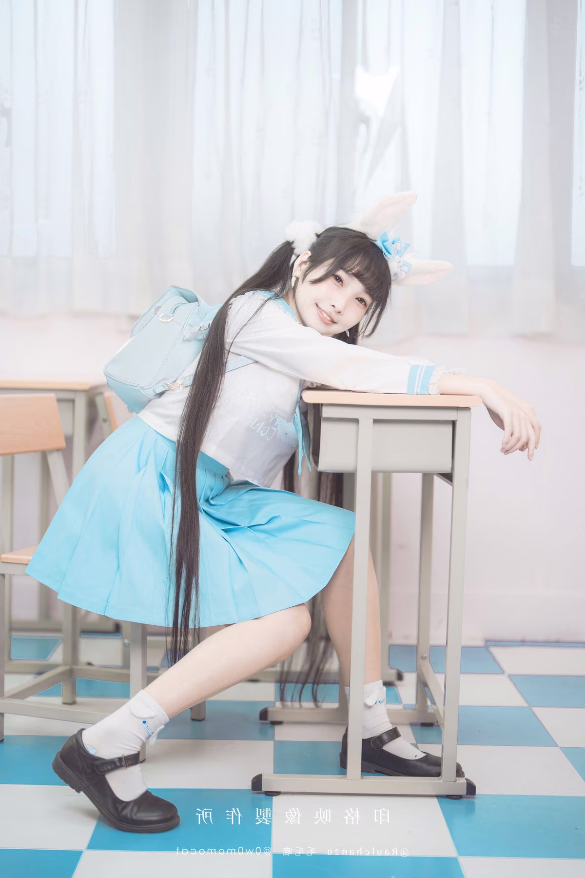 In this captivating photoshoot, Coser Mu Mu Momo beautifully embodies the sweet and utterly adorable Cinnamoroll. Dressed in a classic blue and white sailor uniform, complemented by soft bunny ears, Mu Mu Momo radiates a pure and innocent charm. Her gentle smile and tender gaze create an enchanting image, evoking nostalgic memories of youthful school days. The simple school setting further accentuates the pristine beauty of this real-life Cinnamoroll. This collection is sure to captivate viewers with the delightful cuteness and graceful appeal of Coser Mu Mu Momo.