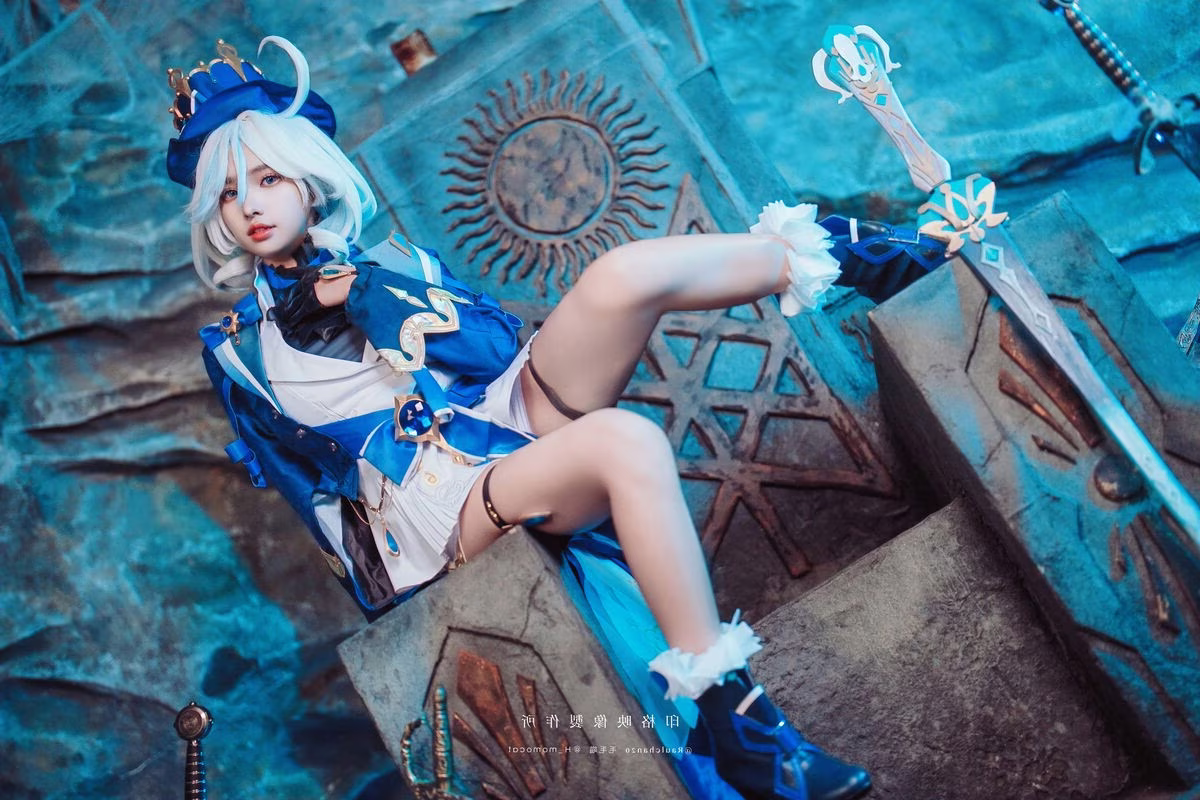 Coser Mumu Momo delivers an exceptional portrayal of Furina the God of Justice Her magnificent blue and white costume paired with striking platinum hair creates an aura of nobility and authority Every detail from her ornate hat to intricate accessories is meticulously crafted showcasing serious dedication to this cosplay Mumu Momos profound gaze and graceful posture perfectly capture Furinas essence a deity both splendid and contemplative This image is not merely a cosplay photograph it is a narrative of justice and enigmatic beauty Viewers will be captivated by the harmonious blend of cosplay skill and authentic emotional expression