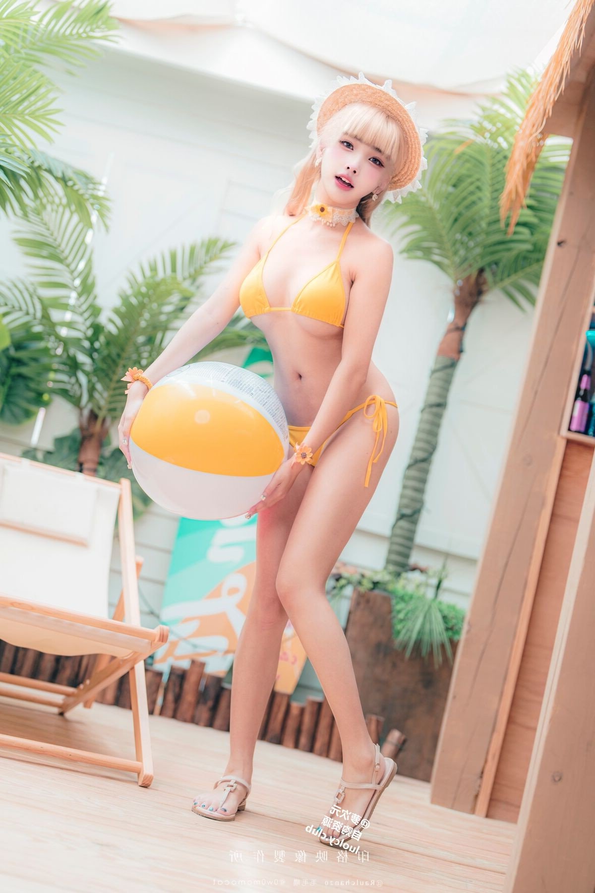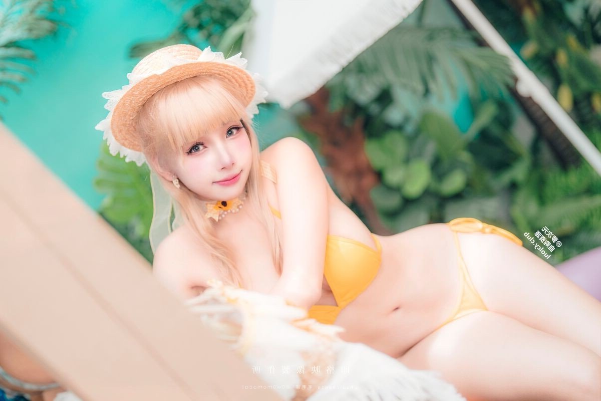 Discover the stunning beauty of Coser 慕慕Momo in her enchanting Summer Time collection. This captivating image captures a moment of relaxation featuring the blonde haired model in a vibrant orange yellow bikini and a charming straw hat. 慕慕Momo's alluring gaze directed straight at the camera creates an irresistible charm. The tropical backdrop with lush green foliage and soft sunlight further accentuates her graceful and dynamic beauty. This is a perfect picture to experience the lively summer atmosphere and the elegance of Coser 慕慕Momo. She brings a fresh and vibrant energy to the photoshoot. Immerse yourself in these impressive visuals and soak in the endless summer vibe