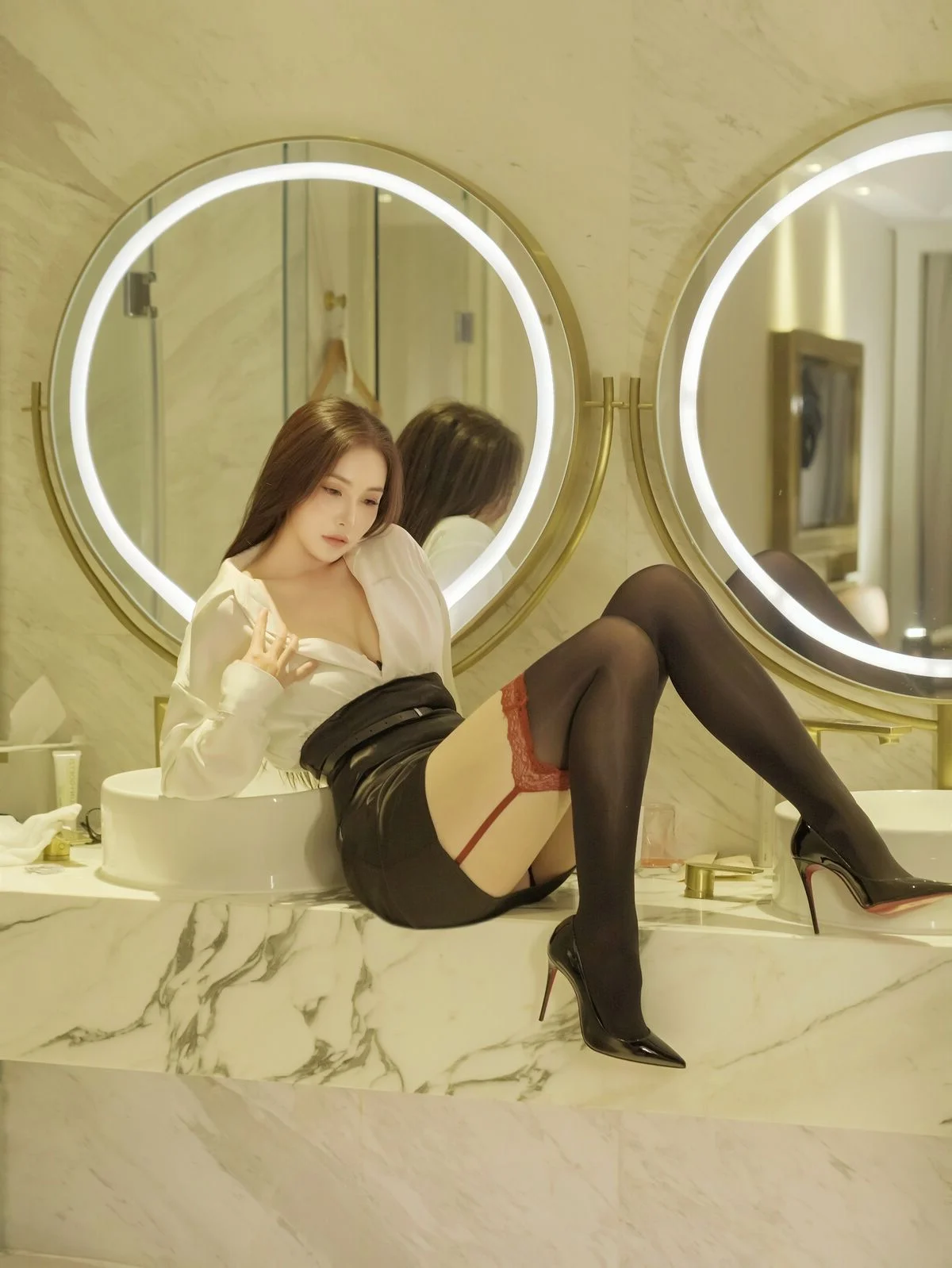 This captivating visual captures Ya Xuan ELVA in a moment of quiet sophistication and undeniable charm. The soft, warm ambient lighting perfectly complements the luxurious texture of her white silk blouse, creating a beautiful contrast against the sleek black skirt and classic stockings. The composition exudes a modern feminine vibe, blending professional elegance with a touch of intimate allure. Her graceful posture and pensive expression tell a story of confidence and poise, set within a minimalist yet cozy interior. Every detail, from the delicate fabric of her outfit to the gentle shadows cast across the room, contributes to a moody and artistic atmosphere. It is a stunning portrayal of contemporary fashion that celebrates both strength and softness, making it a perfect inspiration for those who appreciate refined aesthetics and visual storytelling in every frame.