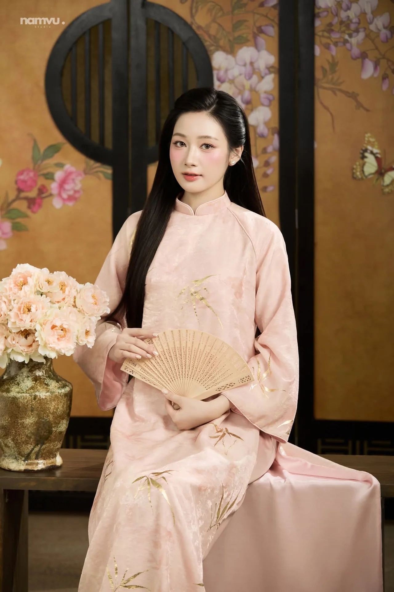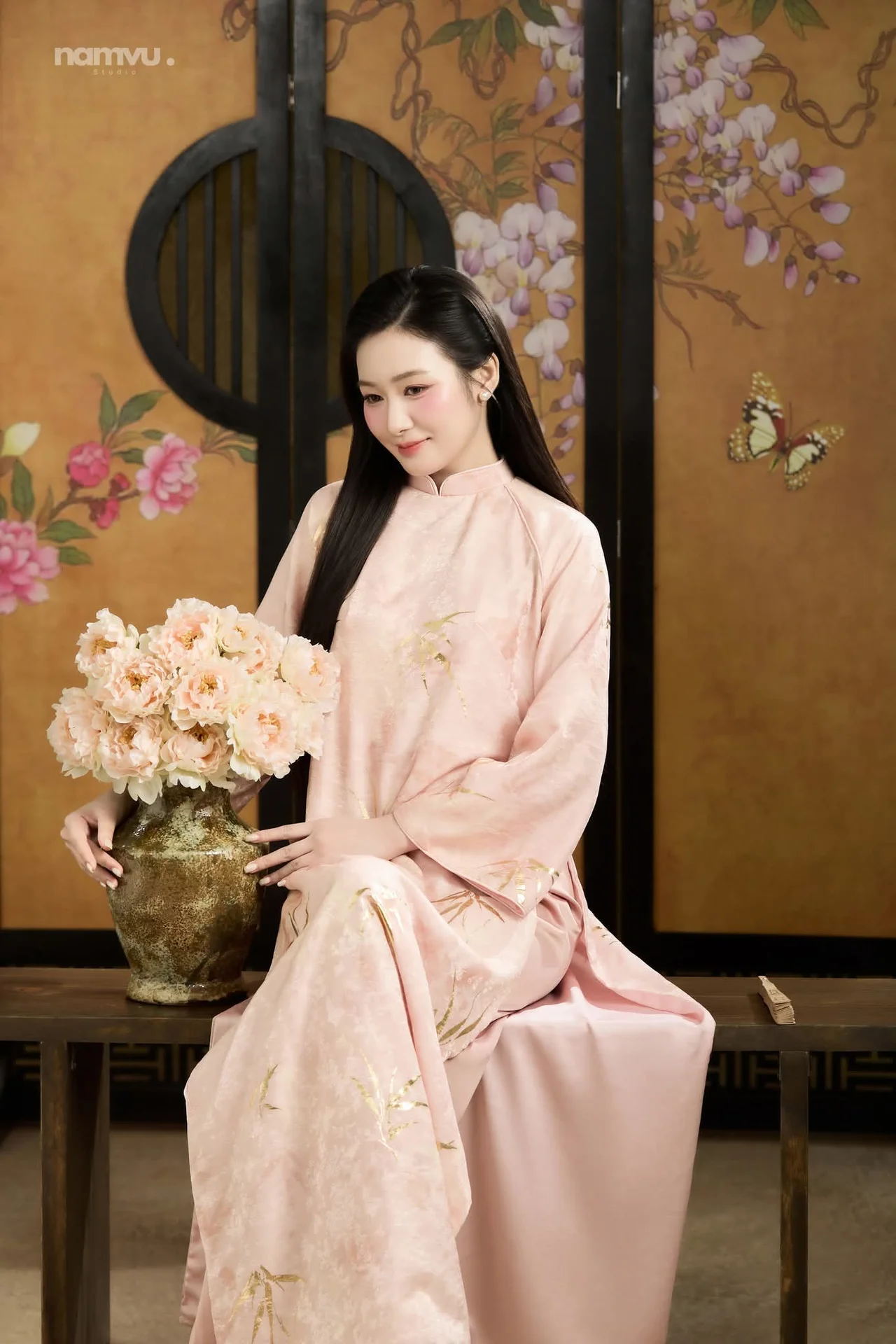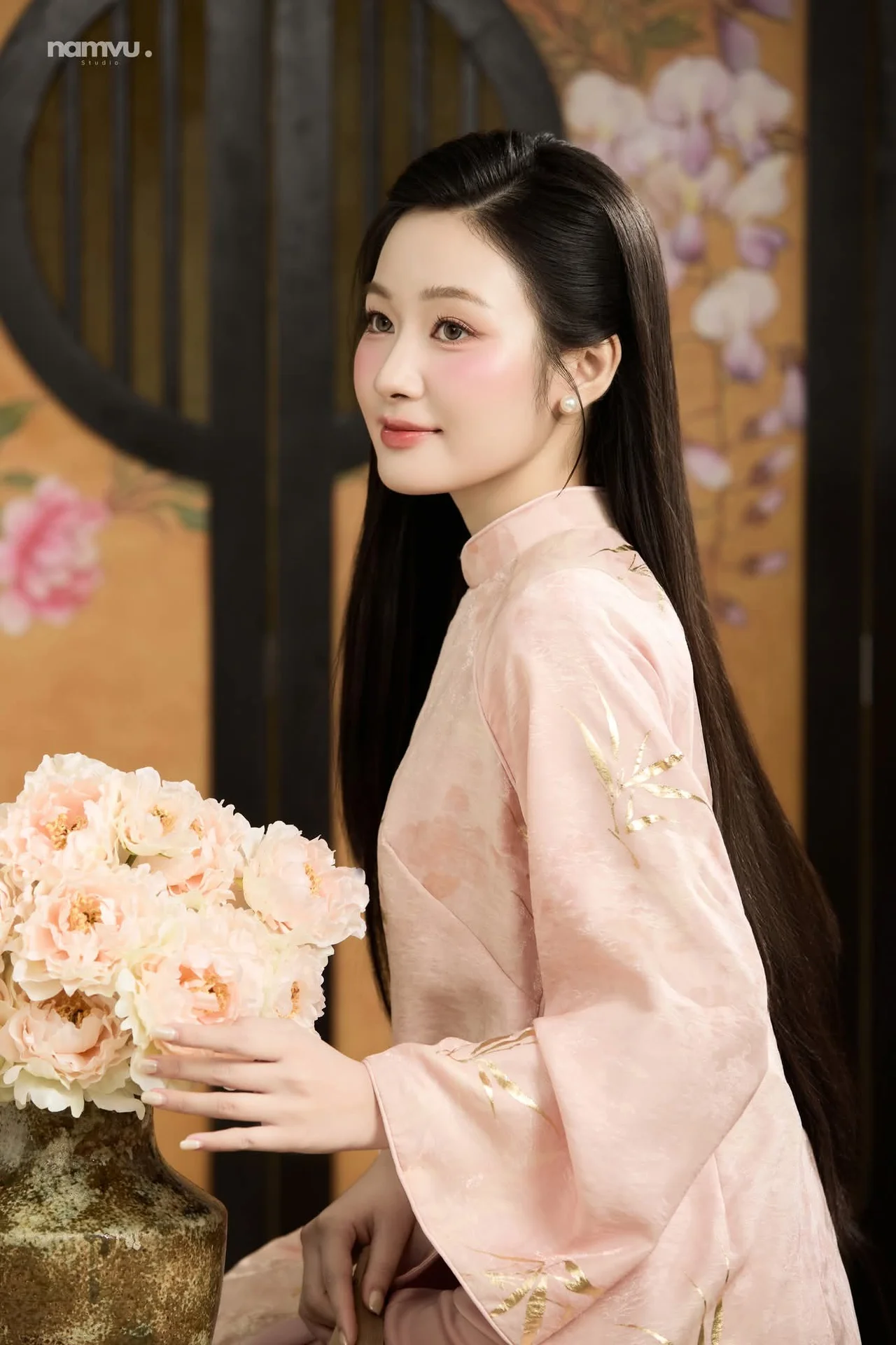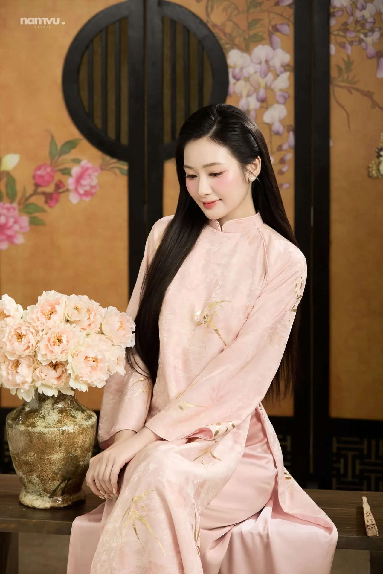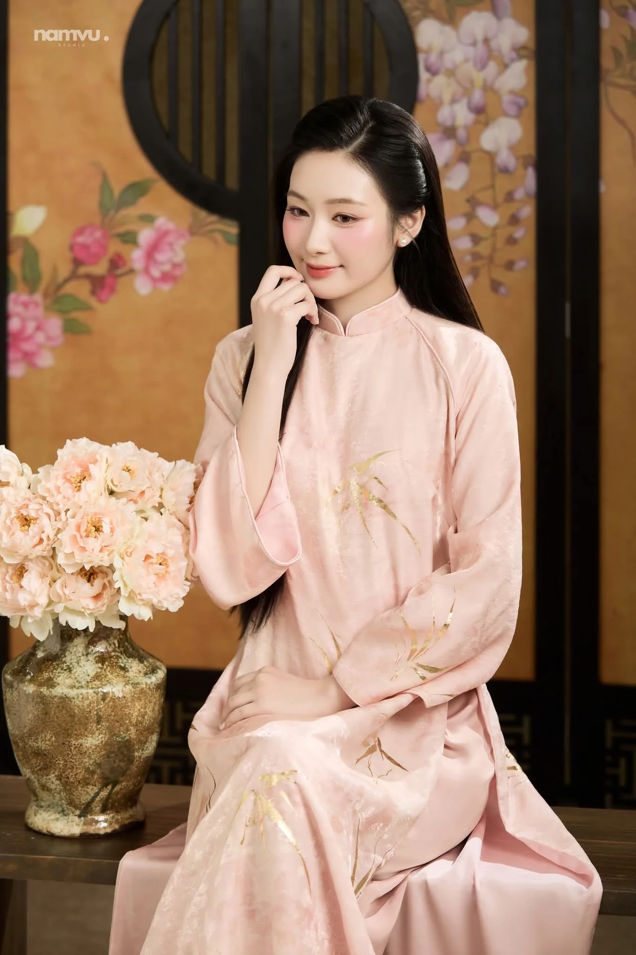 This image captures the timeless elegance of a woman dressed in a traditional Vietnamese Ao Dai, radiating a sense of poetic grace and tranquility. The soft pastel pink hue of the silk fabric beautifully complements her gentle expression and sophisticated poise. Every detail, from the delicate golden embroidery to the flowing sleeves, speaks of a refined aesthetic and a deep appreciation for cultural heritage. Set against a backdrop of traditional screens with floral motifs, the composition evokes a nostalgic Indochine vibe that is both romantic and serene. Her subtle smile and soft gaze create an intimate connection with the viewer, making her appear as a true muse of natural beauty. This visual narrative is a perfect blend of fashion and art, celebrating the minimalist yet profound charm of classic styles that never fade away, inviting us to slow down and appreciate the finer things in life.#Vietnamese #AoDai #VintageAesthetic #ElegantStyle #TravelVietnam #MuseInspiration