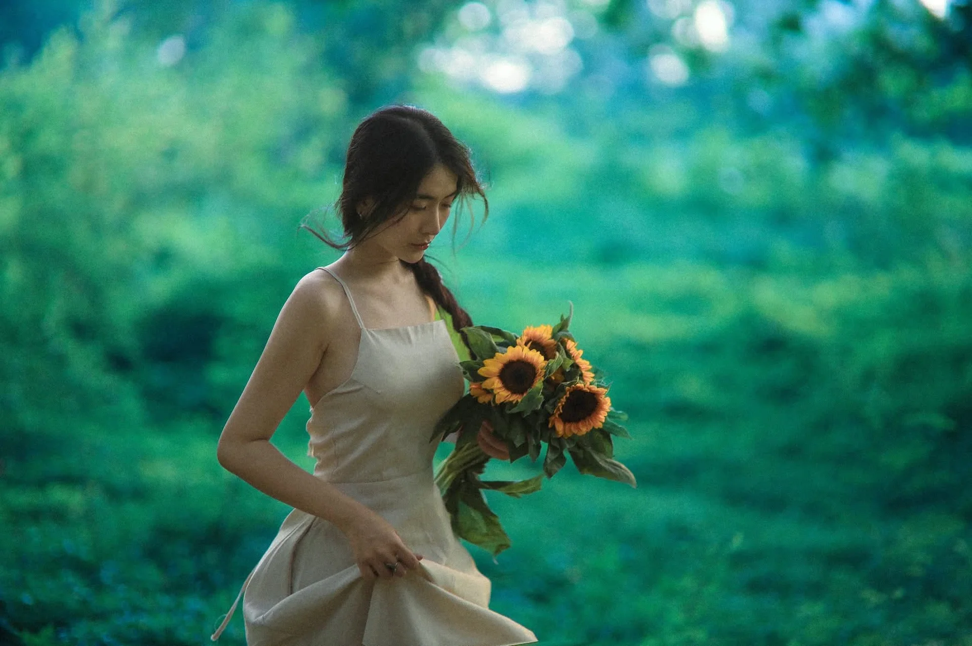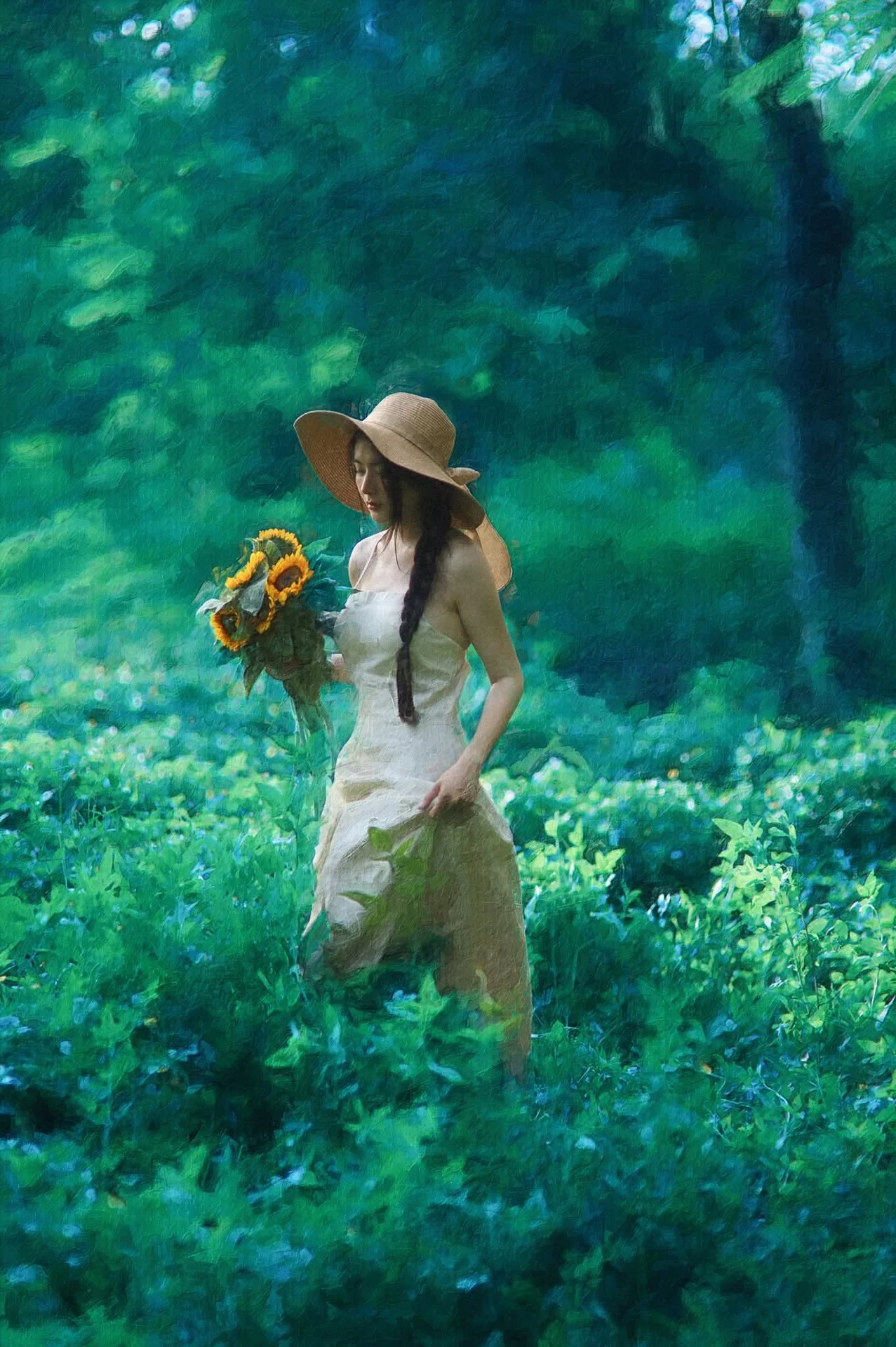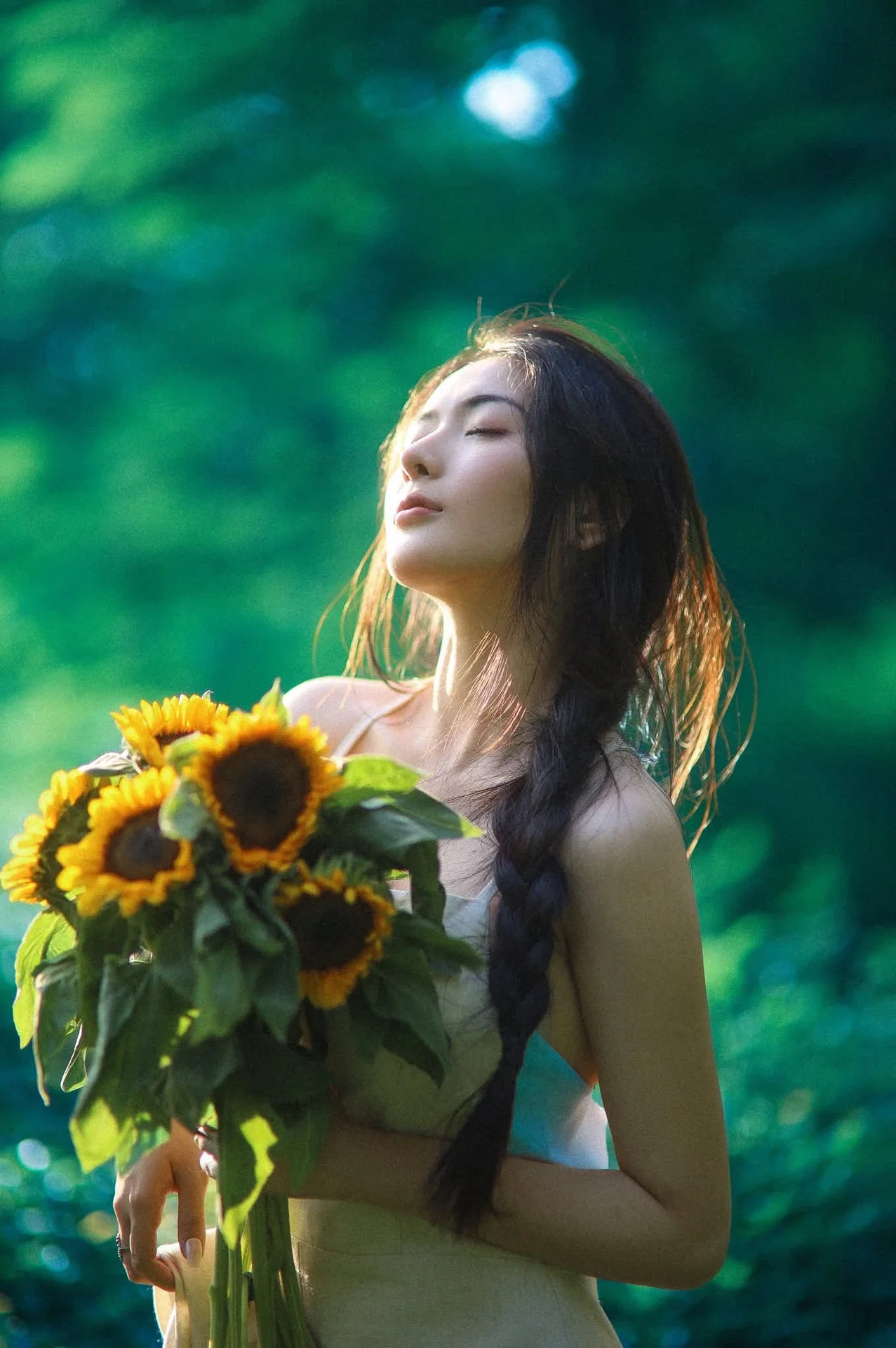 This image captures the pristine beauty of a young woman amidst a lush green natural setting Radiant golden sunlight illuminates her long braided hair and gentle face creating a moment of pure tranquility She embodies a harmonious connection with nature deeply immersed in a peaceful state Like a vibrant sunflower the maiden exudes vitality and the fresh essence of summer The photograph conveys a sense of calm and unadorned natural beauty It is a precious moment recalling serenity rustic charm and a profound bond with the surrounding natural world#NaturalBeauty #GoldenHour #BraidedHair #NatureGirl #SummerVibes