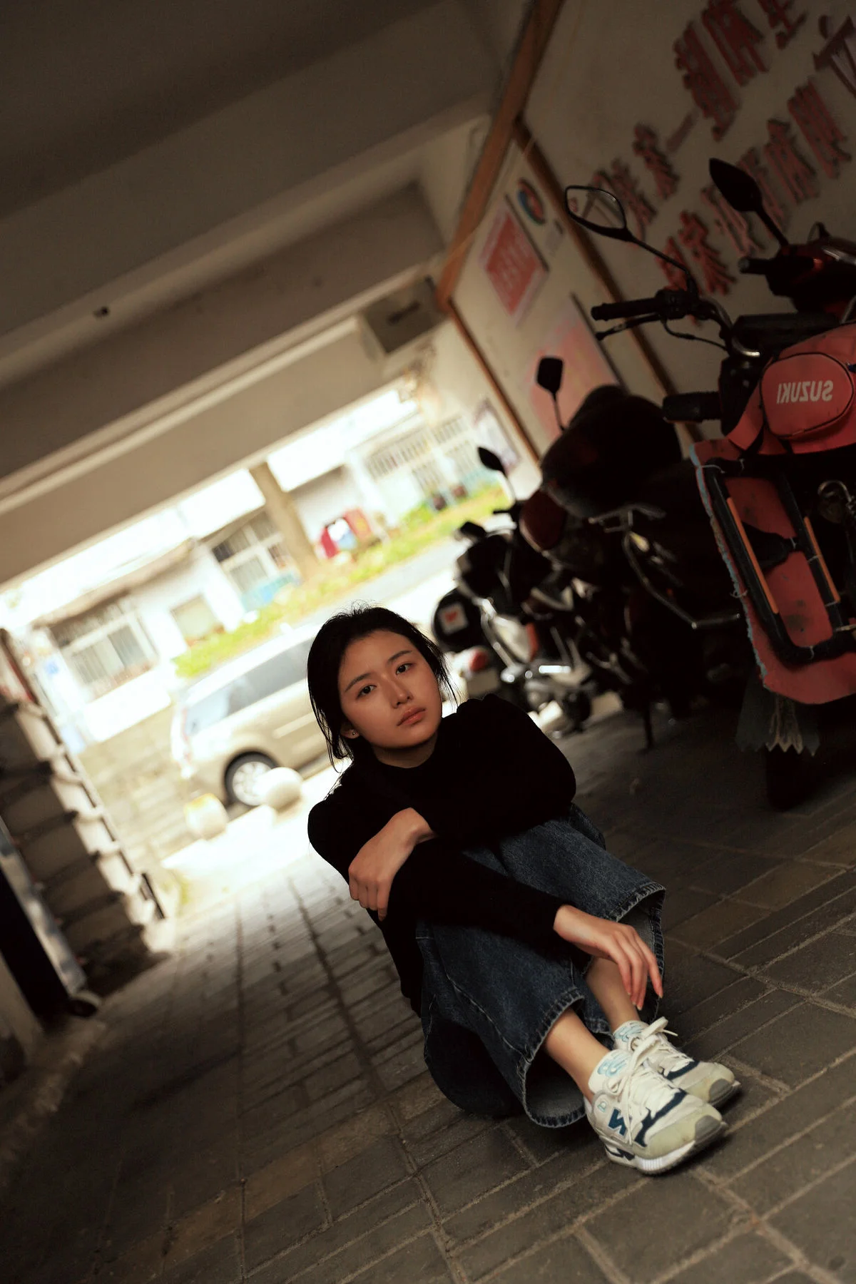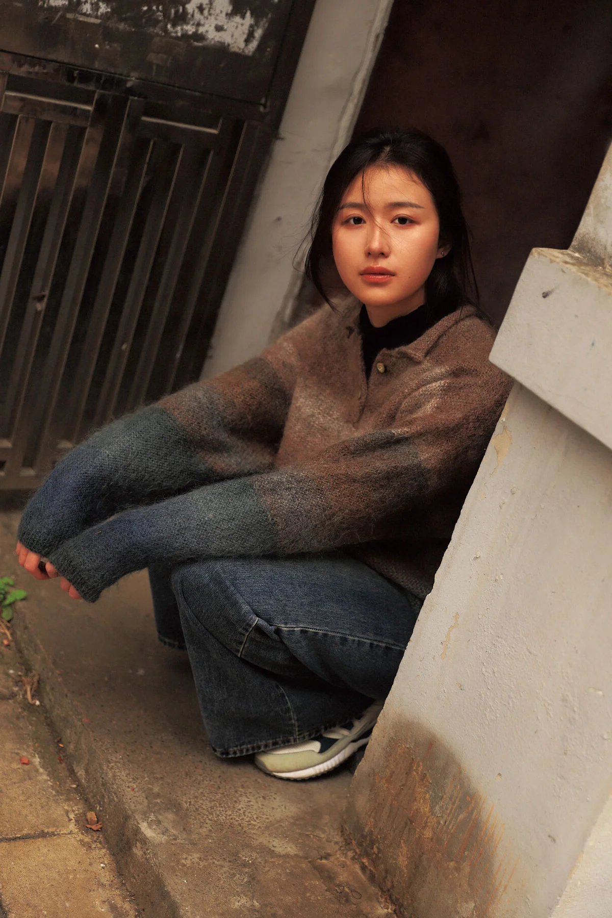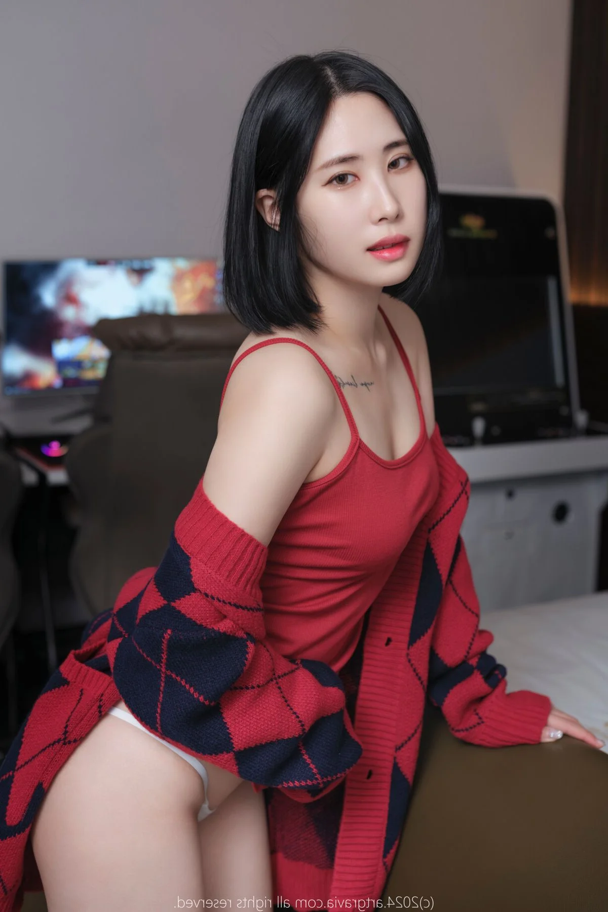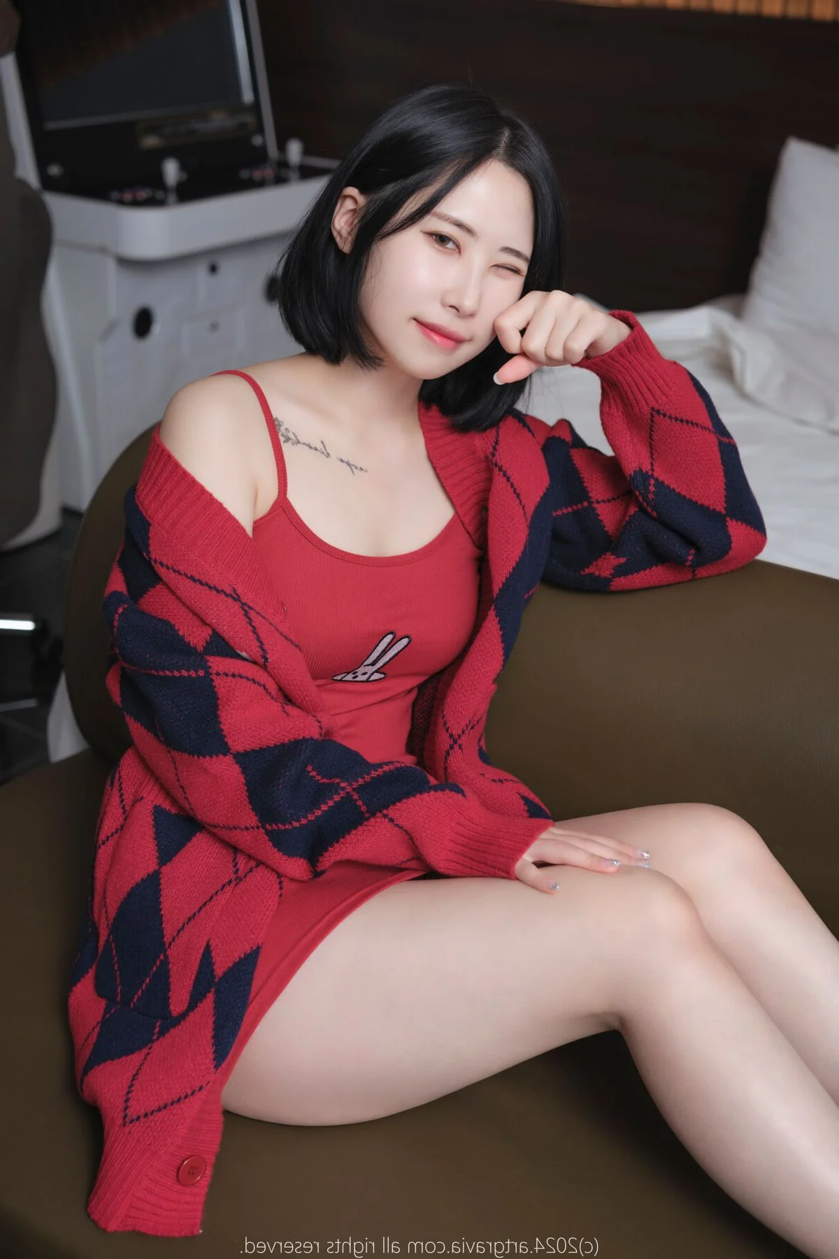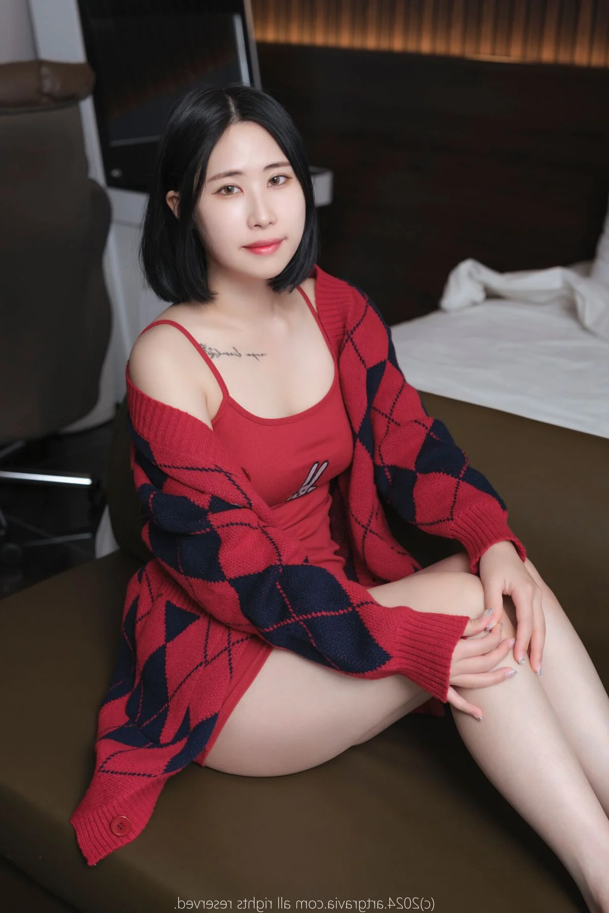This image captures a warm and intimate atmosphere reminiscent of a peaceful afternoon spent in a personal sanctuary. Model Jian exudes a gentle charm with her soft gaze and subtle smile creating an effortless connection with the viewer. Her fashion choice perfectly balances sensuality and comfort featuring a vibrant red dress paired with a classic navy and red argyle cardigan. The heavy knit texture of the cardigan contrasts beautifully with the delicate fabric underneath while the off the shoulder styling adds a touch of modern elegance and relaxed sophistication. The dominant red palette enhances her radiant complexion making the entire composition feel alive yet soothing. It is a masterful display of minimalist aesthetic and artistic vibe where every detail from the lighting to the pose contributes to a sense of tranquil beauty and refined style.#CozyVibes #FashionInspiration #NaturalBeauty #ArtisticPortrait #JianStyle
