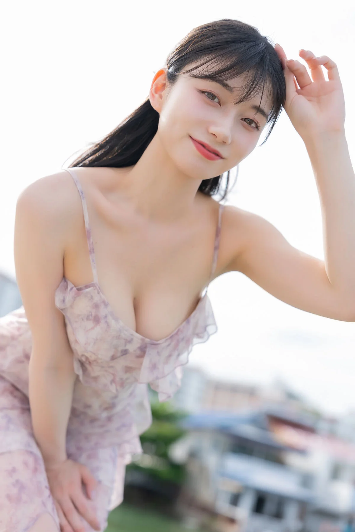 This captivating shot captures Kanna Seto in a moment of pure, poetic grace under the soft glow of a peaceful afternoon. With a gentle smile and clear, soulful eyes, she radiates a serene energy that is both inviting and deeply artistic. Her choice of a delicate floral sundress with ruffled details perfectly embodies the romantic Cottagecore aesthetic, celebrating a timeless femininity. The light, airy fabric in muted pastel tones harmonizes beautifully with the soft-focus cityscape in the background, creating a dreamy high-key atmosphere. It is a masterclass in minimalist yet sophisticated styling, where her natural charisma takes center stage against the quiet backdrop of a Japanese town. Every detail, from the simple ponytail to her effortless posture, speaks of youthful elegance and a lifestyle that cherishes the beauty of simplicity and light, evoking a sense of nostalgic summer days.#KannaSeto #NaturalBeauty #SummerFashion #JapaneseModel #DreamyVibes
