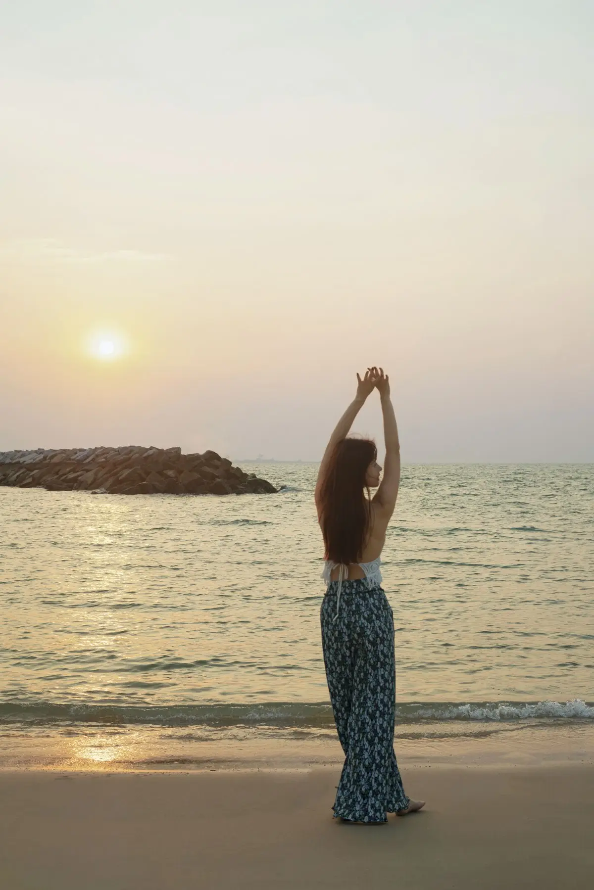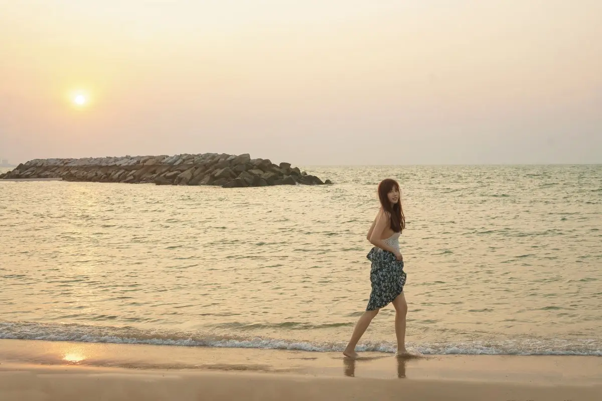 Golden Hour Serenity: Young Woman's Graceful Beach Walk