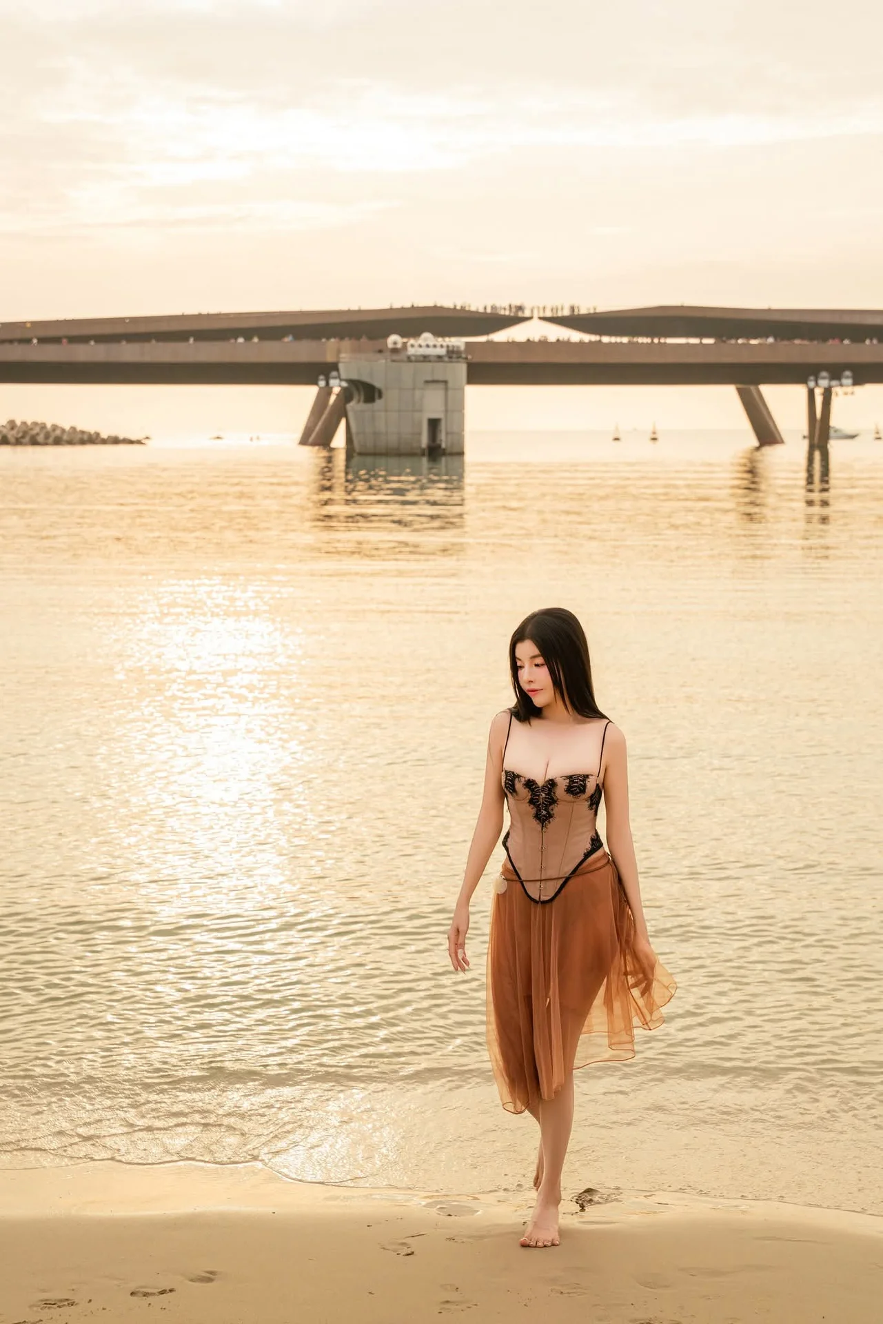 This stunning photograph captures a serene moment of a young woman with flowing long hair gracefully strolling along the beach at sunset. The radiant golden sunlight from the setting sun reflects shimmering on the water's surface, creating an ethereal and romantic scene. Dressed in light attire, her bare feet touching the cool water evoke a sense of tranquility and indescribable peace. Her natural beauty blends harmoniously with the romantic sunset landscape, presenting an image full of emotion and tenderness. This picture embodies serenity, feminine charm, and a wonderful moment of enjoying nature.#SunsetBeach #GoldenHour #NaturalBeauty #SereneMoments #BeachWalk