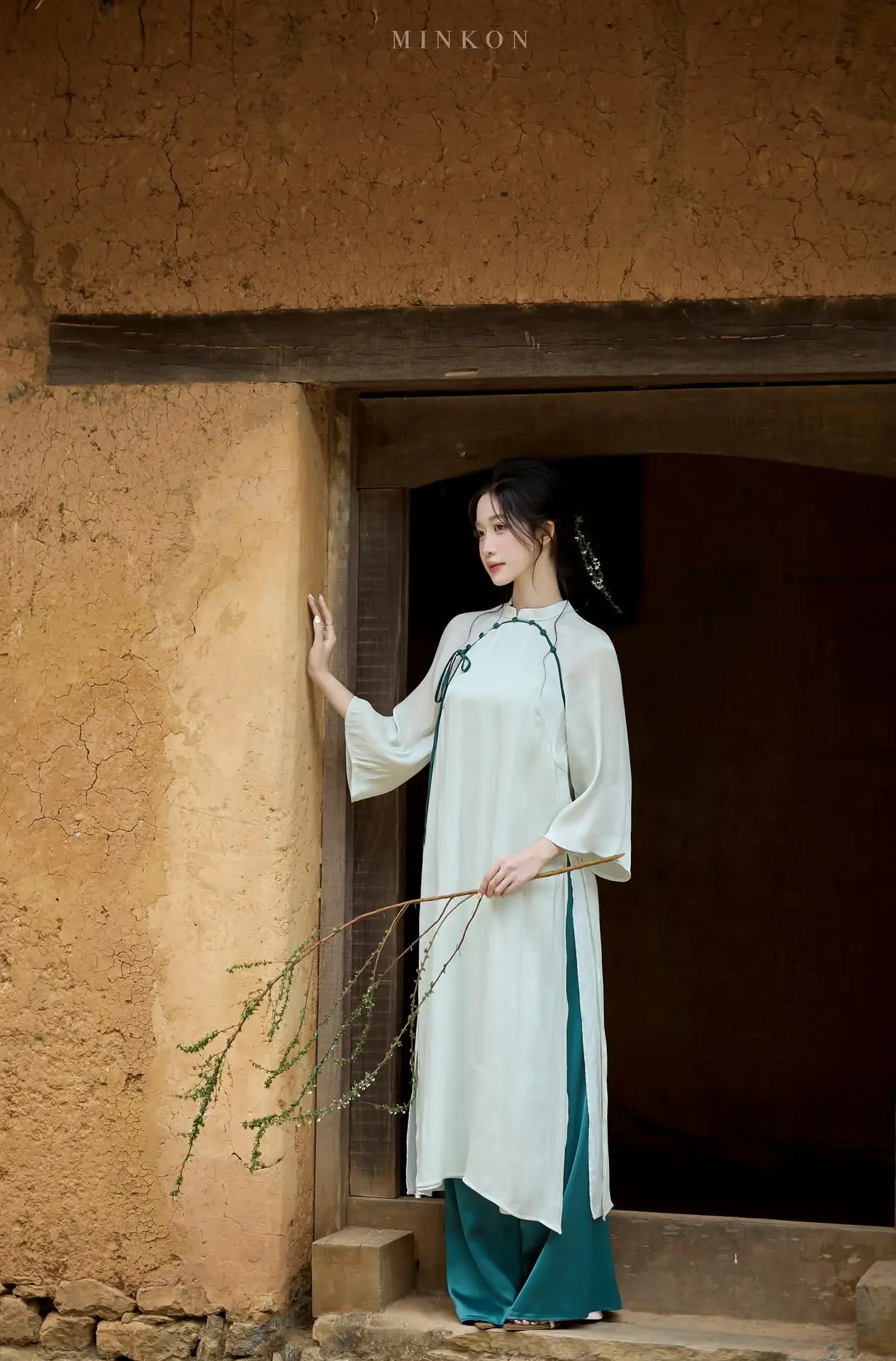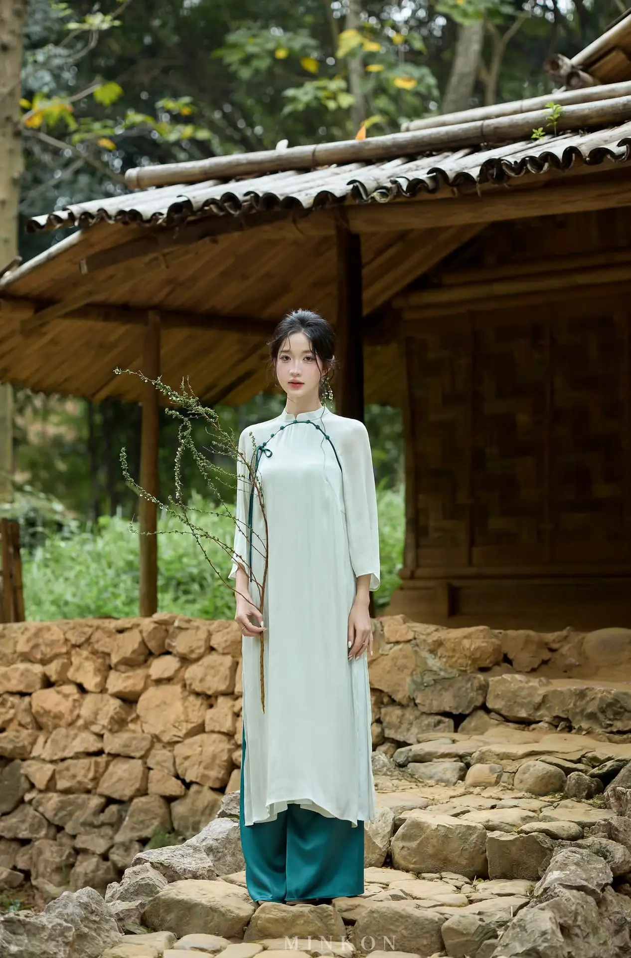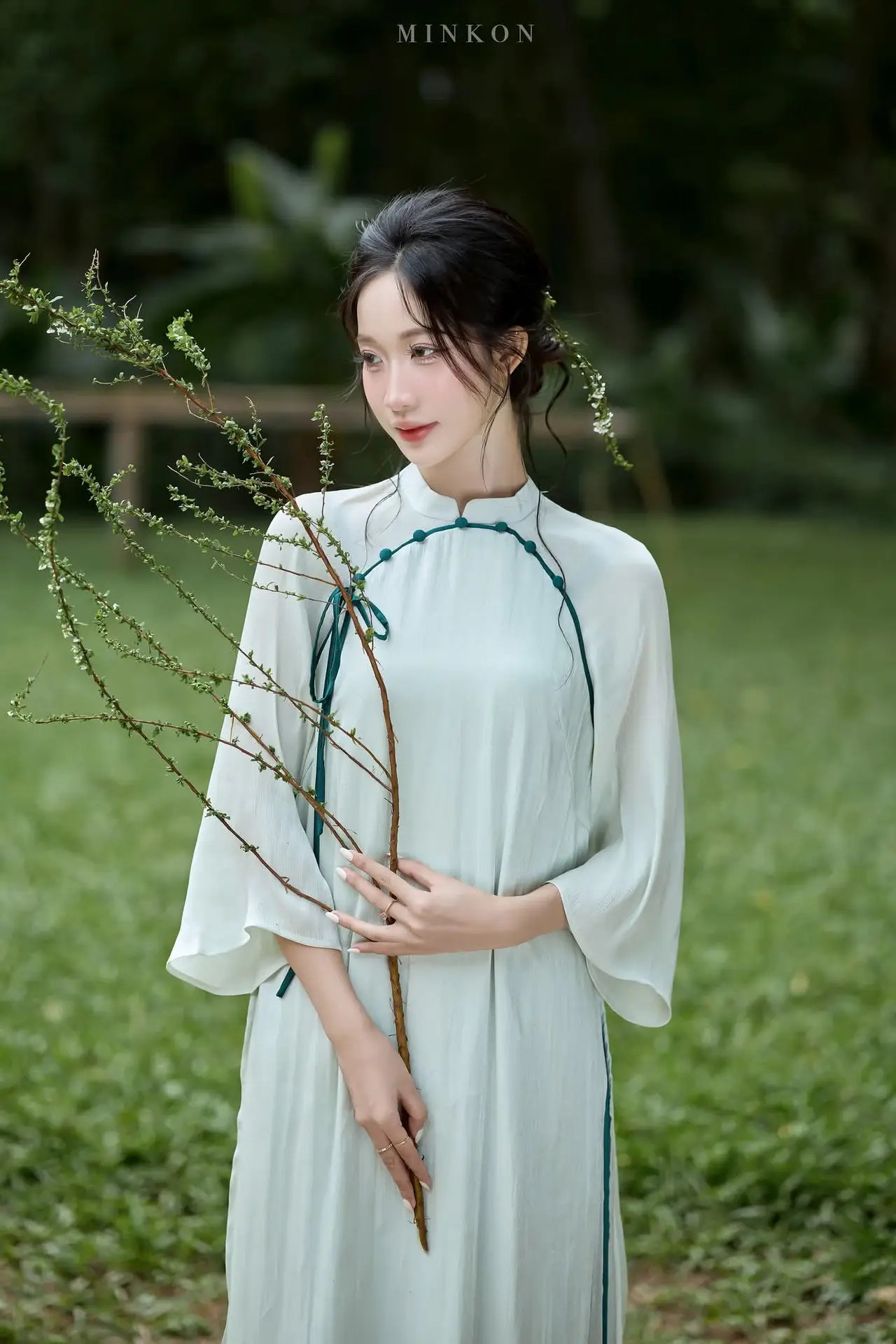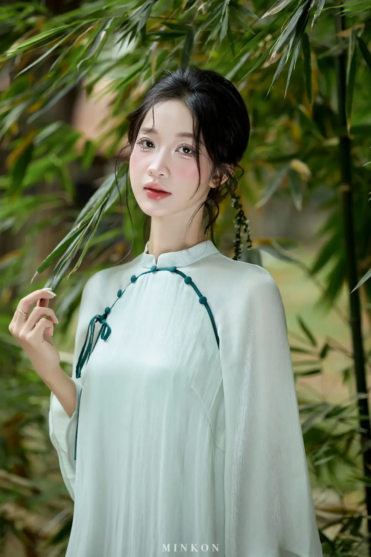 This image beautifully captures the gentle, elegant beauty of a Vietnamese young woman. With her silky black hair and naturally made-up face, she exudes an alluring East Asian charm. Her ivory high-collared top, adorned with delicate blue accents, subtly hints at traditional attire, emphasizing her refined and demure grace. The lush green natural backdrop, featuring branches adorned with sparkling dew drops, further highlights her freshness and purity. Her clear eyes and subtle smile convey a sense of serenity, creating an emotionally rich and poetic portrait, akin to an ode to pristine beauty amidst nature.#VietnameseBeauty #ElegantPortrait #NaturalBeauty #AsianGrace #NatureInspired #AoDai