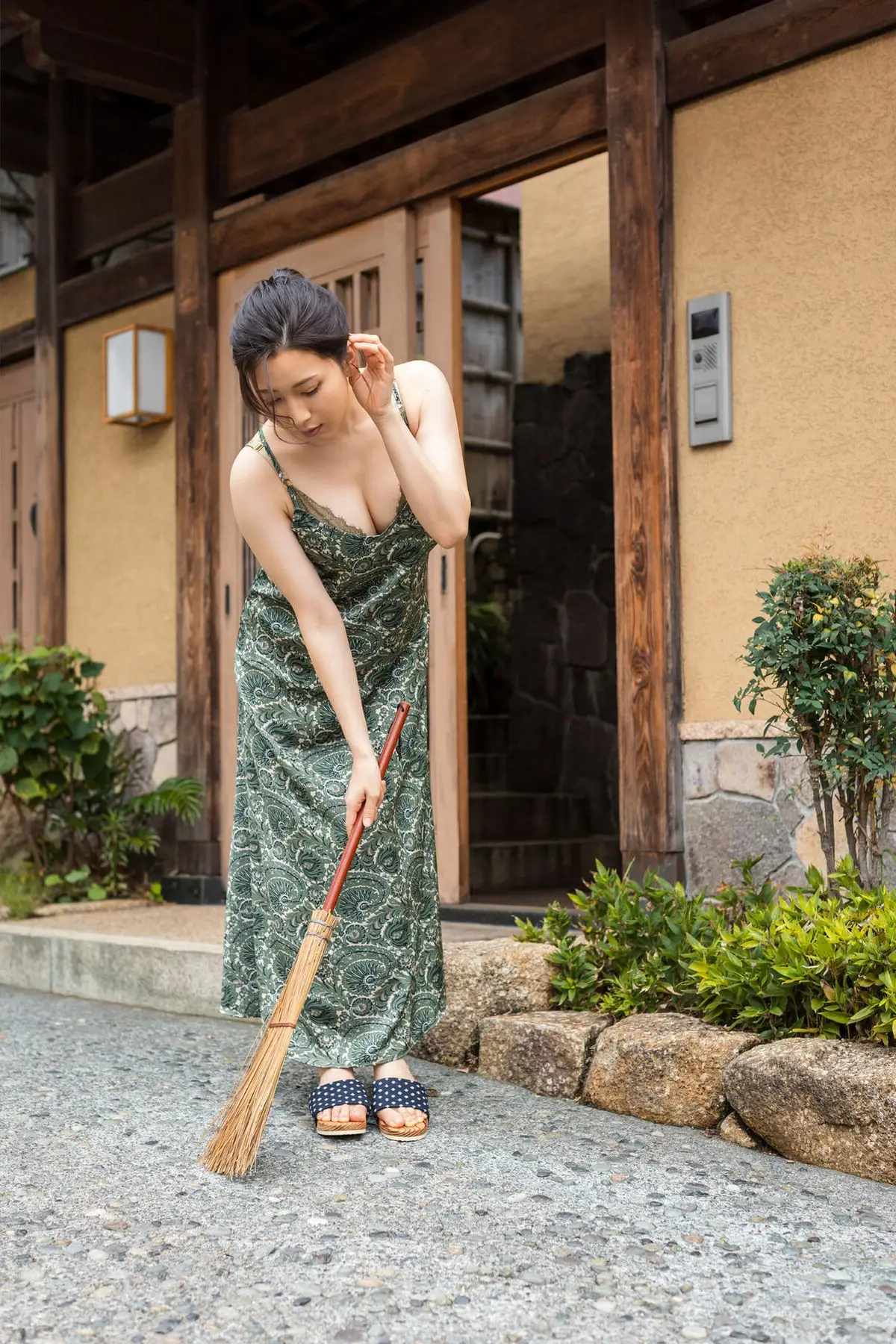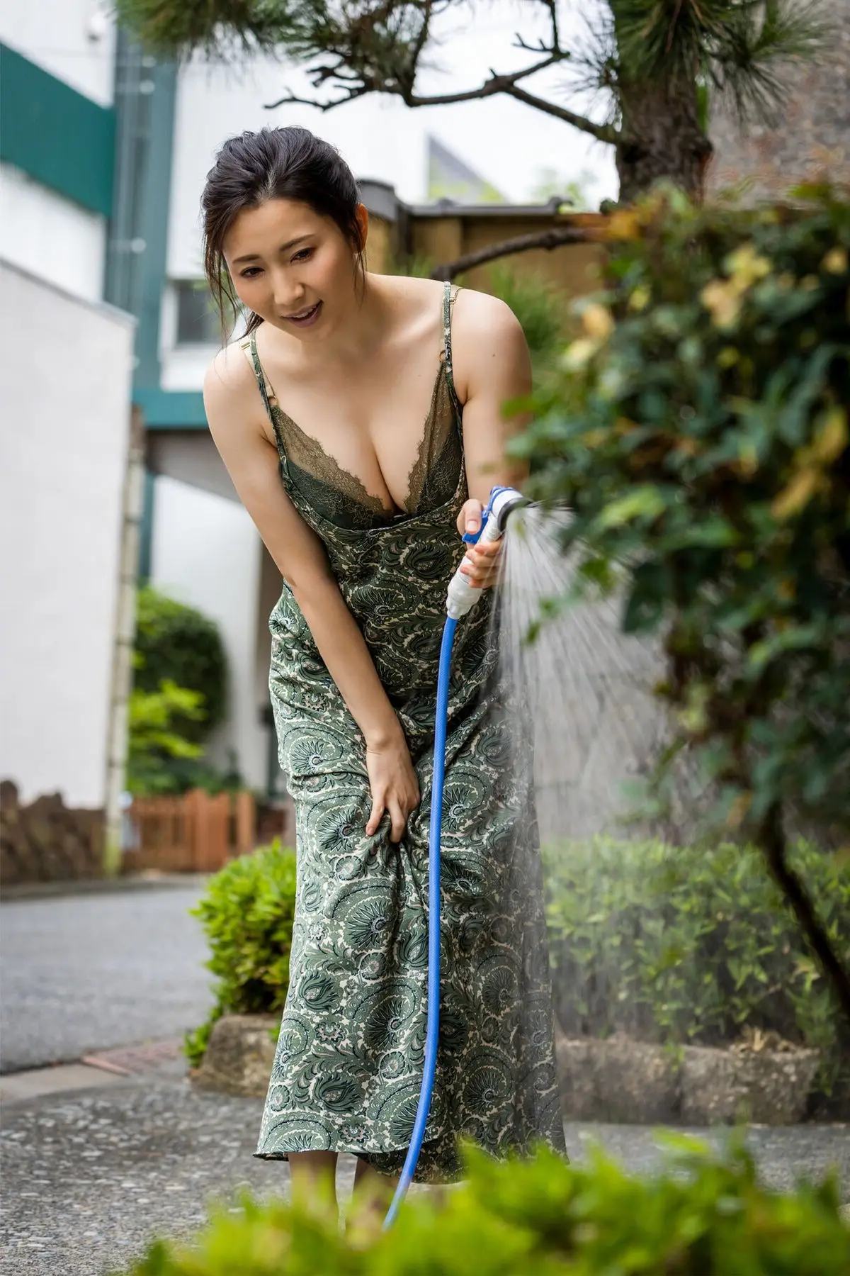 In this captivating image, Machiyama Miho appears gracefully radiant, embodying the essence of a summer muse. She wears a delicate long floral dress, adorned with soothing green and pink patterns, highlighting her natural and elegant beauty. Machiyama Miho's bright smile and sparkling eyes draw every gaze, exuding purity and joy. Leaning gently against a wooden post, she poses naturally amidst the lush green outdoor setting, evoking a sense of peace and tranquility. The backdrop of a house with a red roof and vibrant greenery further enhances her rustic, approachable charm. This moment captures Machiyama Miho's gentle and captivating allure, a beautiful image that enchants the heart, bringing forth feelings of serenity and freshness.#MachiyamaMiho #FloralDress #NaturalBeauty #JapaneseModel #SummerFashion