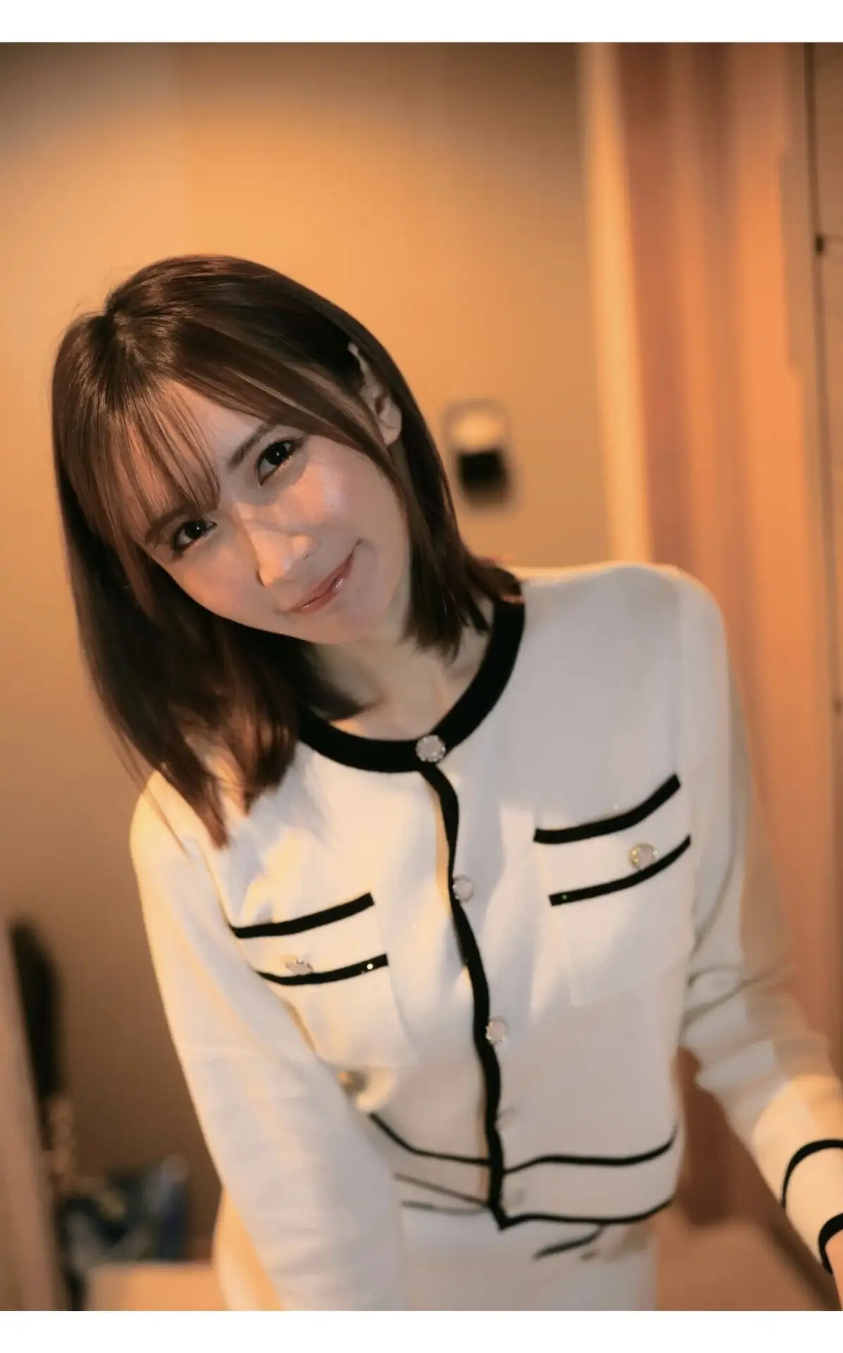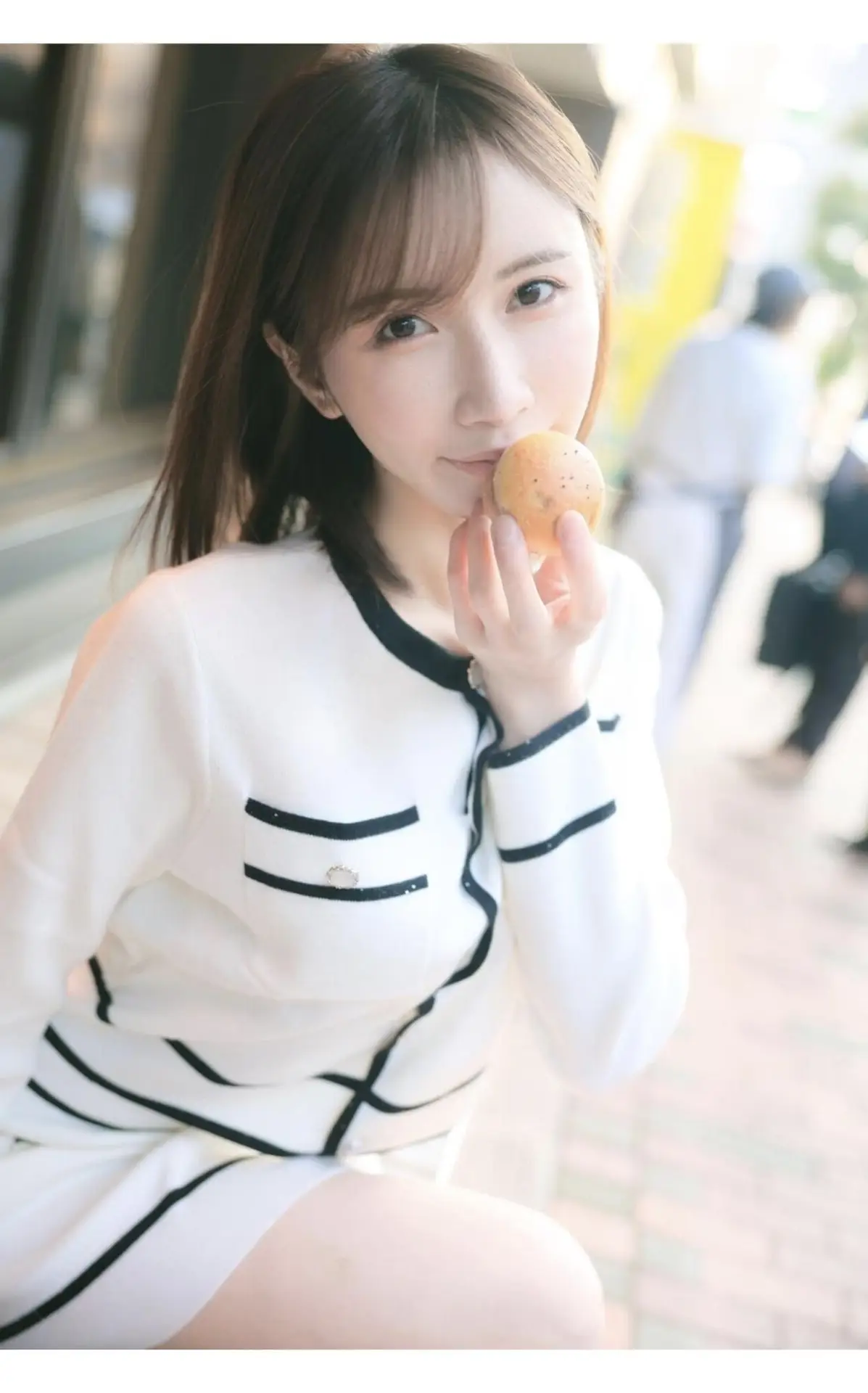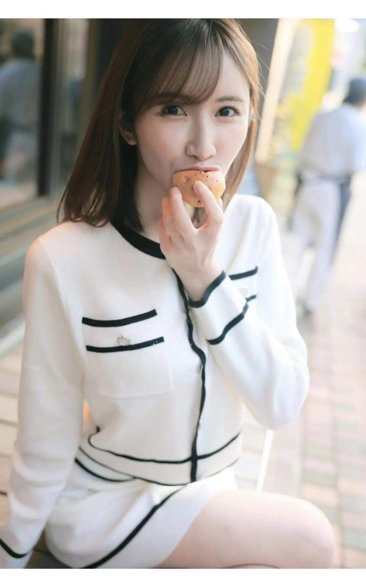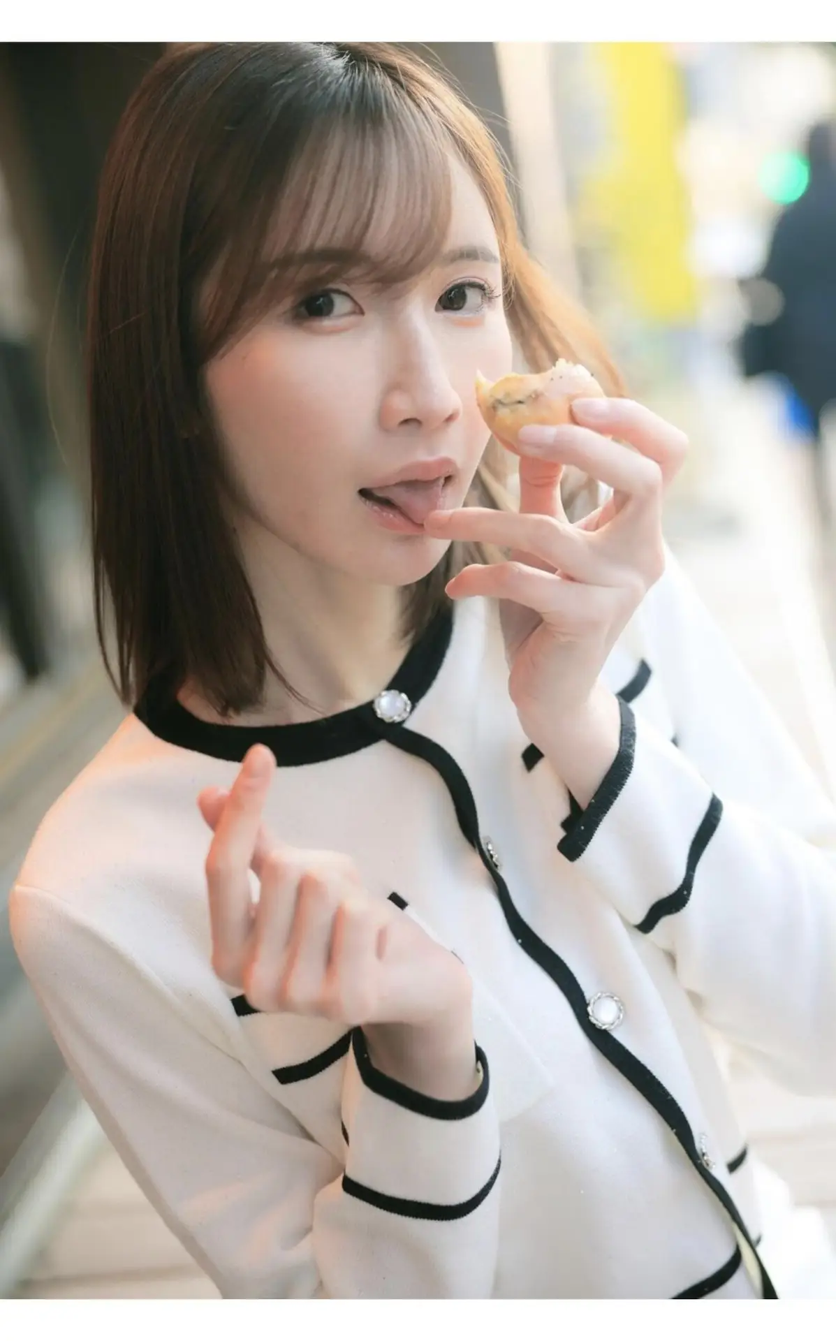 This image captures a delightful moment with Sora Amakawa, a Japanese model known for her natural beauty and engaging presence. Dressed in an elegant white cardigan with black trim, she enjoys a small snack, perhaps a delicate pastry, with a playful expression and expressive eyes directed at the viewer. Her smooth dark hair and gentle smile highlight her graceful and approachable demeanor. The picture exudes sweetness, youthful charm, and a hint of allure, inviting viewers to discover more about her style and personality. It's a glimpse into an effortless attractiveness, simply showcasing an everyday moment filled with captivating appeal.#SoraAmakawa #JapaneseModel #NaturalBeauty #EverydayCharm #PlayfulMoments