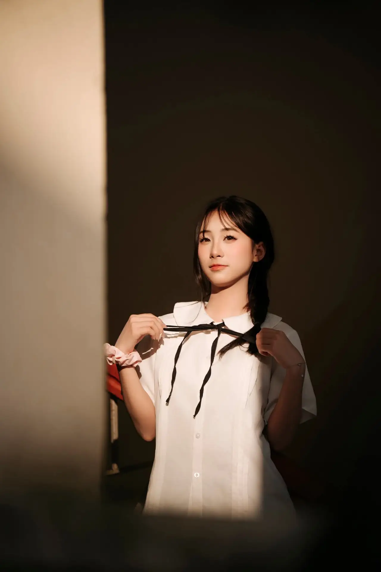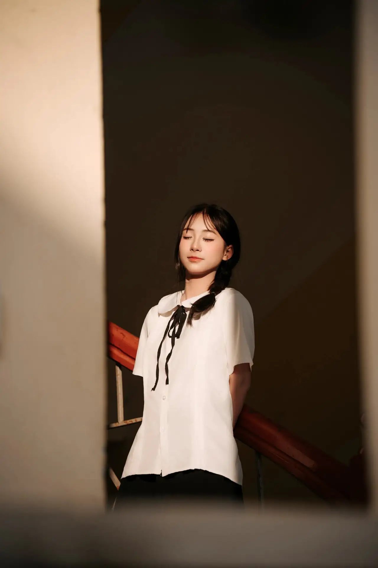 This photograph captures a poetic moment of a young woman exuding gentle and pure beauty. Warm golden sunlight delicately illuminates the delicate features on her face, creating a stunning light effect reminiscent of a sunset. With neatly braided hair and a pristine white shirt, the girl presents an elegant image with a touch of innocence. This is not just a simple portrait but also a story of serenity natural beauty and subtle emotions drawing viewers into a dreamy space. This image will surely captivate those who appreciate pure beauty and tranquil moments.#youngwoman #portraitphotography #naturallight #asianbeauty #gentleportrait #JKUniform #JK #Student