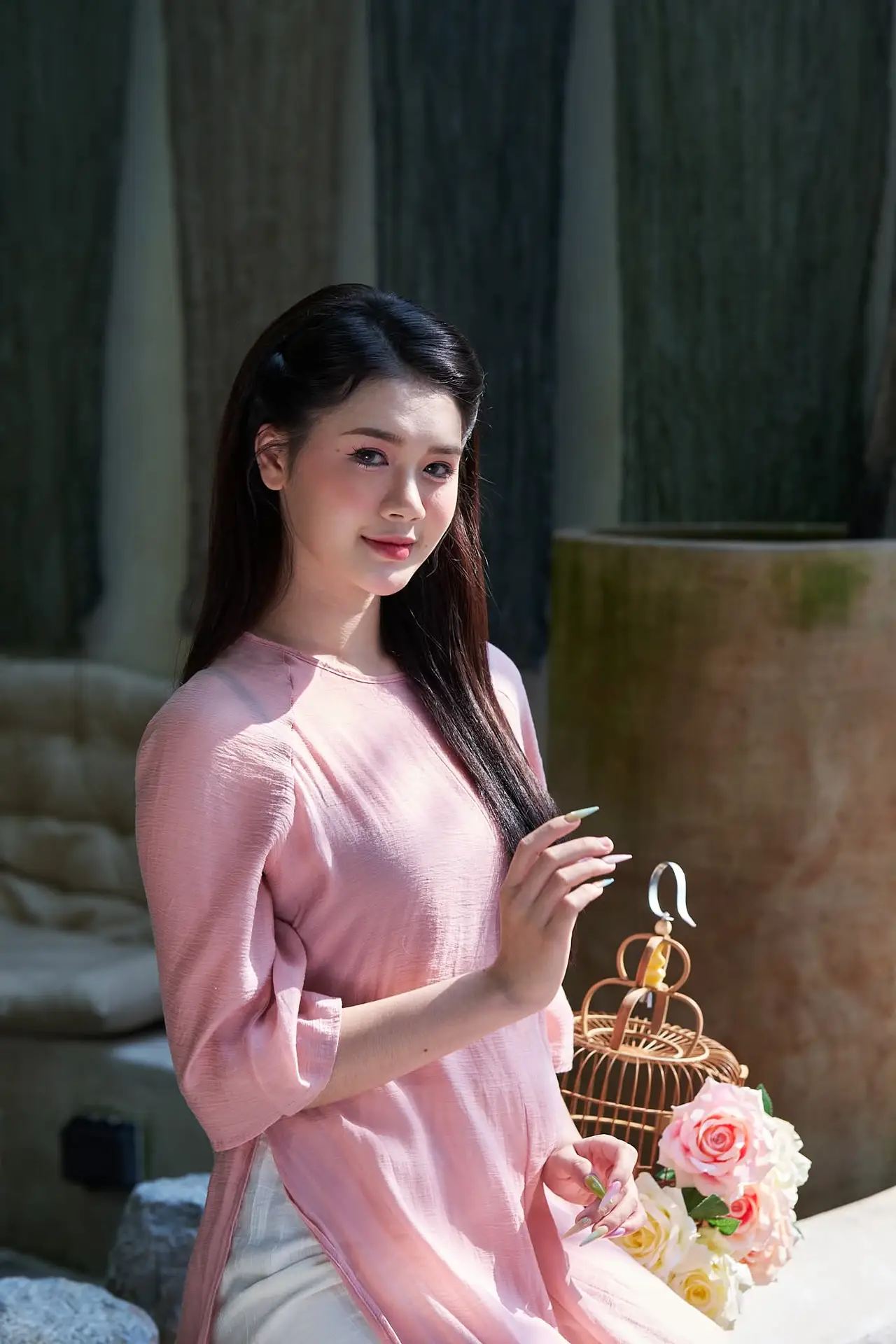 This stunning photograph beautifully captures the elegant Vietnamese beauty through the image of a young woman. With a gentle smile and a dreamy gaze, she leans by a rustic wooden window frame, fully embracing the natural light pouring in. Her soft pastel pink attire further enhances her graceful and delicate charm. The harmonious blend of the peaceful setting, vibrant flowers, and the pure beauty of the young lady creates a poetic and emotional moment. This is not just a portrait but also a story of serenity and subtle sophistication in the soul of a Vietnamese girl.#VietnameseBeauty #GracefulGirl #NaturalLight #Elegance #VietnameseStyle #AoDai