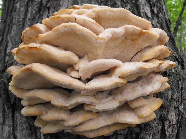 #ChickenOfTheWoods , #WildMushroomForaging , #LaetiporusSulphureus , #ForestTreasures , #VeganMeatSubstitute , #NaturePhotography , #EdibleFungi , #MushroomHunting