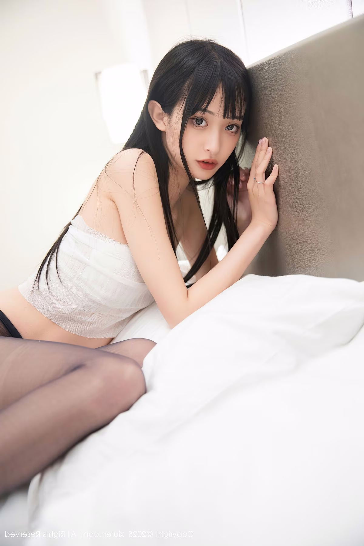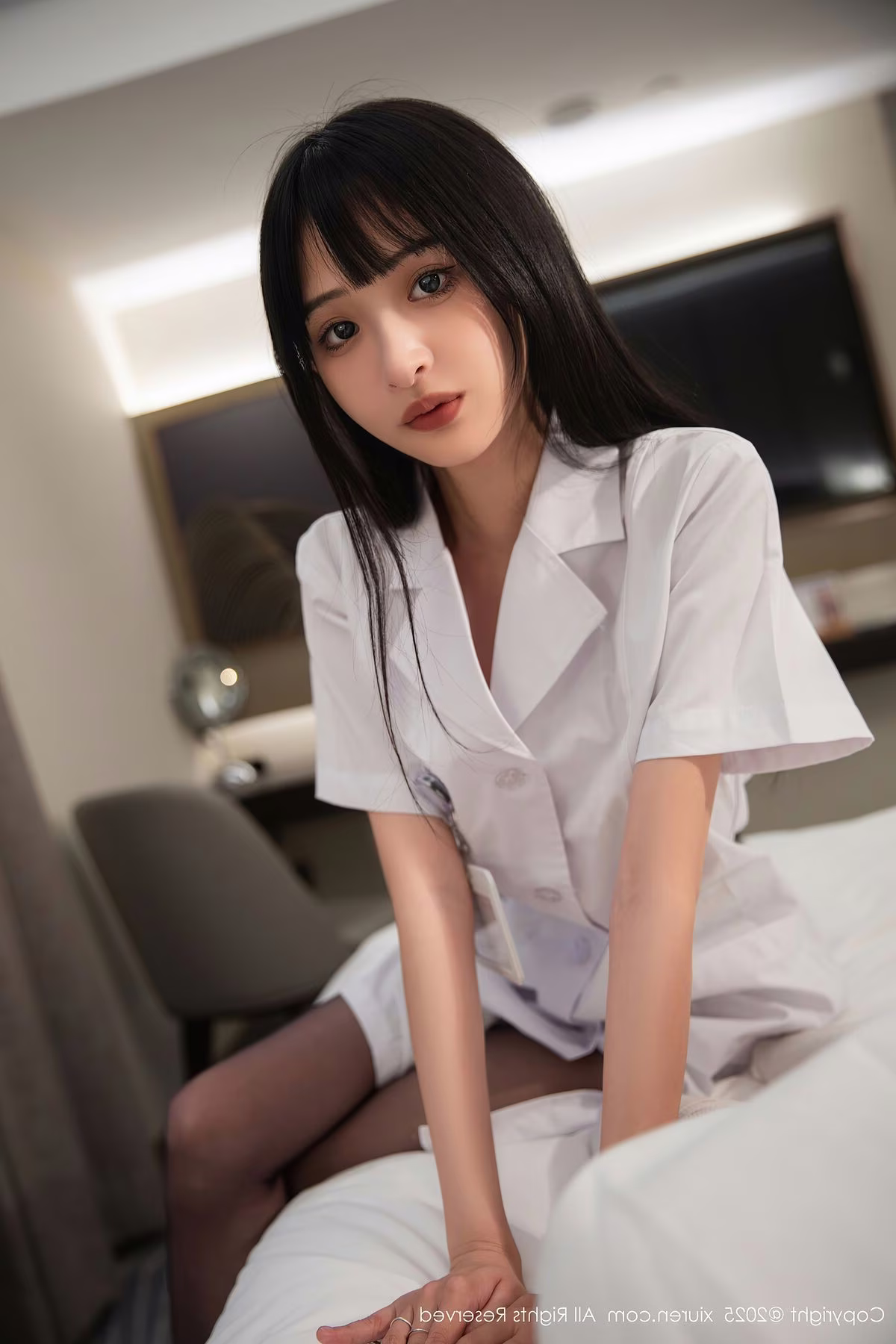 This captivating image features model Kiko Mogi, radiating a delicate yet mesmerizing charm. She is gracefully seated on a bed, adorned in a pristine white uniform that subtly evokes the classic appeal of a nurse or medical professional. Her long, dark hair beautifully frames a refined face, while her direct gaze creates an immediate, engaging connection with the viewer. This particular photograph, part of the XiuRen No.10373 collection, masterfully highlights her elegant posture and the refined allure of her attire. The soft ambient lighting within the room cultivates an intimate and inviting atmosphere, perfectly accentuating Kiko Mogi's natural charisma and expressive artistry.