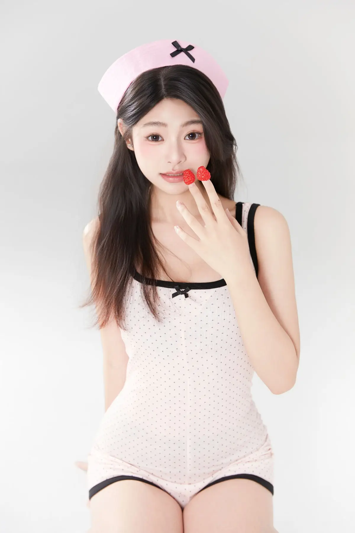 Immerse yourself in the YiTuYu Vol.8629 collection, where model A Dan shines with her sweet and captivating beauty. In this enchanting photograph, A Dan appears in a graceful light pink nurse outfit, complemented by a matching nurse cap, creating an image that is both innocent and alluring. Her gentle smile and sparkling eyes seem to tell a story, drawing every gaze. The relaxed sitting pose, with one hand delicately touching her cheek, further highlights her lovely charm and approachable demeanor. The minimalist studio background ensures A Dan remains the focal point, underscoring the refined artistic style characteristic of YiTuYu.