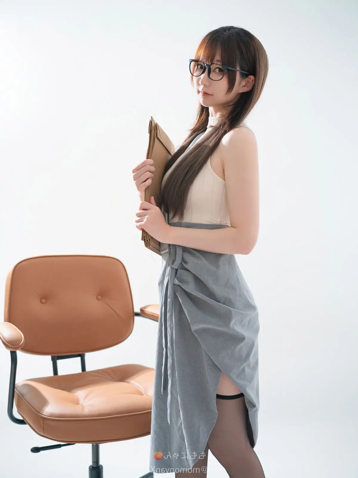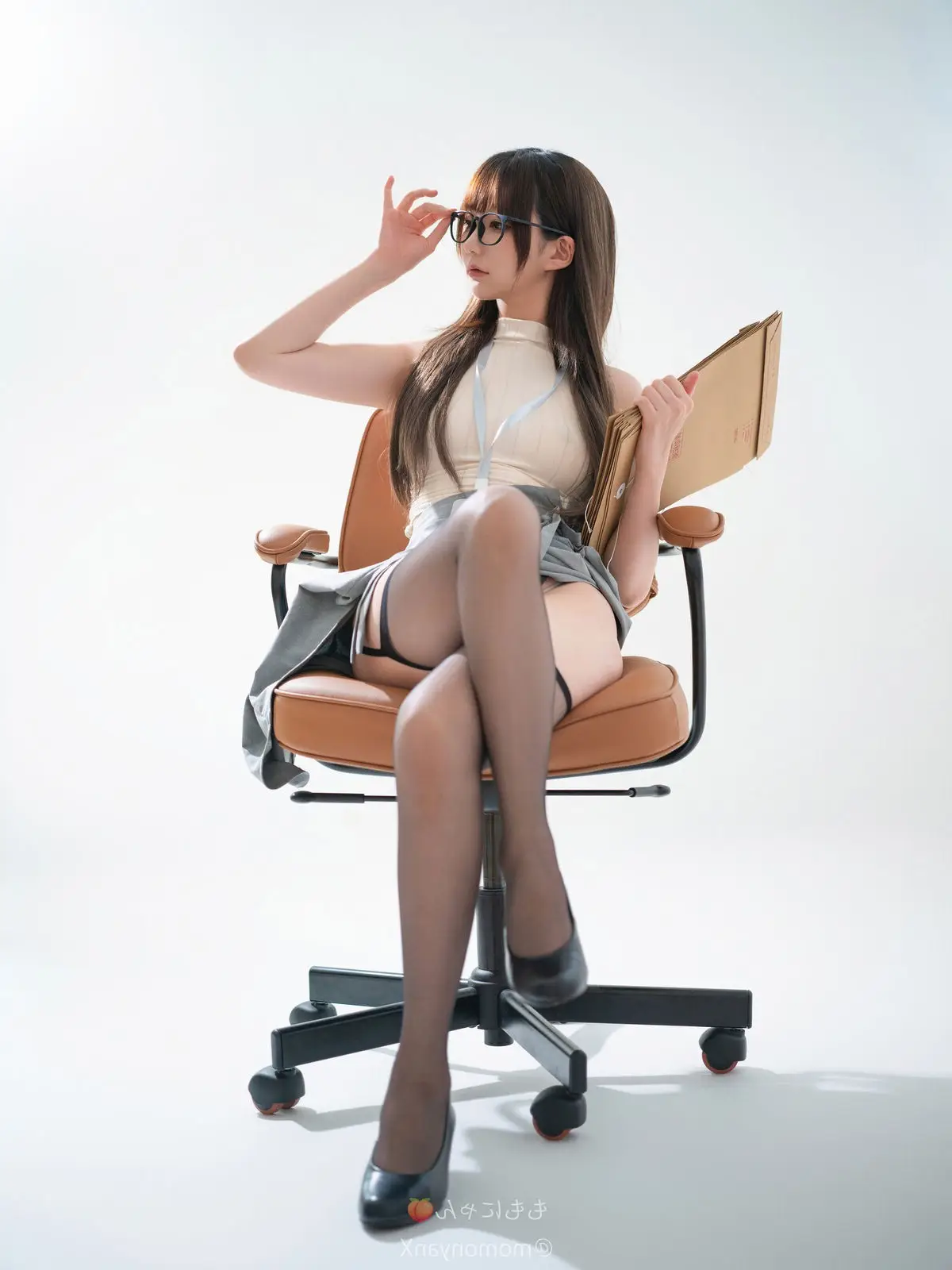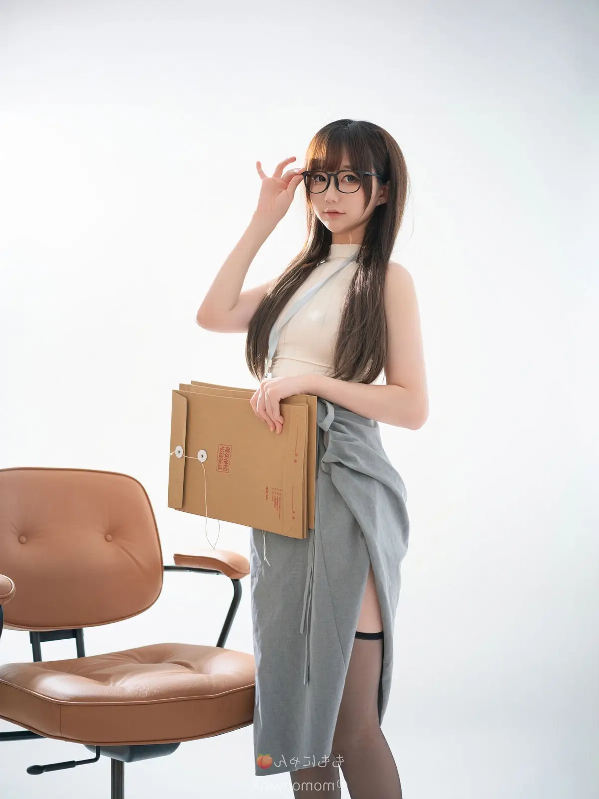 Dive into the captivating charm of Coser NAGISA魔物喵 as she transforms into an alluring and professional office lady in this stunning photoshoot. Elegantly posed on an office chair, she gracefully showcases her slender legs adorned with seductive black stockings and sophisticated high heels. Her pleated mini-skirt and form-fitting white top accentuate her perfect physique. Her keen gaze through stylish glasses, coupled with a gentle touch to the frames, exudes intelligence, confidence, and a hint of mystery. This ensemble perfectly blends professional office chic with an irresistible allure. This Part02 collection promises an impressive visual experience, highlighting NAGISA魔物喵's versatile transformation abilities and captivating presence.