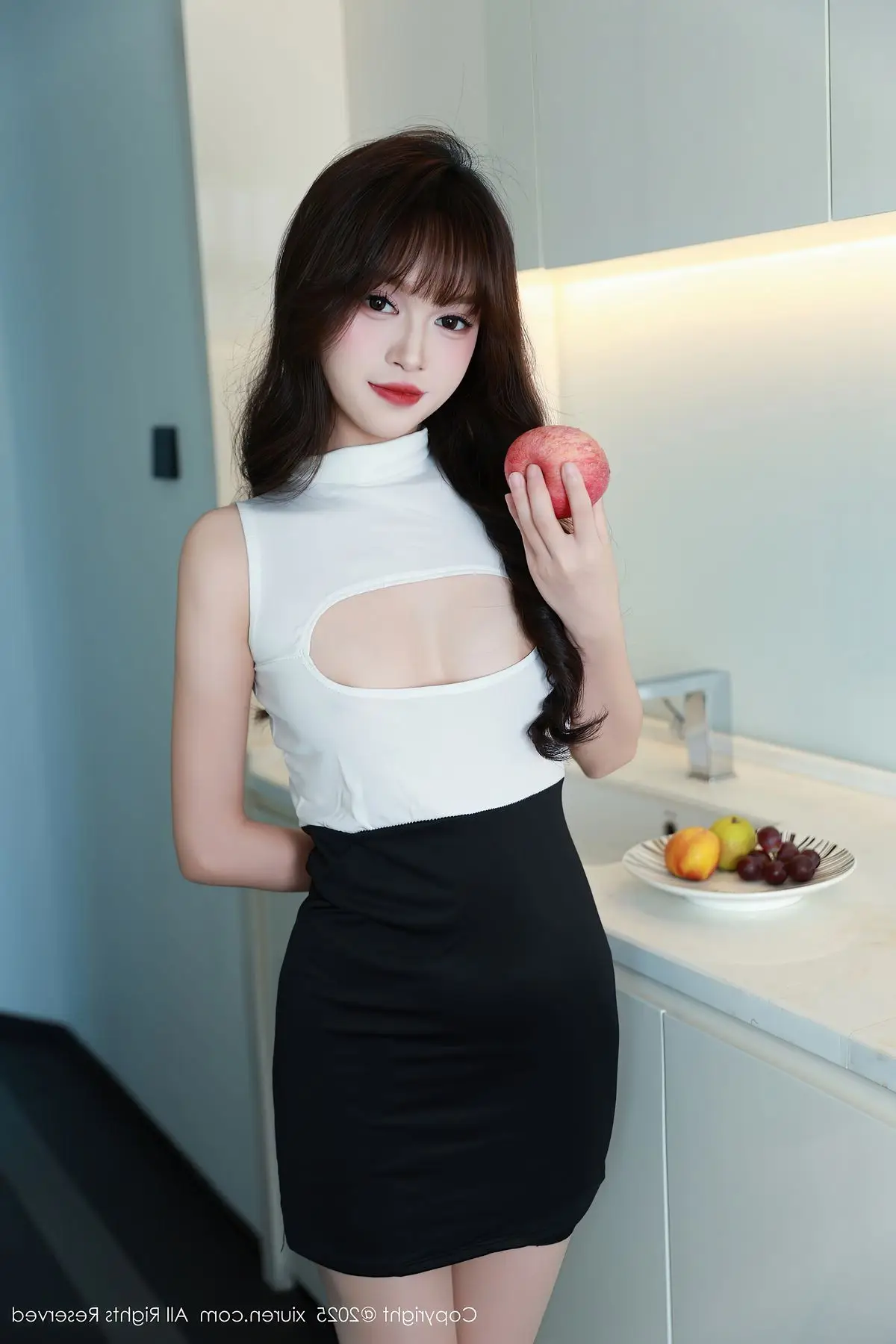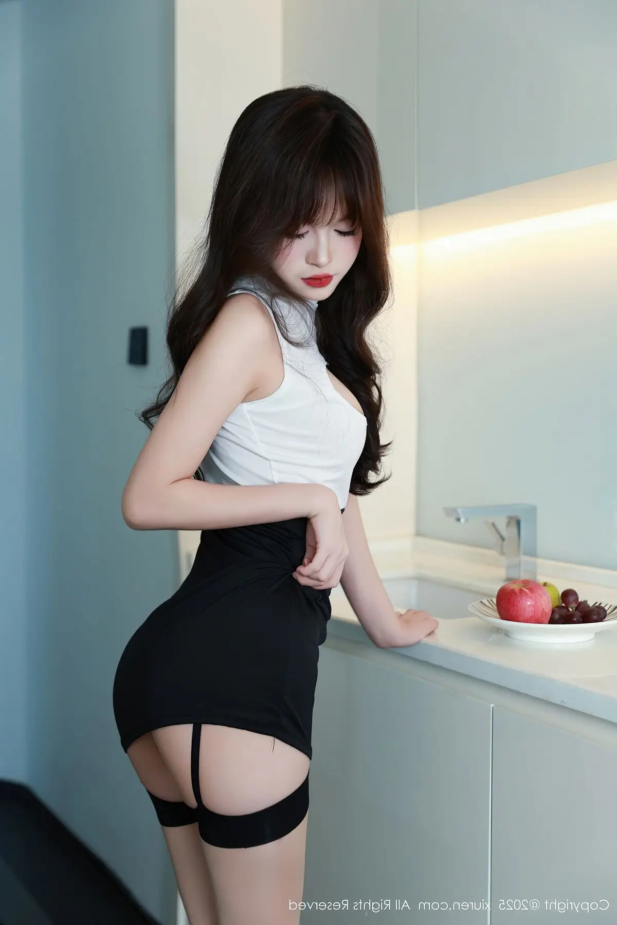 Nuo Mi, the captivating muse of XiuRen No.10590, presents an enchanting allure in this latest photoshoot. Her long, flowing dark hair and mesmerizing gaze command attention as she poses gracefully within a modern interior setting, highlighting her elegant yet subtly sensual beauty. A pristine white sleeveless top paired with a chic black mini-skirt and delicate garter details creates a sophisticated yet alluring ensemble. Nuo Mi exudes confidence and professional charm, transforming each pose into a work of art. This collection promises to captivate all who view it, solidifying Nuo Mi's irresistible appeal.