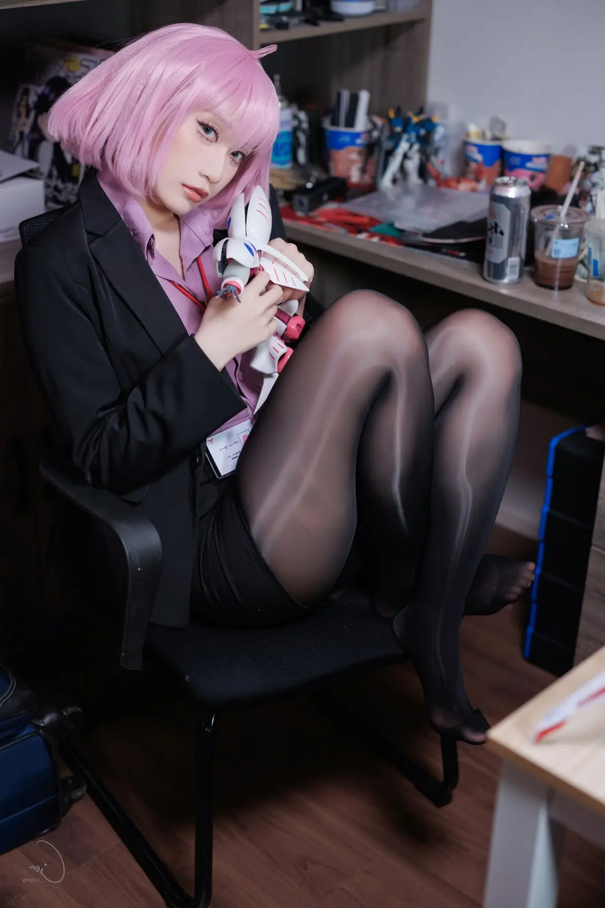 Coser Cien恩恩 delivers a truly captivating portrayal of her HamanOL character, blending professional elegance with a distinctive charm. Her striking pink hair provides a unique focal point, beautifully complementing the sleek black suit jacket and skirt. The sheer black pantyhose and sharp high heels further accentuate her sophisticated silhouette and long, graceful legs. Posing gracefully by the water's edge, Cien恩恩 masterfully showcases her soft curves and engaging gaze directed towards the viewer. The blurred background, adorned with shimmering city lights reflecting on the water, creates a romantic and ethereal ambiance that perfectly enhances her allure. This HamanOL collection is sure to enchant fans of modern office fashion combined with a touch of unique cosplay artistry.