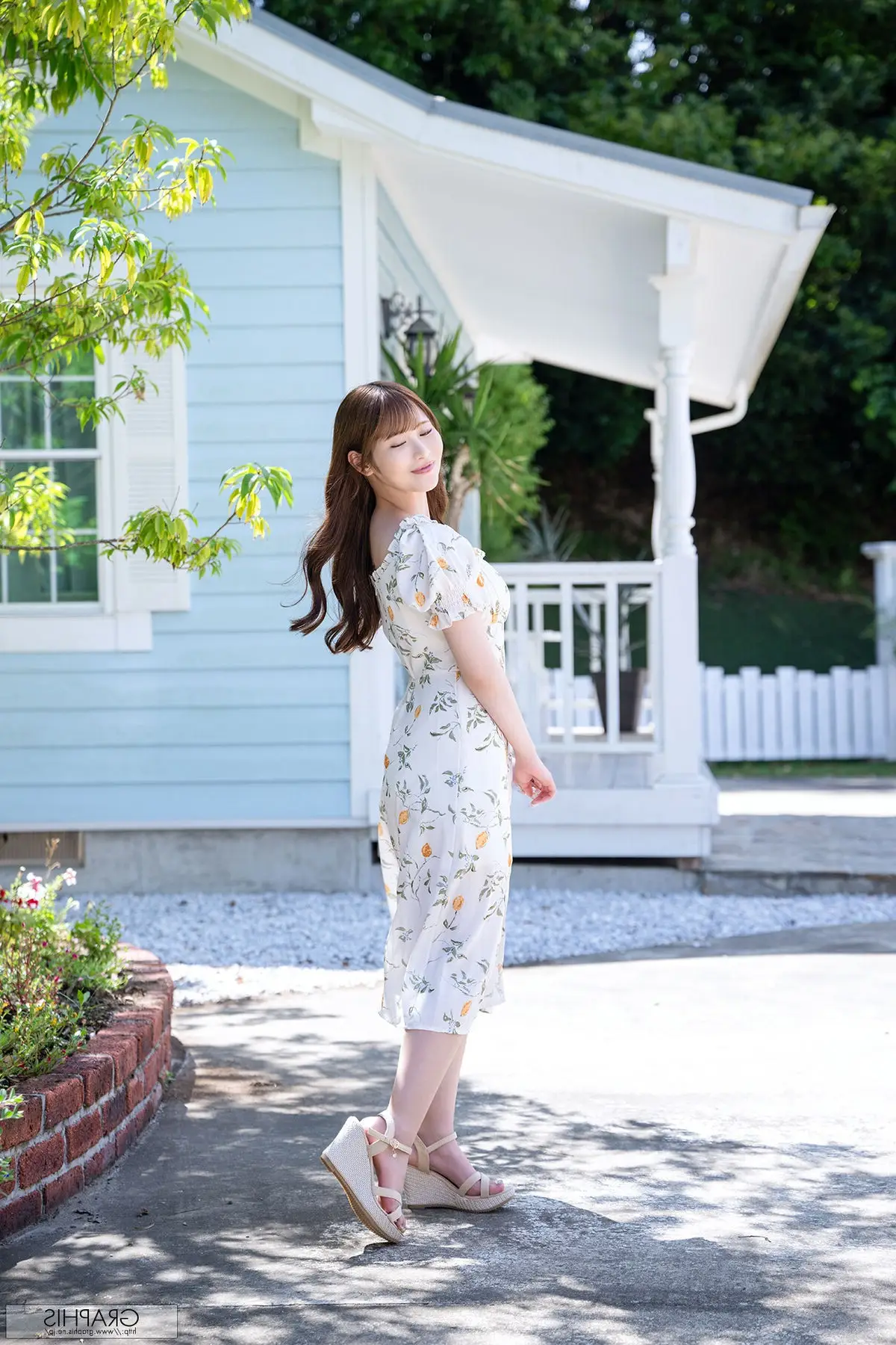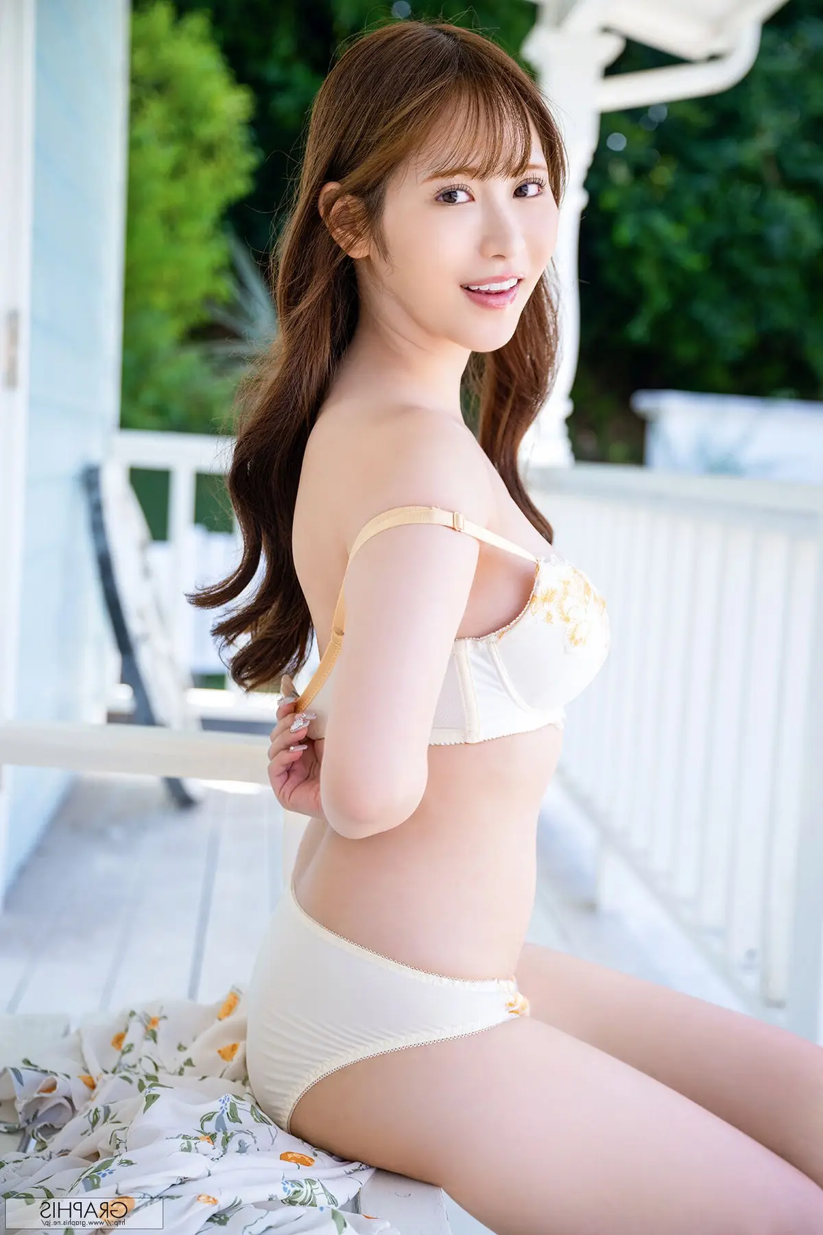 Witness the radiant beauty of Ono Rikka in the Graphis Gals Vol4 collection With a bright smile and captivating eyes Ono Rikka gently rests her hand on a white railing posing gracefully She wears a light floral dress highlighting her delicate features and natural charm amidst a lush green setting This moment not only conveys tenderness but also radiates positive energy inviting viewers to explore more emotional images in this special series Ono Rikka truly embodies a muse bringing freshness and allure