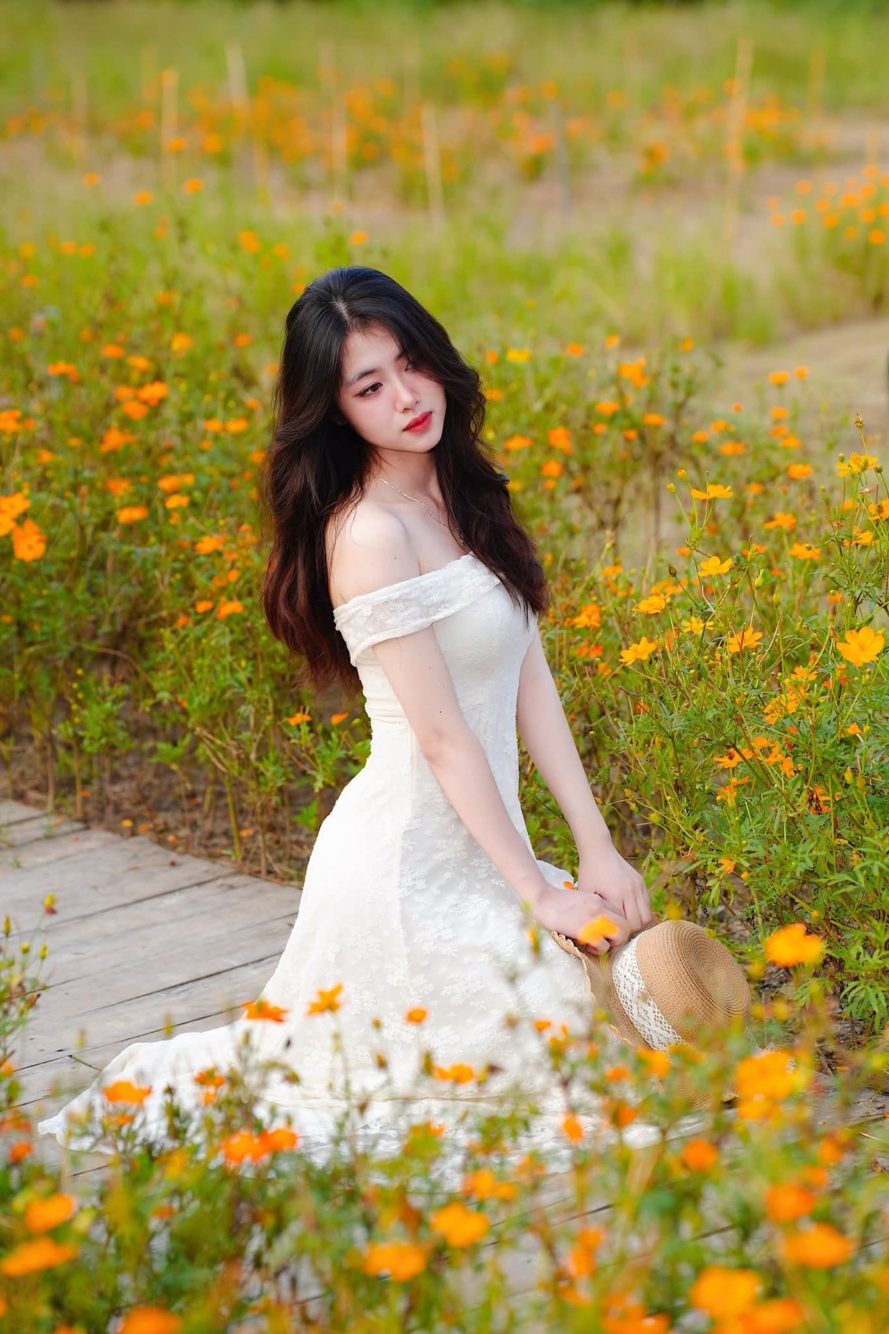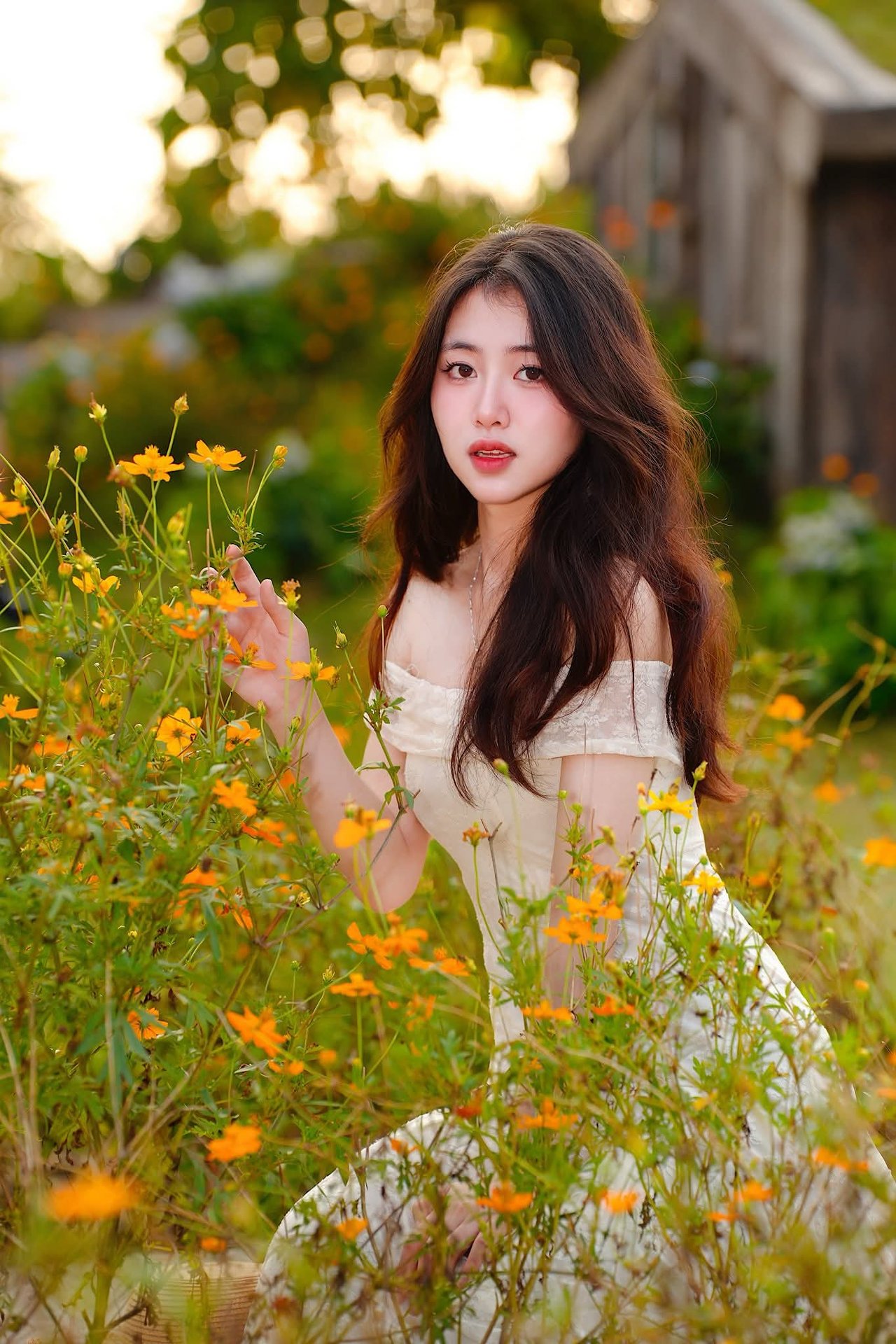 This image XVG No.2 captures the gentle and ethereal beauty of a Vietnamese girl amidst a space overflowing with vibrant flowers. She sits gracefully on a simple wooden chair in a pristine white off-shoulder dress with her long dark hair softly cascading. Her gaze is distant conveying a dreamy and peaceful aura as she delicately holds a small yellow flower. Surrounding her is a lush green landscape adorned with tiny orange and yellow blossoms creating a romantic and lively natural setting. This scene not only celebrates the traditional charm of Vietnamese women but also evokes a profound harmony between humanity and nature a truly captivating moment of tranquility.Đông Hoàng