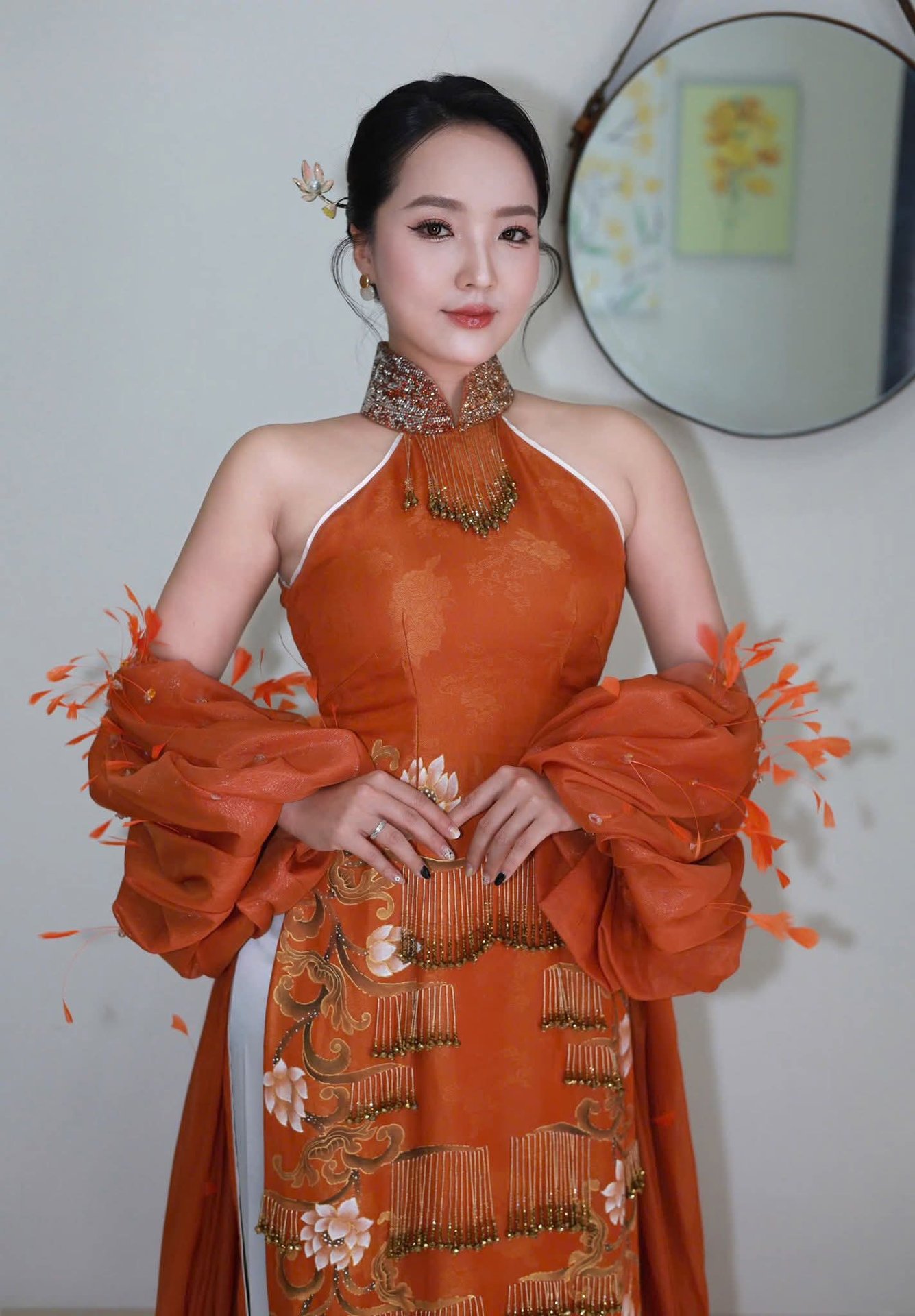 The image beautifully captures the elegant charm of a Vietnamese woman adorned in a stunning modern Ao Dai. This attire stands out with its warm terracotta orange hue and a truly unique design, featuring exquisite embroidered and beaded details complemented by an intricately styled sleeve or shawl, creating an incredibly captivating fashion statement. Every line of this traditional garment not only flatters her figure but also reflects the wearer's refined aesthetic taste. The harmonious blend of classic and contemporary elements forms a perfect ensemble that draws every eye. This is undoubtedly an ideal choice for those who appreciate sophistication and distinctiveness at special events.Stories
