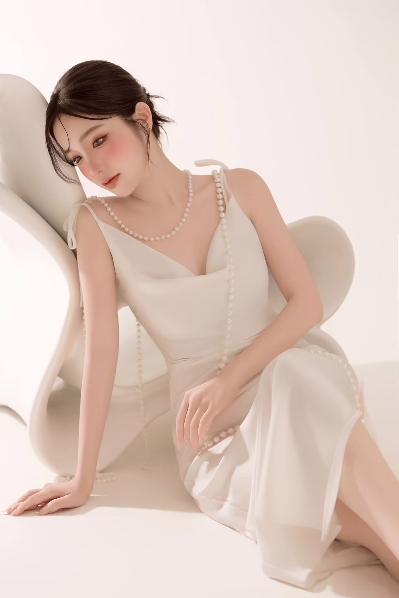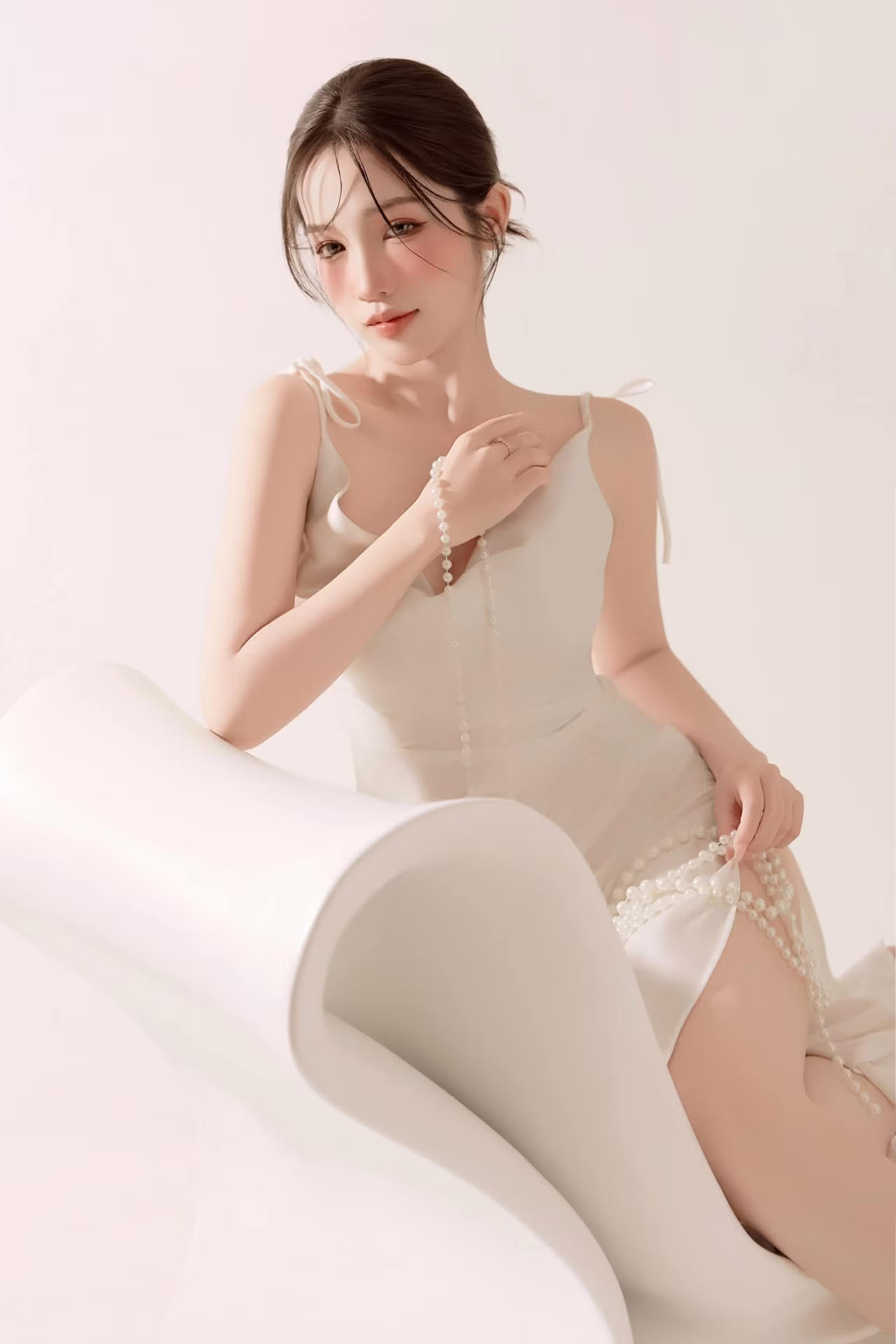 This stunning photograph captures the graceful and elegant beauty of a Vietnamese woman in a sophisticated artistic setting The central figure is adorned in a flowing white dress embellished with pearls exuding luxury and purity Her fluid sitting pose combined with soft lighting highlights a serene and captivating demeanor Every detail from the attire to the posture reflects meticulousness and artistic inspiration The image is not merely a moment but a true work of art celebrating human beauty and creative expression This visual narrative invites viewers to appreciate the delicate balance between classical aesthetics and contemporary elegance #Vietnamese #pretty #charm