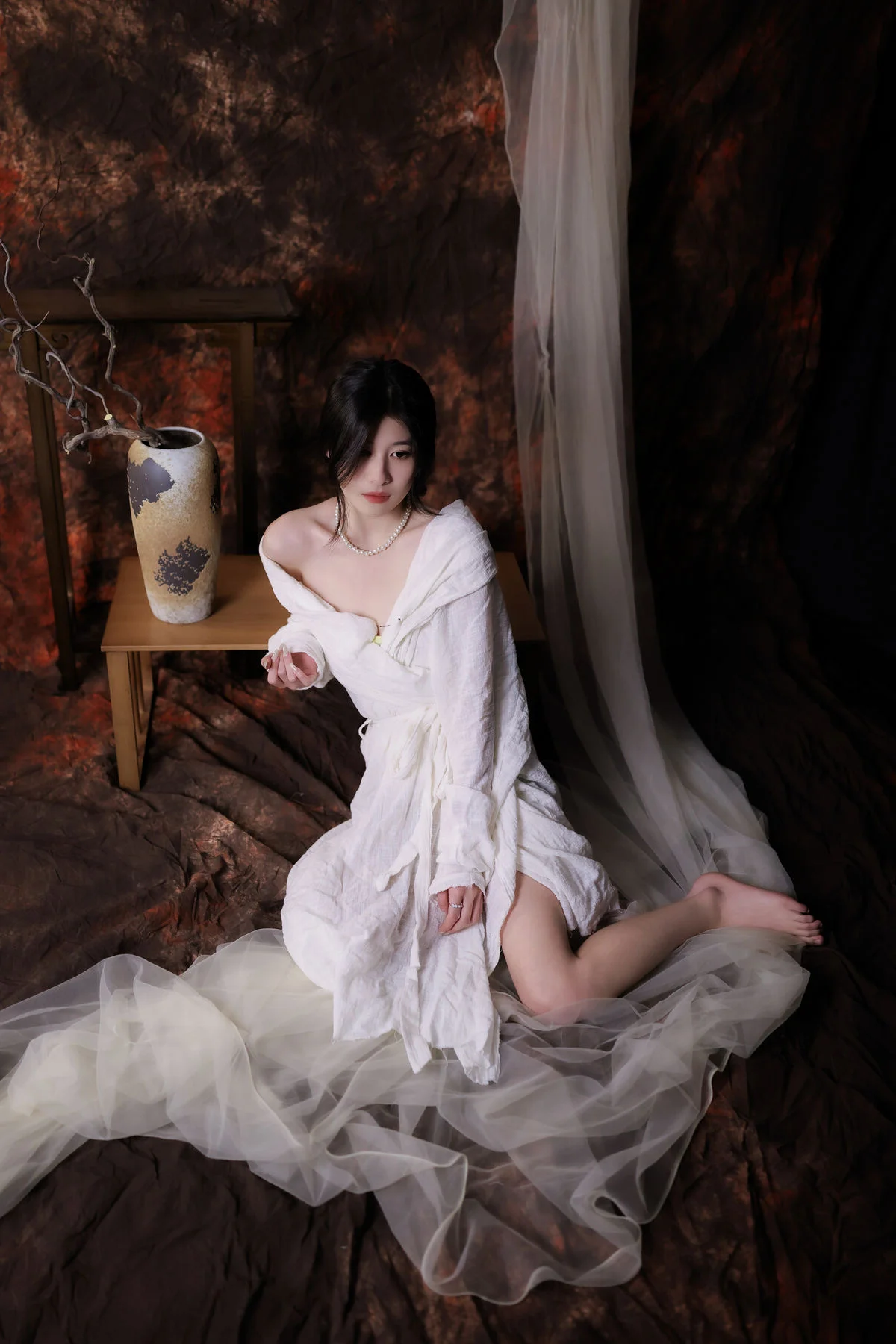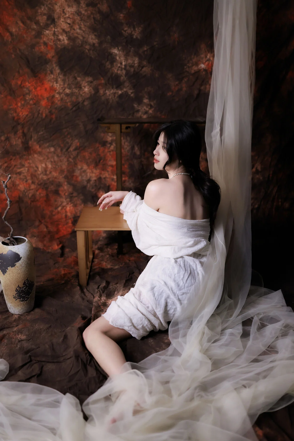 Step into a world of profound elegance and artistic storytelling with this captivating photography series featuring the talented model Ri Nai Jiao (日奈娇). In this specific collection, titled 未亡人 Part01, the artist explores a sophisticated mourning aesthetic that blends traditional somber tones with modern fashion sensibilities. The visual narrative is built around a stunning black lace ensemble, complemented by a delicate mourning veil that adds an air of mystery and grace to every frame. Ri Nai Jiao delivers a powerful performance, using subtle expressions and graceful poses to convey a sense of quiet reflection and timeless beauty.The lighting in these images is masterfully handled, highlighting the intricate textures of the lace and the soft contours of the studio setting. This collection is more than just a typical cosplay; it is a refined study in portrait photography where every detail, from the choice of accessories to the atmospheric backdrop, contributes to a cohesive and emotionally resonant theme. For fans of high-end photography and aesthetic fashion, this series offers a masterclass in thematic consistency and visual depth.