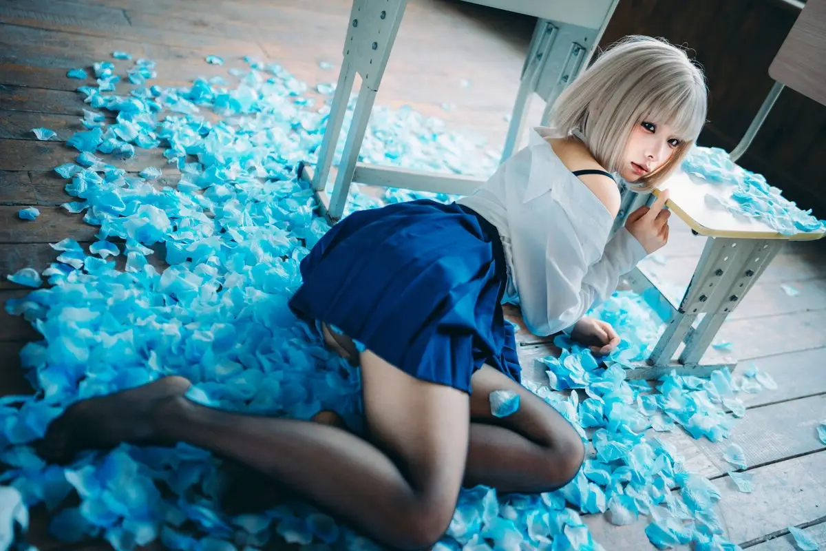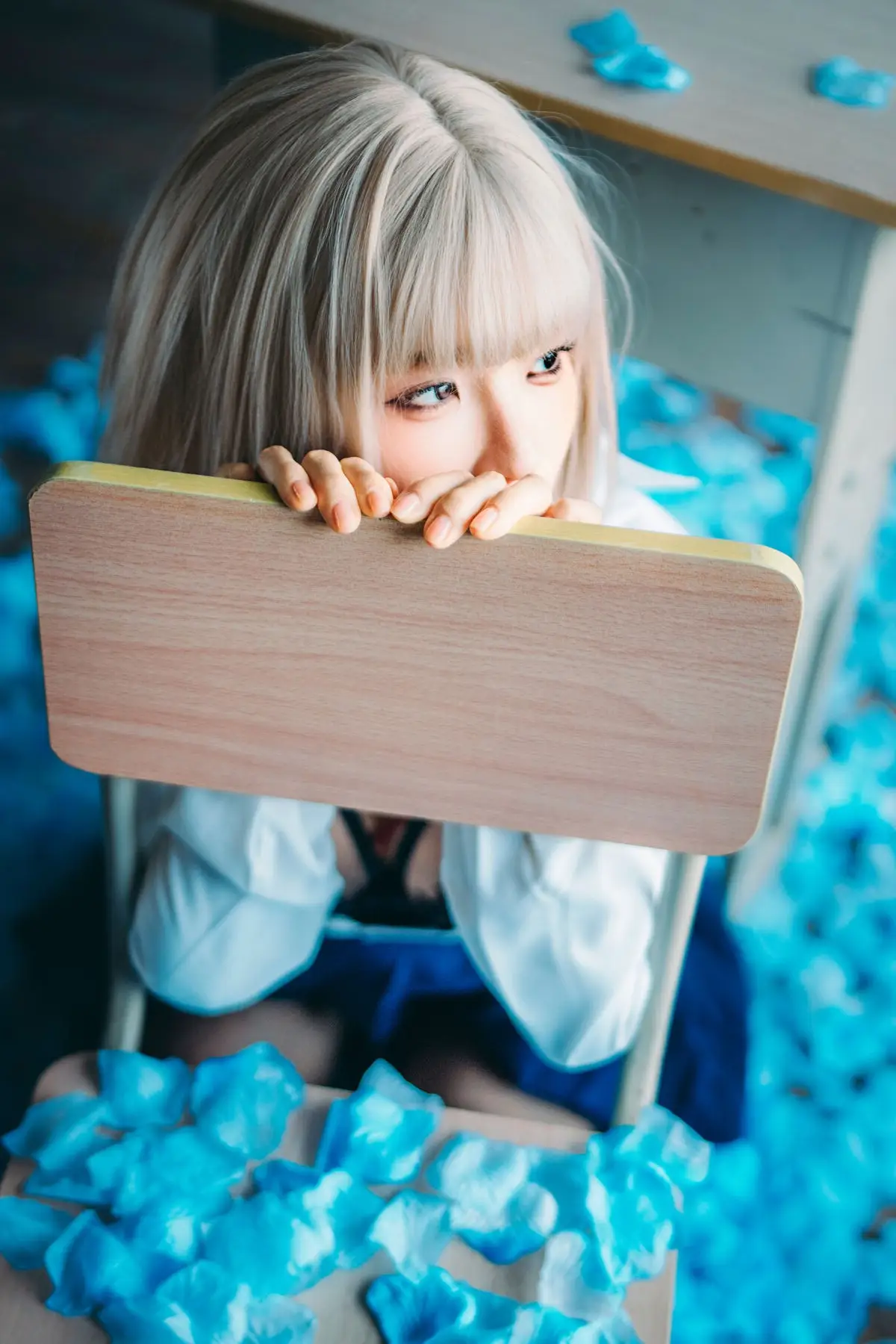 Immerse yourself in the dreamy world of Coser Chunmomo in her captivating self-portrait series, Part02. This image highlights the gentle silver-haired girl with mesmerizing eyes, adorned in a delicate blue schoolgirl or maid-style outfit. She reclines amidst a scattering of vibrant blue petals, creating a romantic and poetic scene. Her natural pose and direct gaze at the camera evoke intimacy and authenticity. The harmonious blend of Chunmomo's ethereal beauty and the soft pastel blue hues conveys a sense of peace and lightness, while showcasing the meticulous effort put into each shot. This is a special part of her self-shot collection, where Chunmomo fully reveals her unique charm and presence.#Coser #Chunmomo #Chunmomo #CuteCosplay #SelfieCosplay #BluePetals
