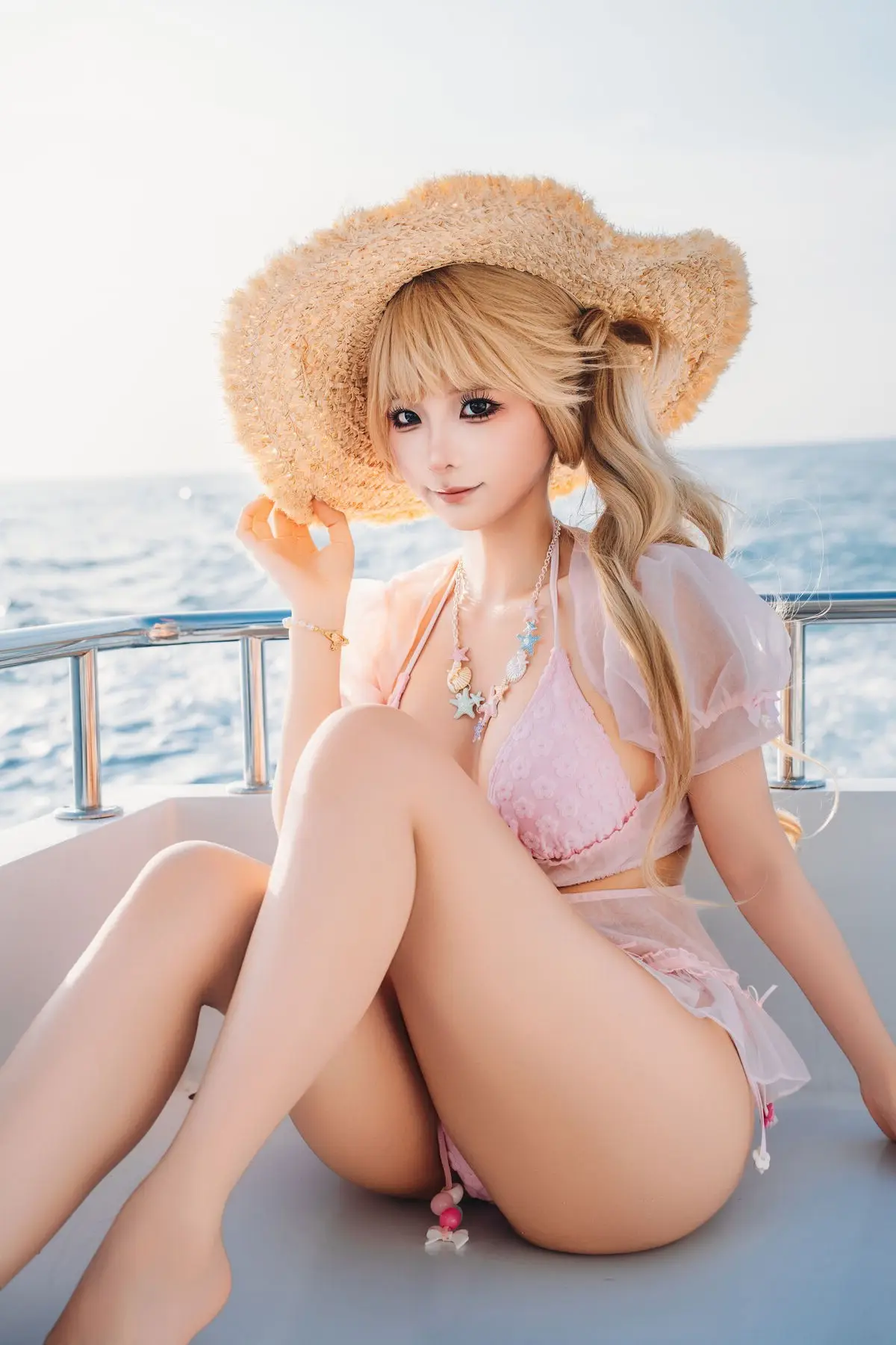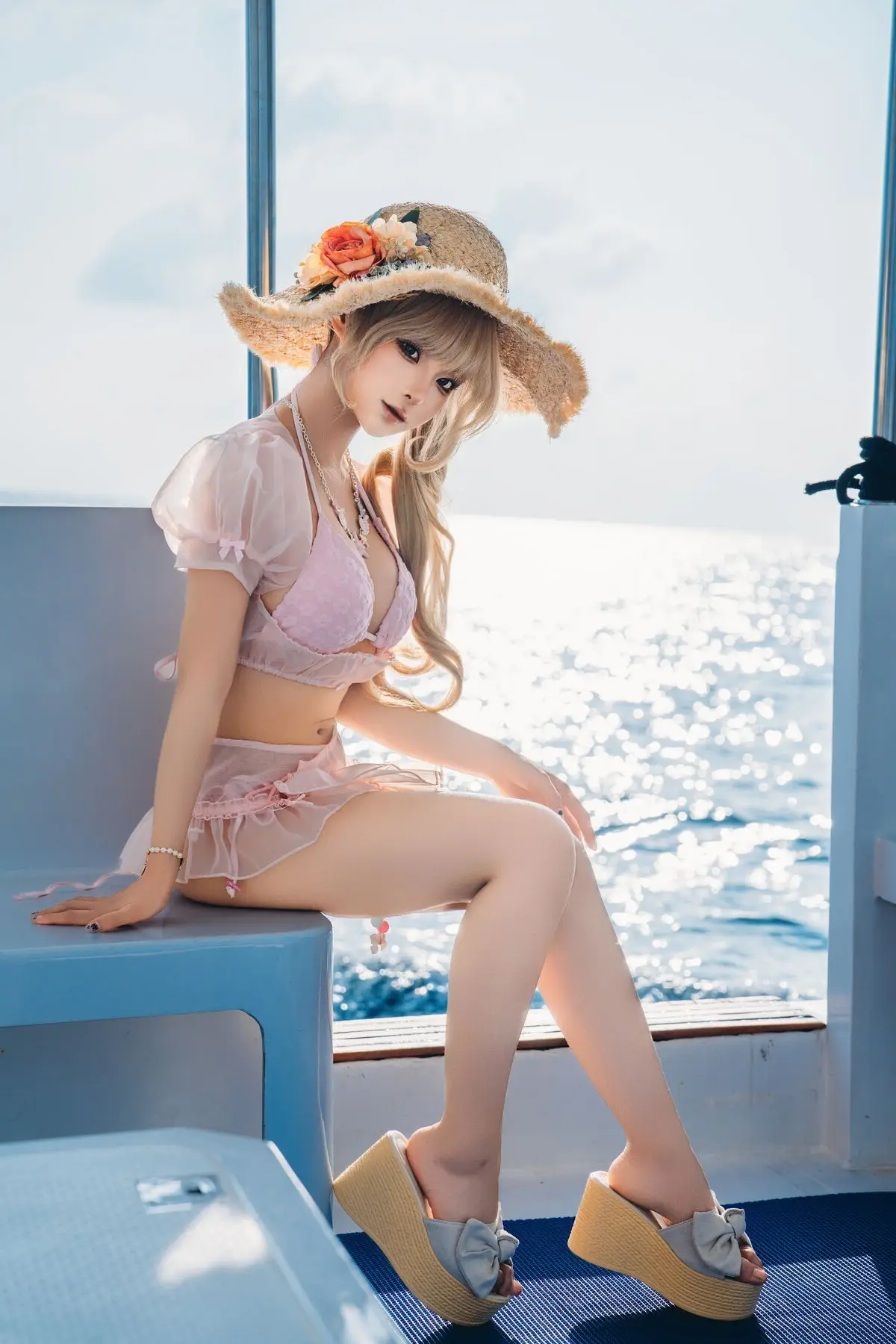 Immerse yourself in the captivating charm of Coser Chunmomo as she graces a luxurious yacht. Dressed in a delicate pastel pink swimsuit and a stylish straw hat, Chunmomo poses elegantly against the breathtaking backdrop of a vibrant ocean sunset. The golden hour light bathes the serene waters, creating a romantic tableau that enhances her ethereal beauty and alluring presence. This self-portrait series Part02 masterfully blends exquisite beach fashion with the artistry of cosplay, capturing moments of serene relaxation. It promises a truly unforgettable visual journey for viewers.#CoserChunmomo #YachtLife #SunsetVibes #BeachFashion #CosplayPhotography