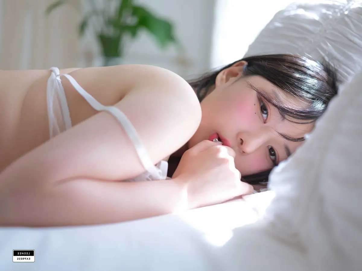 Discover the captivating beauty of Park Star in the LE LERB-130A collection. This image portrays an East Asian young woman with a pure beauty clear eyes and alluring slightly parted lips. She poses kneeling on a pristine white bed adorned in a pristine white ethereal lingerie outfit. The sheer fabric gently embraces her soft curves subtly highlighting her sensual charm in a delicate and modest way. Natural light streams in from the window creating a private warm and romantic atmosphere. Every detail contributes to an emotionally rich moment where natural beauty and allure perfectly blend sparking curiosity and admiration.#ParkStar #LELERB130A #AsianBeauty #SensualLingerie #PrivateMoment