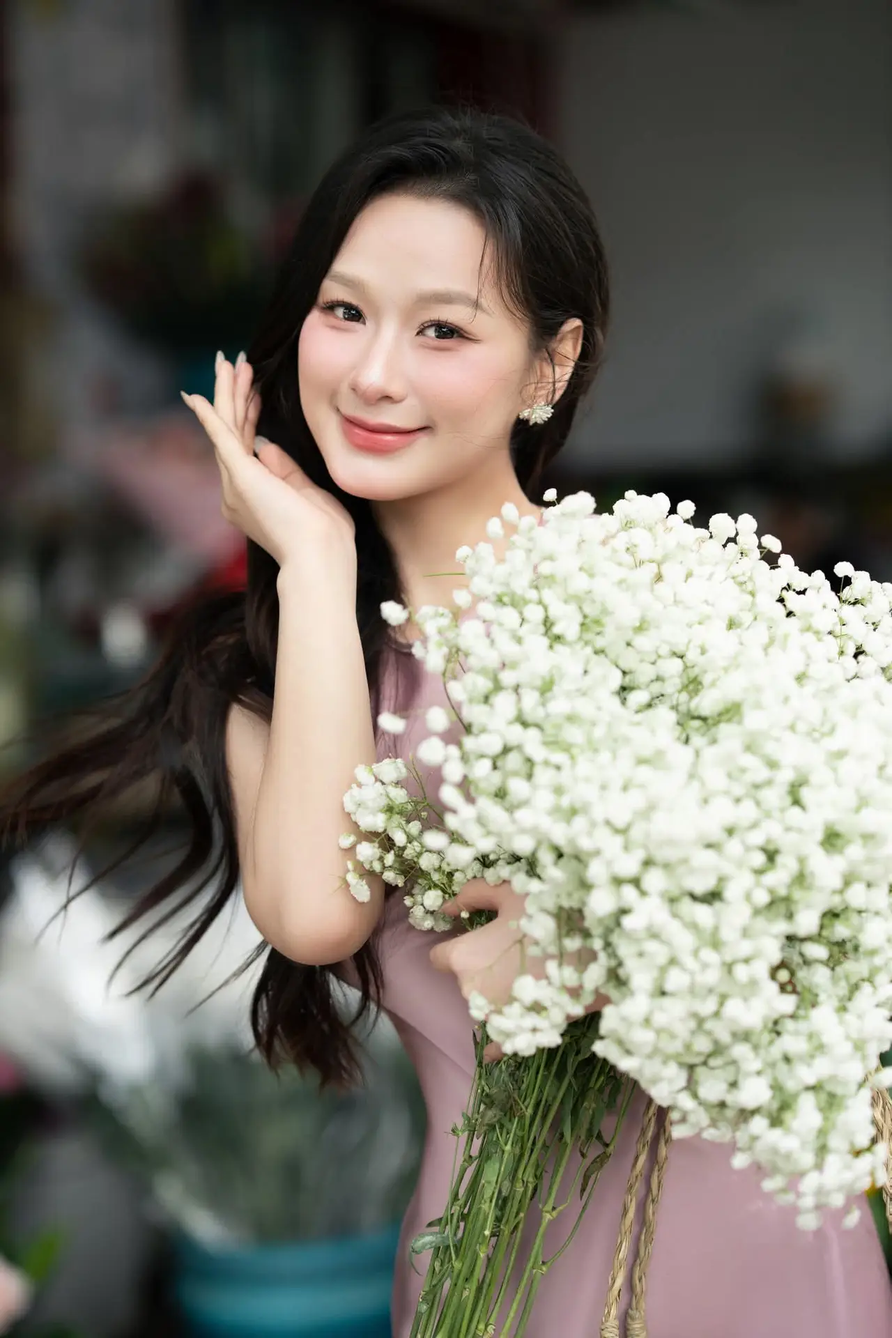 This captivating image portrays a young woman radiating pure beauty and a gentle smile. Dressed in a pristine white traditional-style outfit, she embodies grace and elegance. In her hands, she delicately holds a cluster of pink and white orchids, which further enhances her refined and natural charm. Her clear eyes and neatly tied hair exude a sense of peace and purity. More than just a portrait, this photograph beautifully harmonizes human allure with the splendor of nature, evoking feelings of serenity and tranquility in the viewer. It perfectly captures the essence of a graceful and vibrant East Asian maiden.#PureBeauty #GirlInWhite #OrchidFlower #AsianGrace #VietnamesePortrait