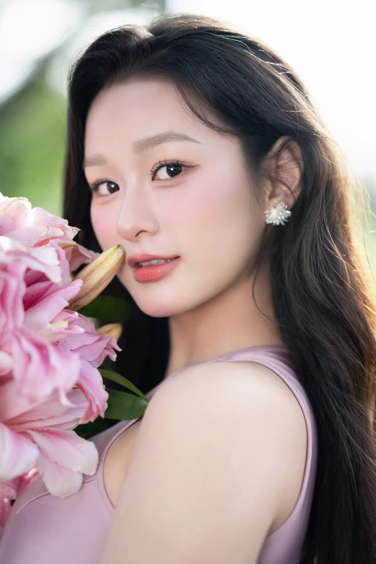 This stunning photograph captures a serene and pure moment of a woman amidst a lush green setting. With her eyes gently closed, she appears to be deeply immersed in the delicate fragrance of the vibrant pink lily bouquet, her facial expression radiating contentment and relaxation. Soft natural light caresses her, highlighting her elegant features and flawless natural beauty. This is more than just a simple portrait; it's a story of harmonious connection between humanity and nature, where inner beauty is reflected through a silent smile and the complete enjoyment of every sense. A precious moment that evokes a feeling of peace and happiness.#PureBeauty #PinkLilies #PeacefulMoment #BeautifulPortrait #Relaxation