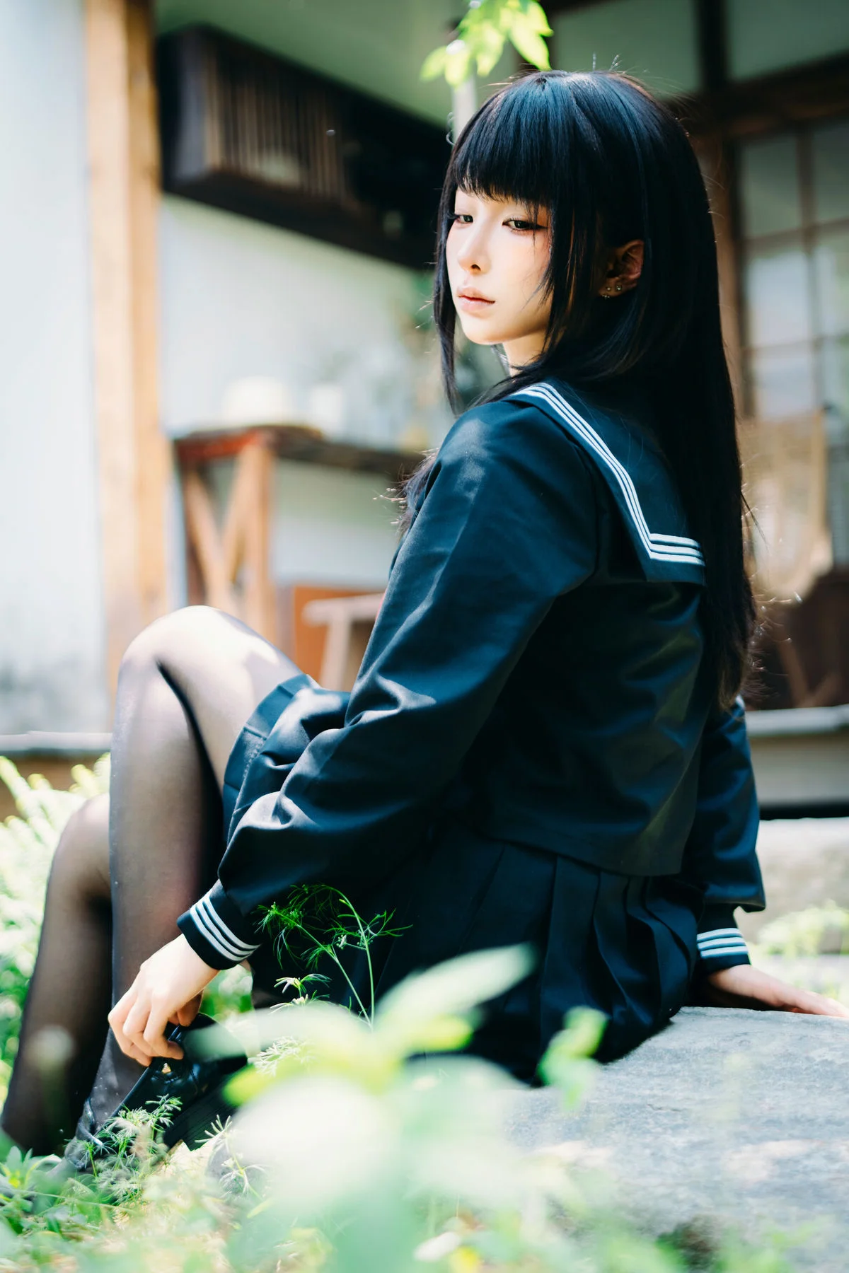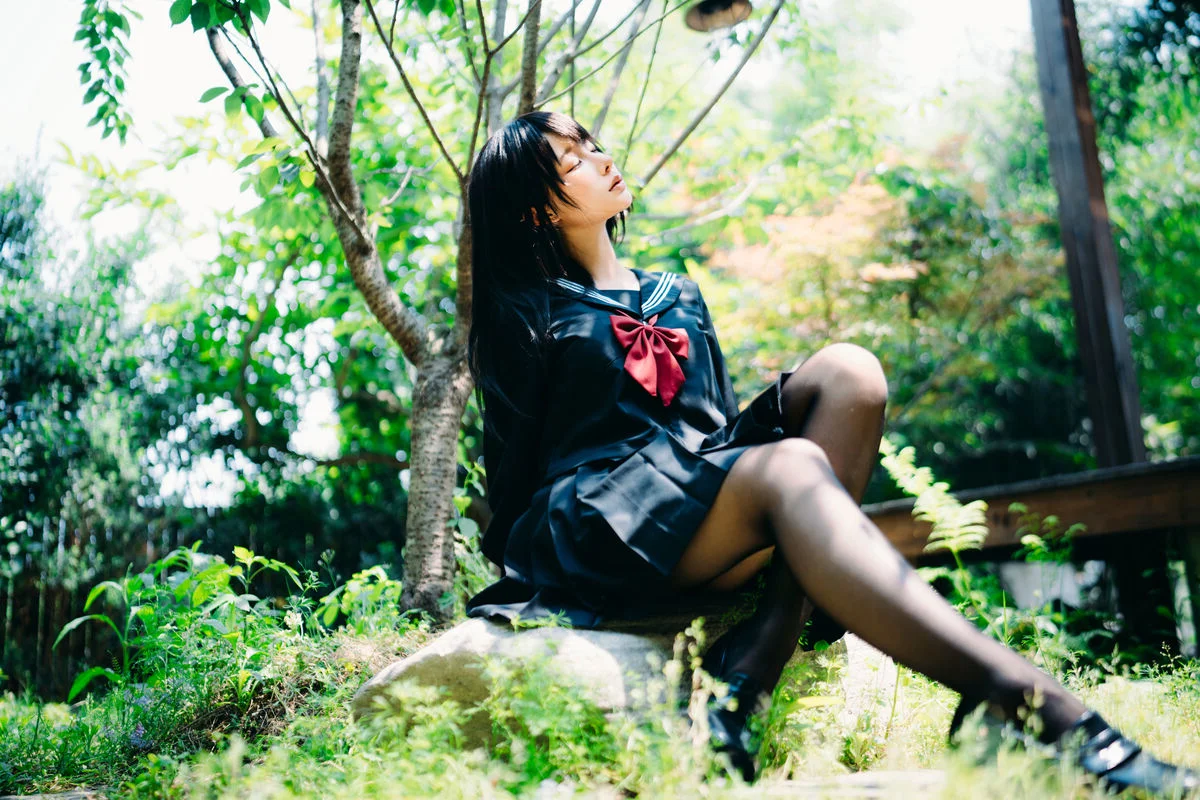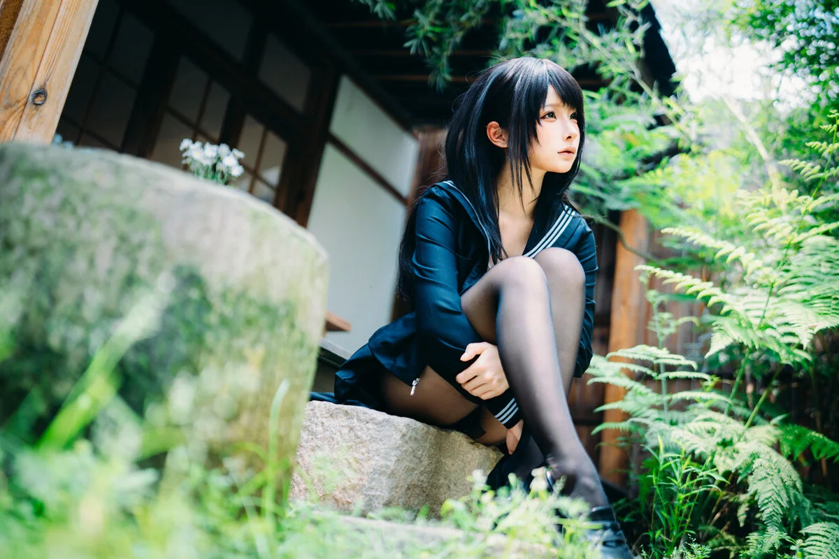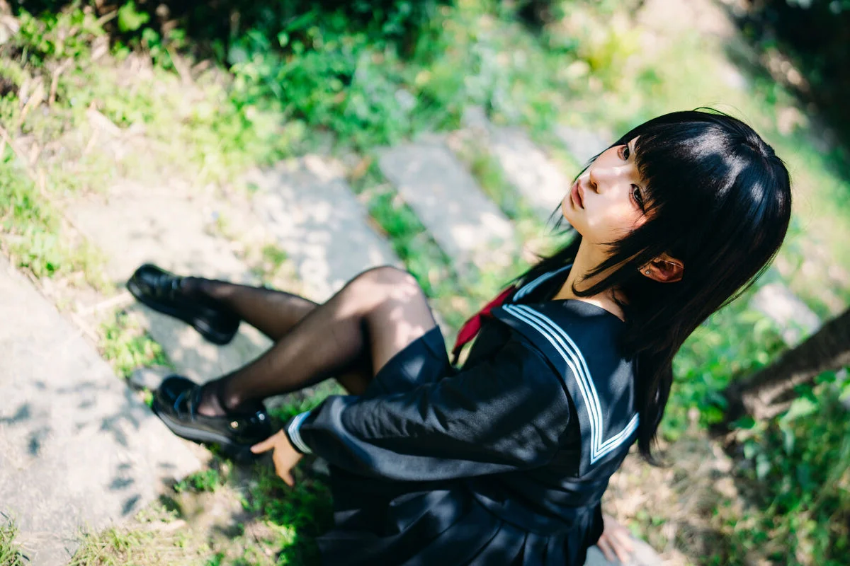 Immersed in a lush and serene green setting, Coser Chunmomo emanates a pure and captivating beauty. In this evocative photograph, she sits contemplatively on a stone step, her silky black hair framing a delicate face, with dreamy eyes gazing into the distance. Her dark sailor-style outfit paired with black stockings accentuates her graceful charm and a hint of mystery. The vibrant natural backdrop of verdant foliage and traditional architecture creates a harmonious scene, transporting viewers into an enchanted garden. This image is part of her October 2025 Self-Portrait Series Part01, where Chunmomo skillfully showcases the connection between human elegance and the tranquility of nature, offering authentic and deeply emotional moments.#Coser #Chunmomo #Chunmomo #SelfPortrait #PureBeauty #NaturePhotography