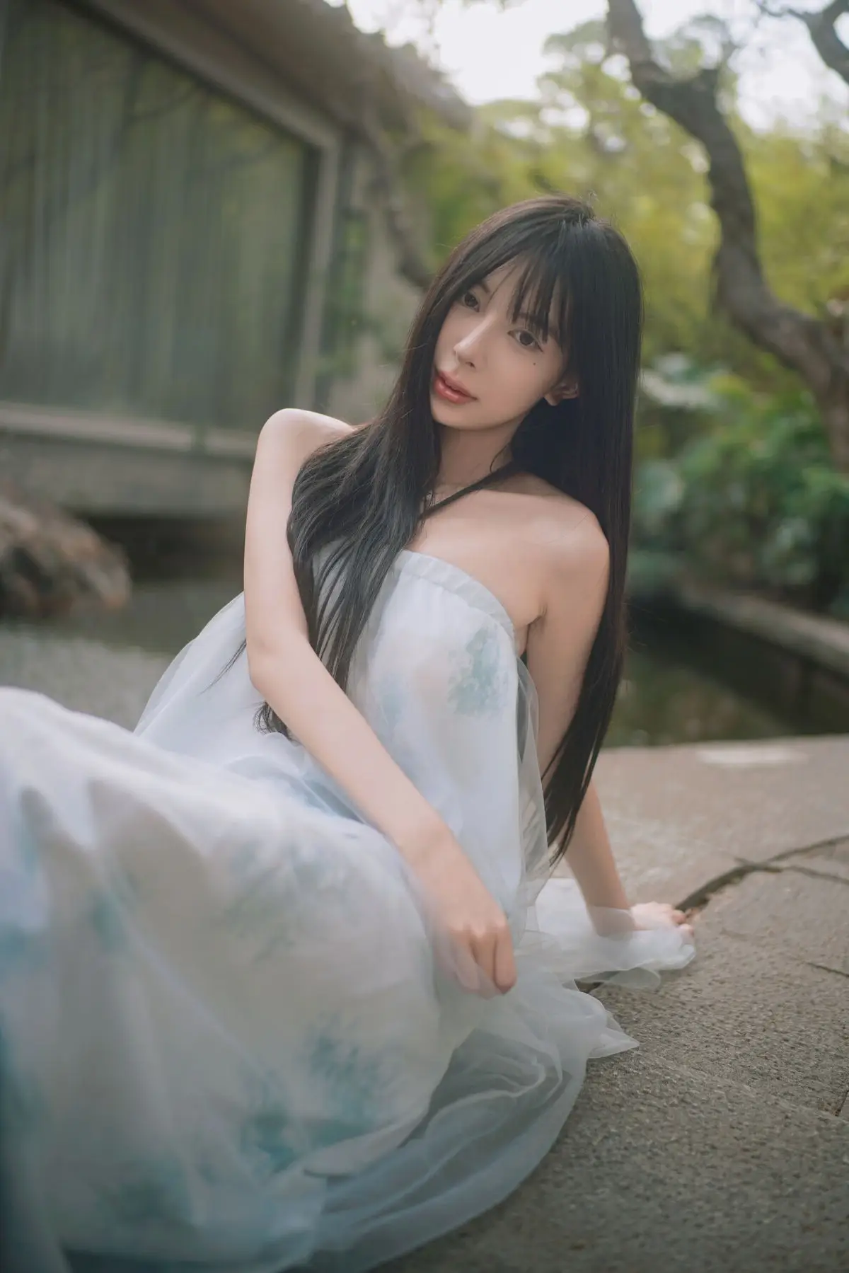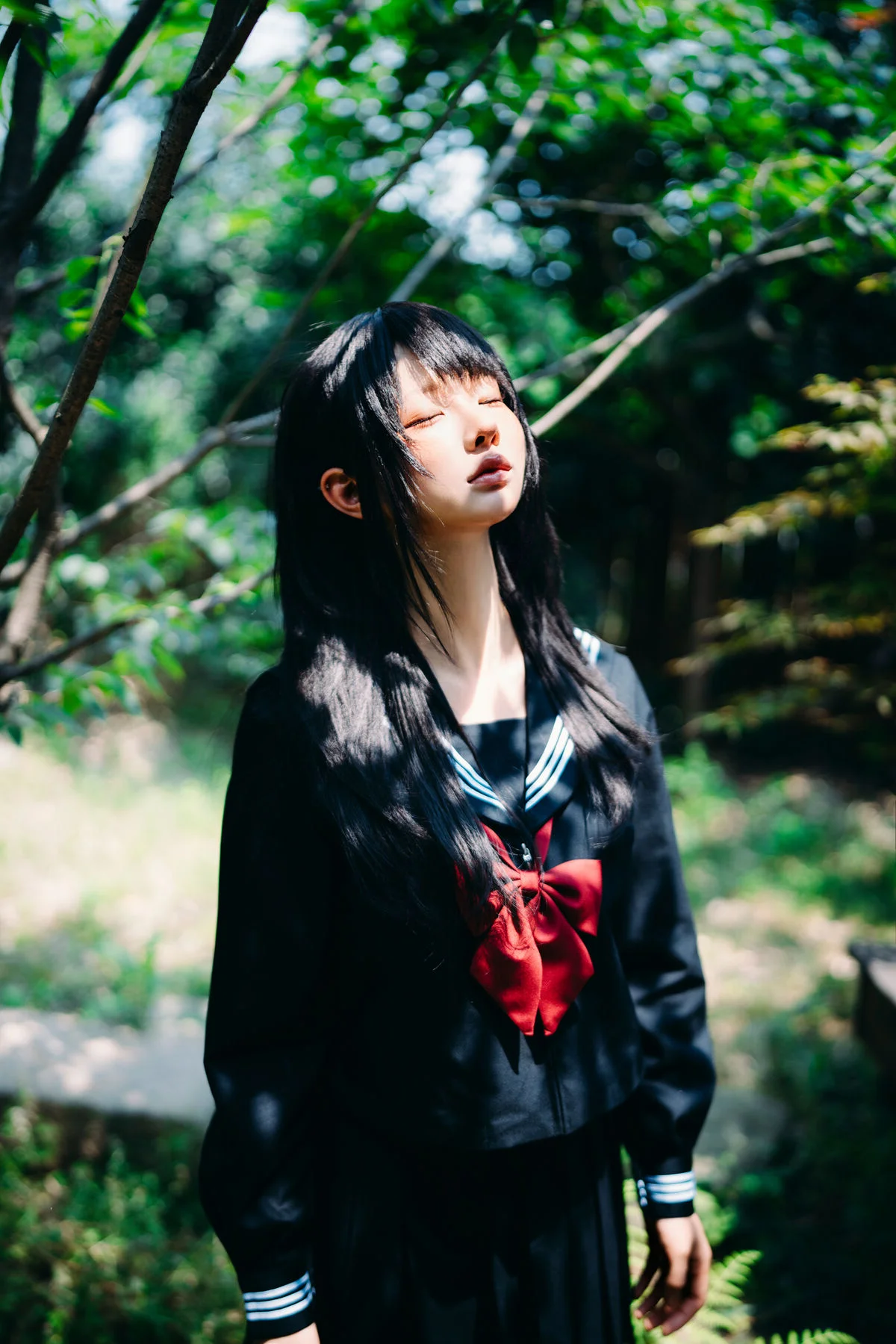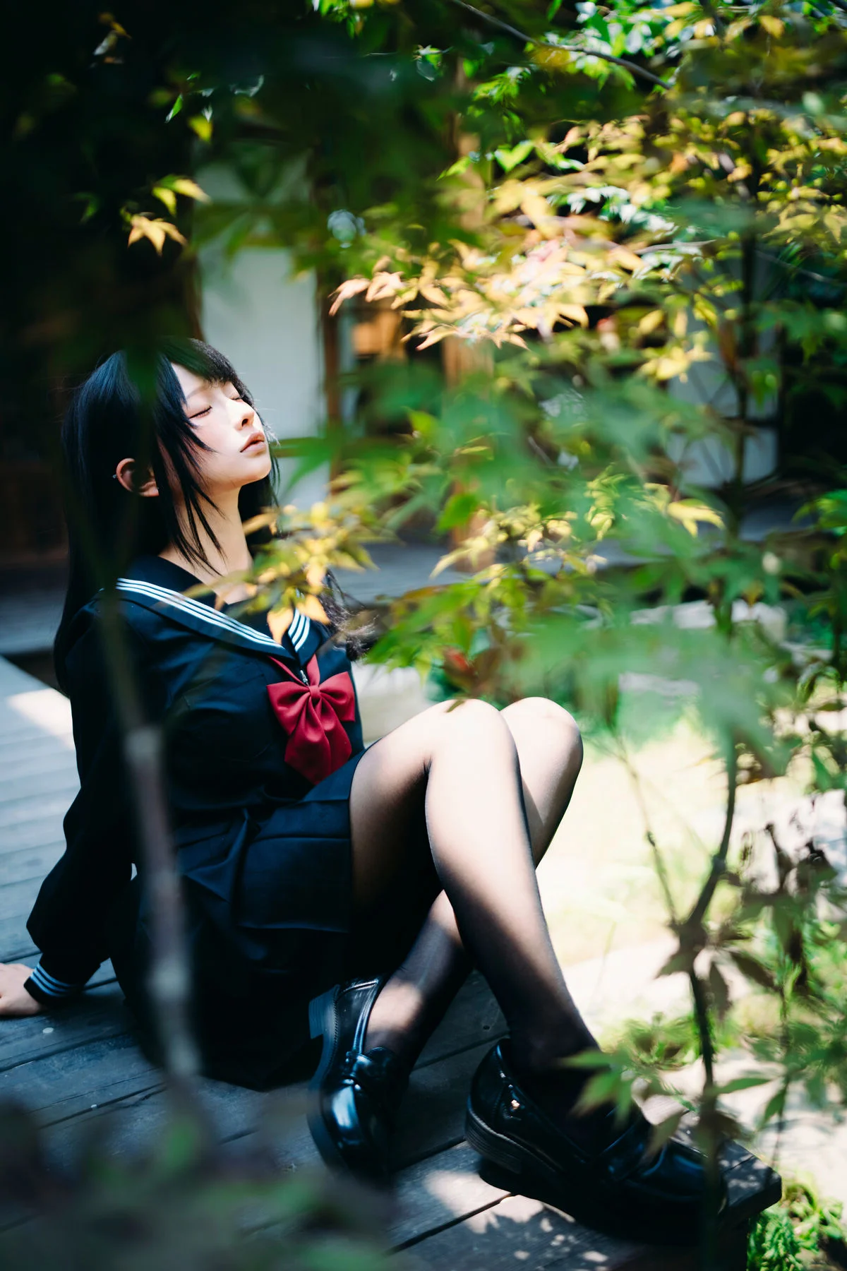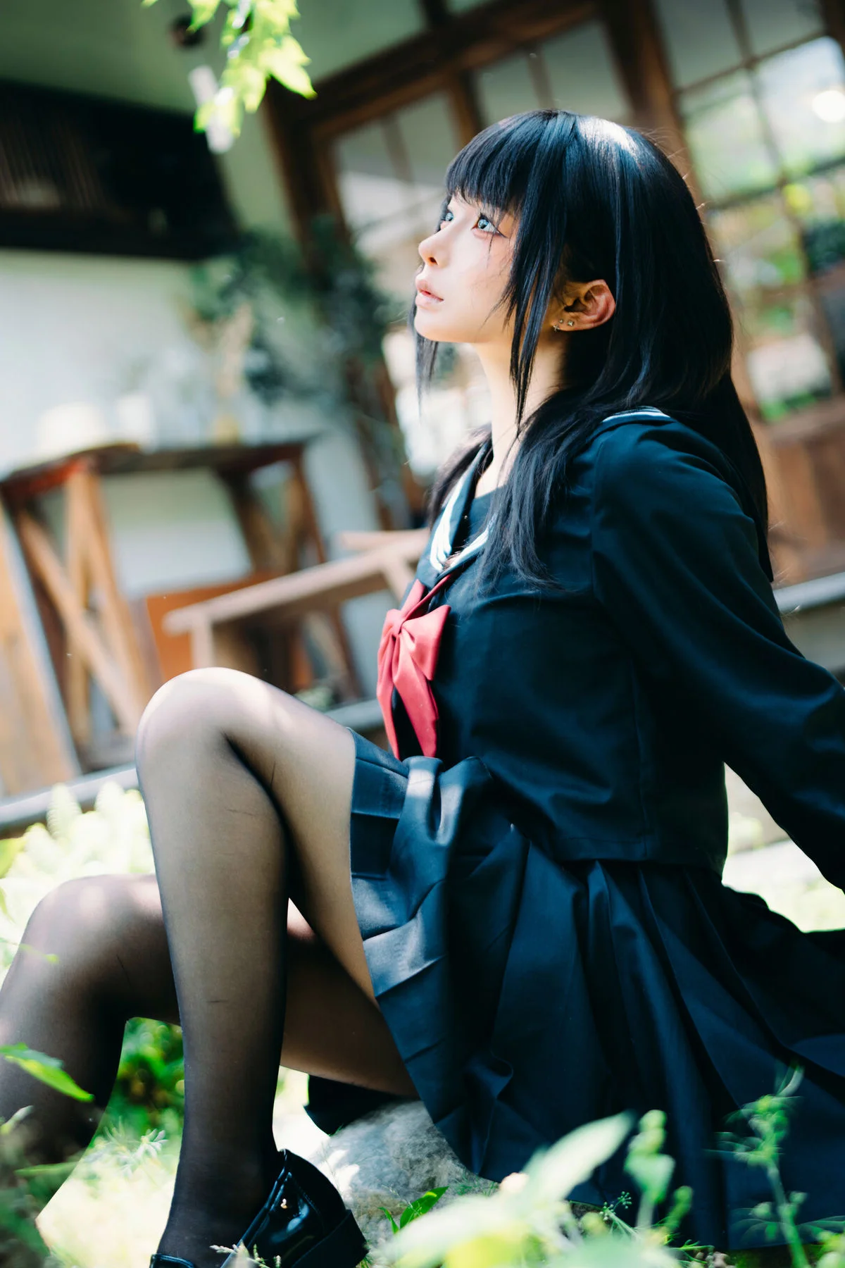 Immersed in a lush and serene green setting, Coser Chunmomo emanates a pure and captivating beauty. In this evocative photograph, she sits contemplatively on a stone step, her silky black hair framing a delicate face, with dreamy eyes gazing into the distance. Her dark sailor-style outfit paired with black stockings accentuates her graceful charm and a hint of mystery. The vibrant natural backdrop of verdant foliage and traditional architecture creates a harmonious scene, transporting viewers into an enchanted garden. This image is part of her October 2025 Self-Portrait Series Part01, where Chunmomo skillfully showcases the connection between human elegance and the tranquility of nature, offering authentic and deeply emotional moments.#Coser #Chunmomo #Chunmomo #SelfPortrait #PureBeauty #NaturePhotography