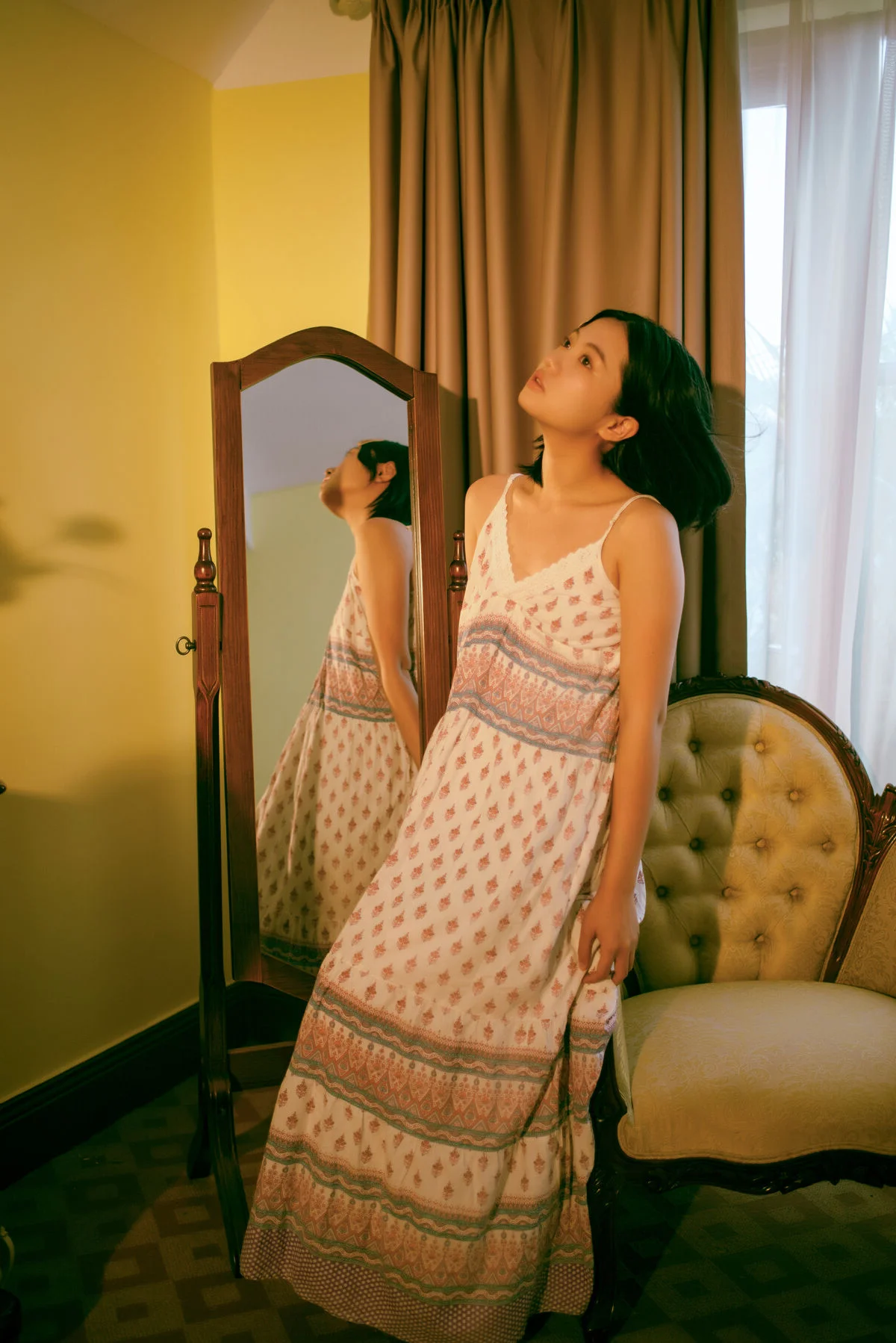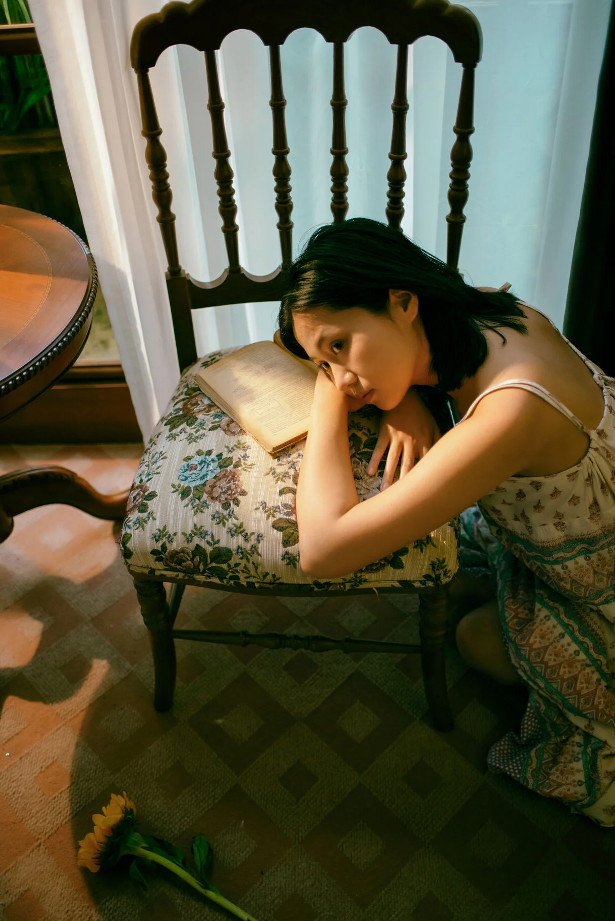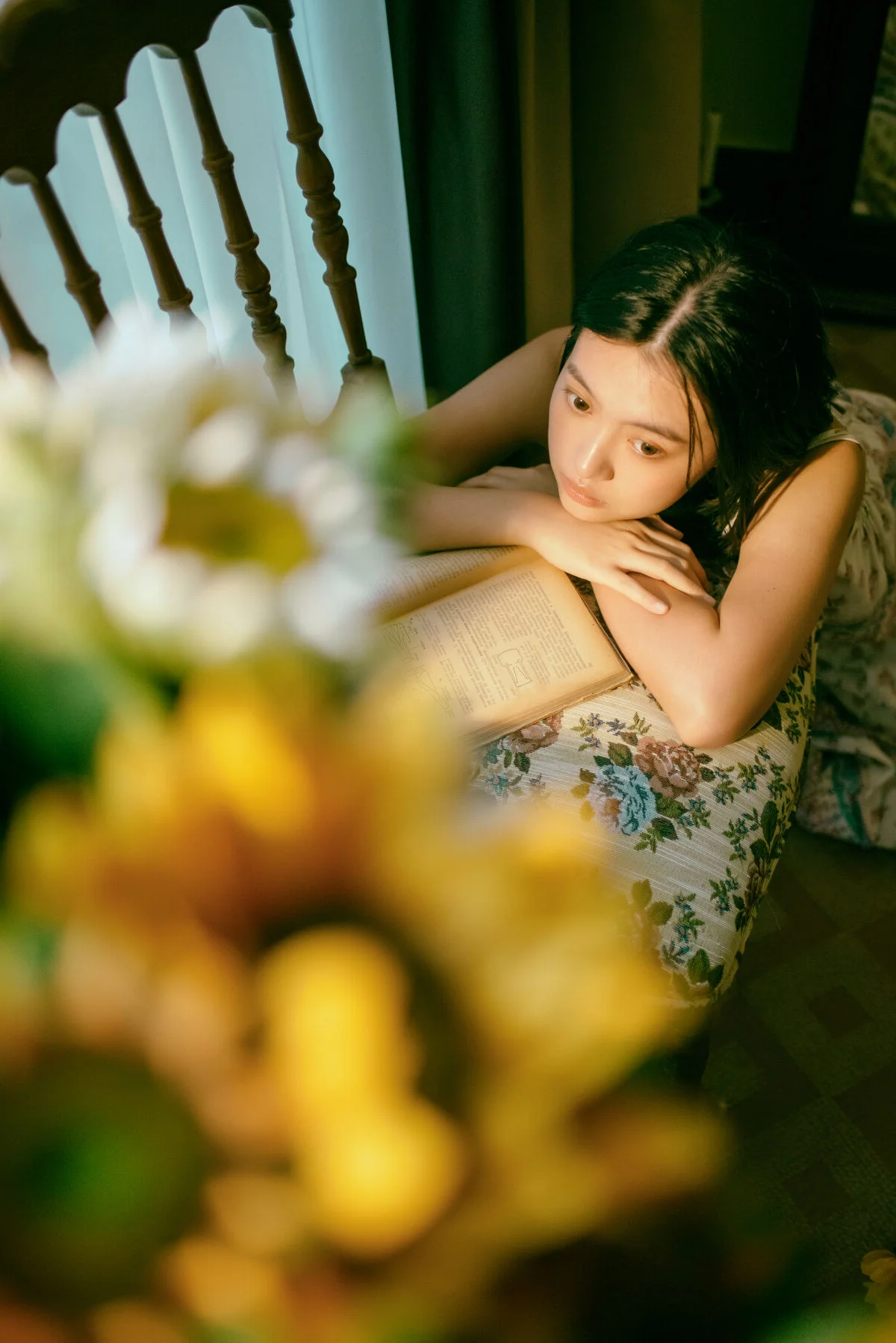 In the YiTuYu Vol.8743 photo collection Xiao Wei emerges as a muse in a serene setting. Soft natural light gently embraces her features highlighting her pure beauty and deep thoughtful eyes. She leans against an old wooden chair a half-open book beside her and a vibrant vase of sunflowers creating an unexpectedly peaceful scene. Each moment captured of Xiao Wei seems to embody its own unique art language unspoken yet profoundly emotional inviting viewers to pause and feel. These are not merely photographs but intimate stories of tranquility and inner beauty.#XiaoWei #YiTuYu #ArtLanguage #PureBeauty #ArtisticPortrait