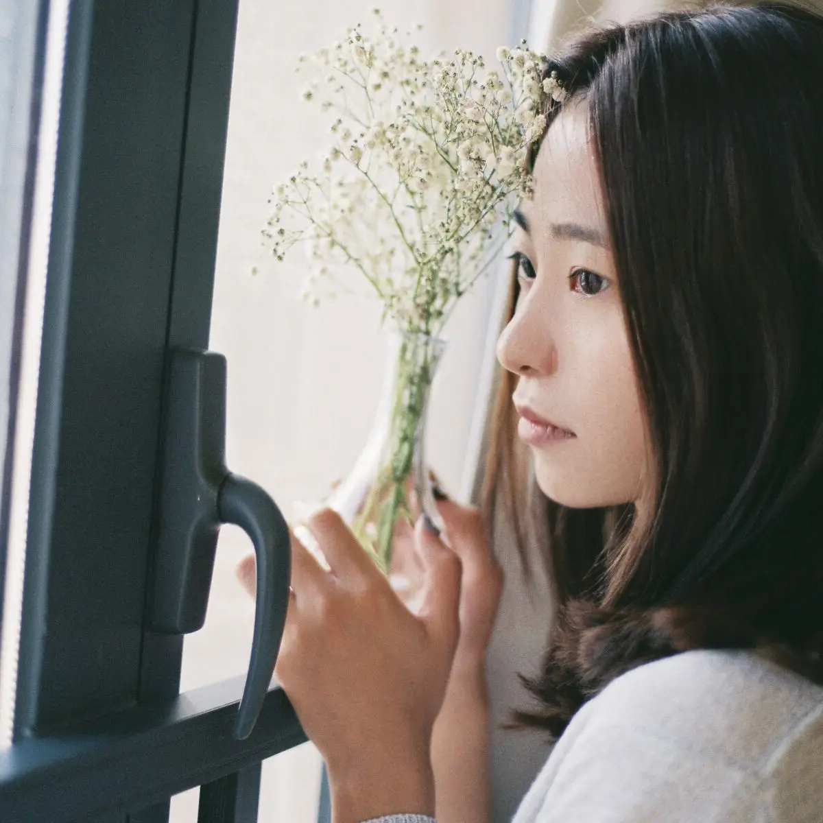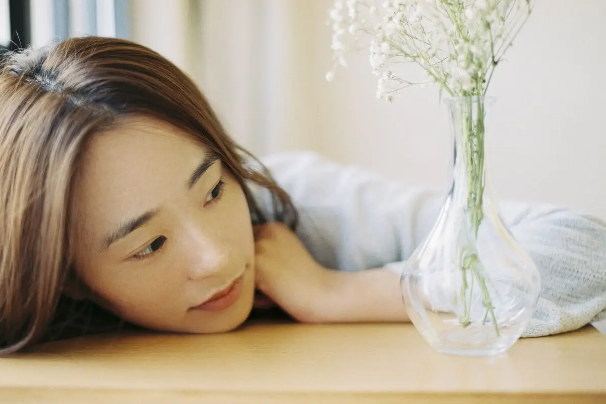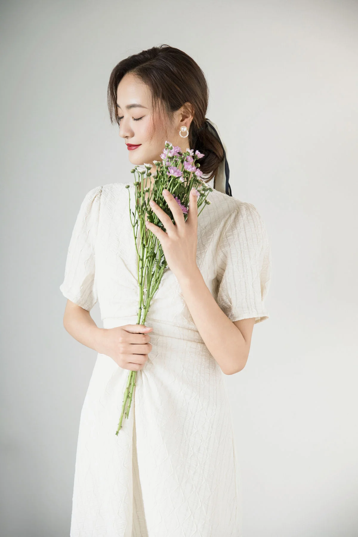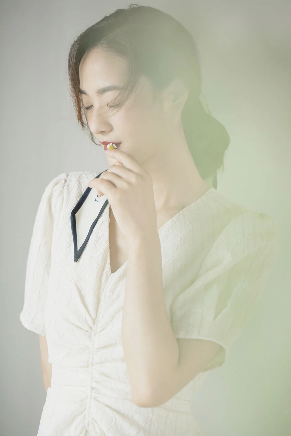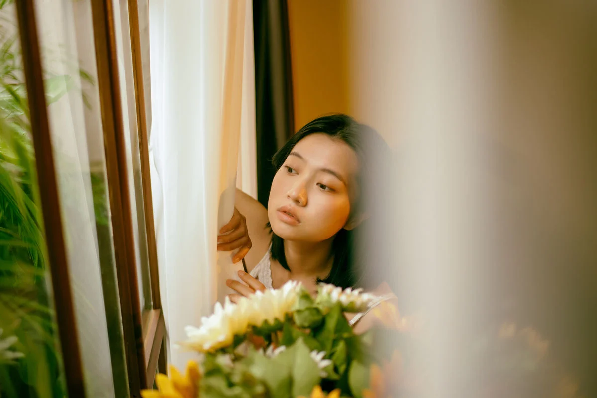 Serene Asian Beauty: A Delicate Moment with a White Flower