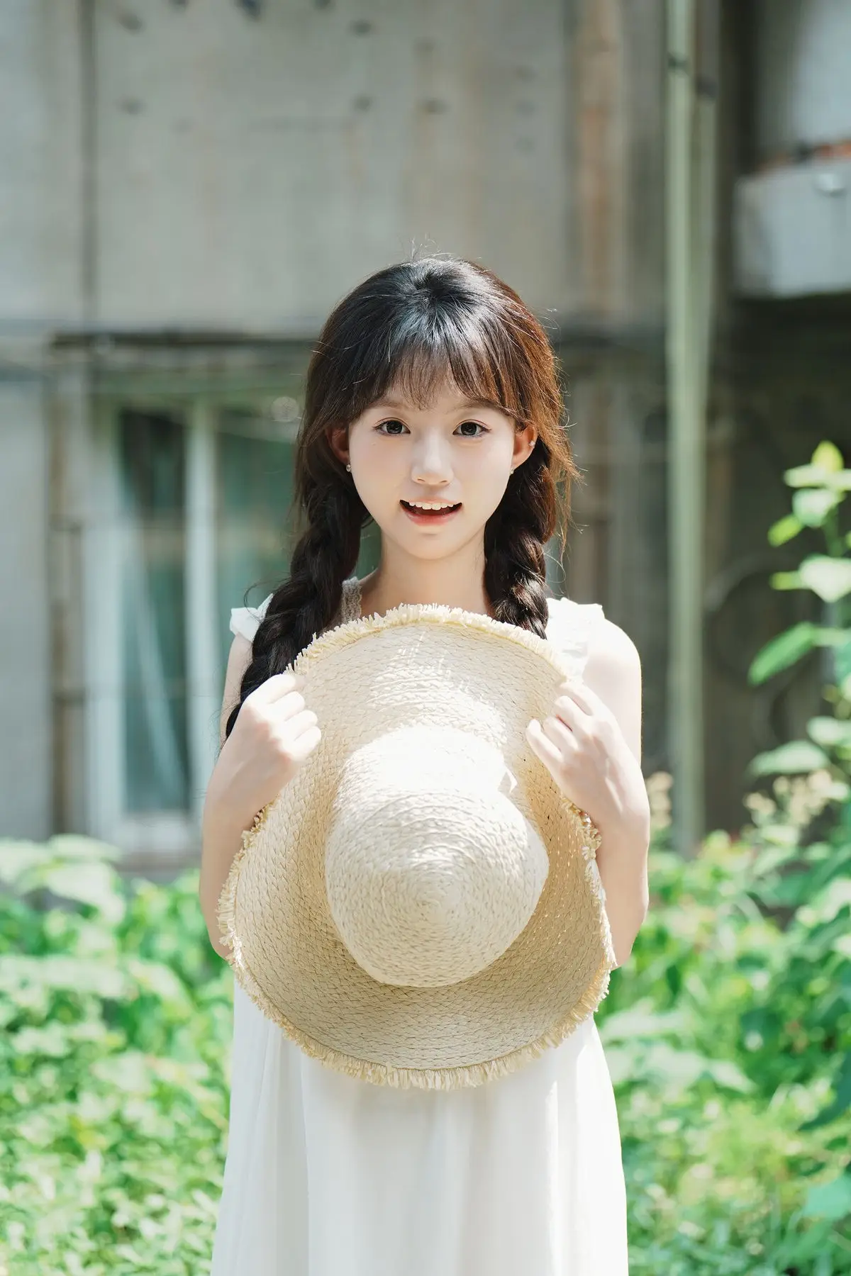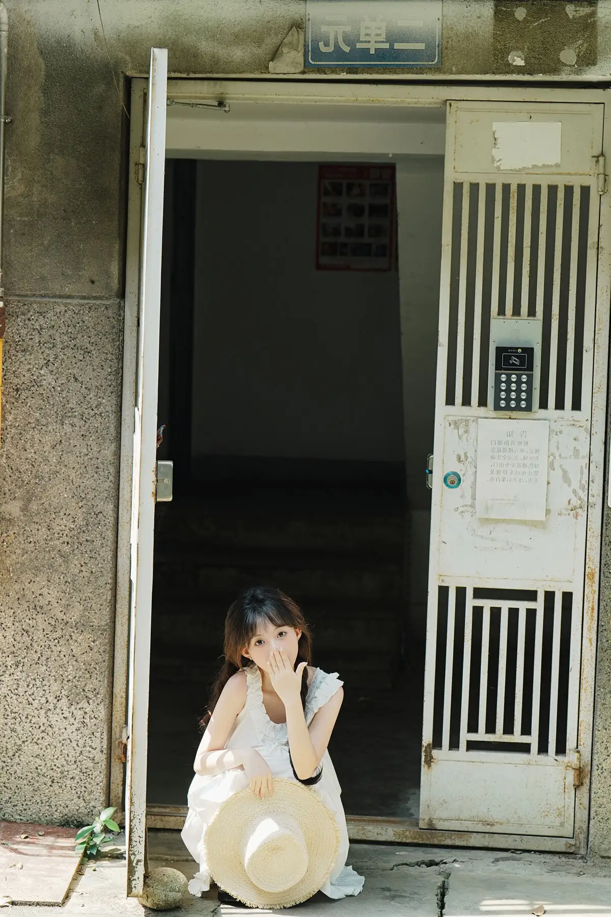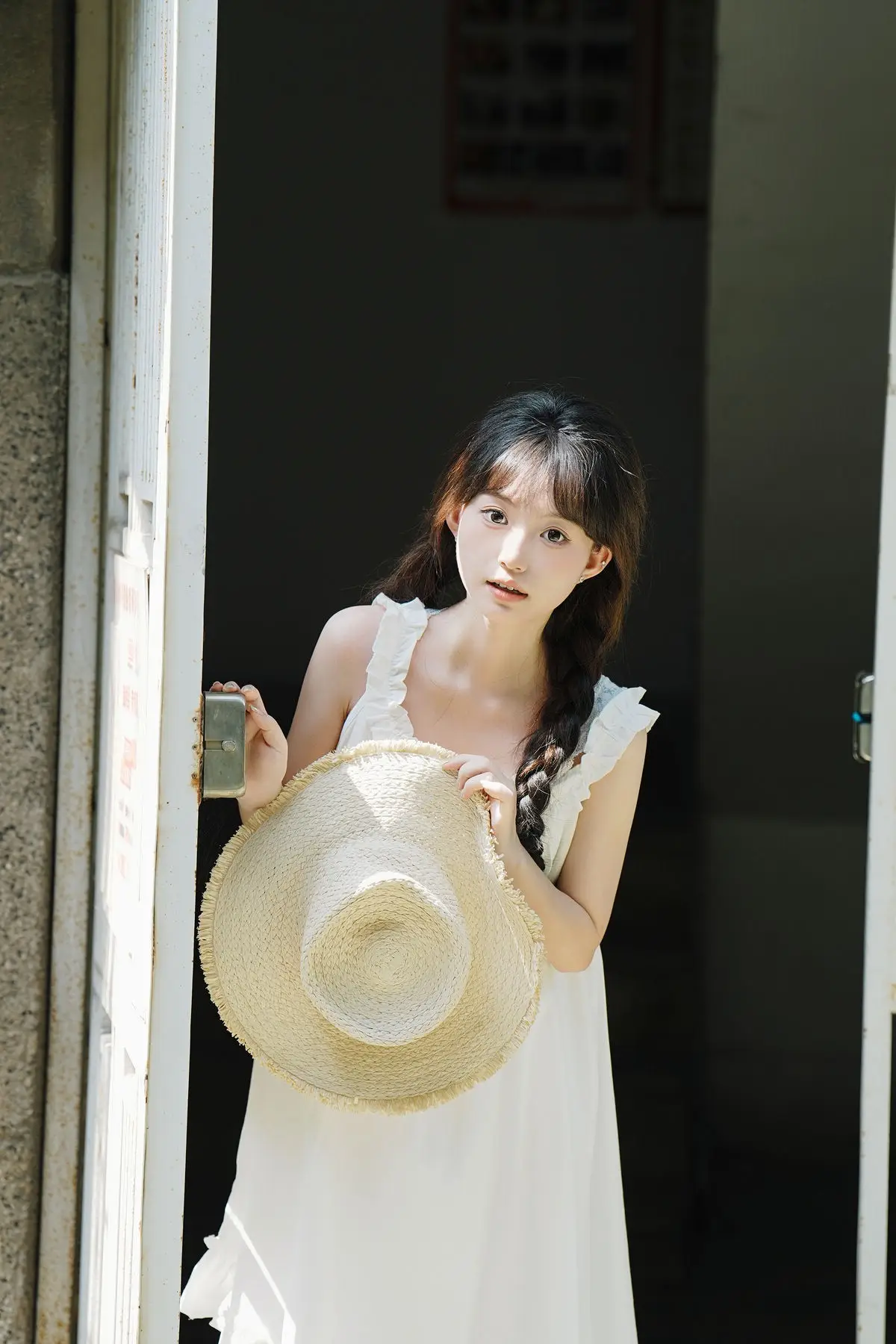 This image captures a serene moment of Qi E Luo Bo Guai a model featured in the YiTuYu Vol.8726 collection She stands gracefully within an ancient doorway bathed in soft morning light that embraces her figure in a pristine white dress The rustic straw hat and her gentle gaze create a pure nostalgic beauty evoking memories of tranquil summer days The simple yet vibrant scenery of an old community is beautifully portrayed through this muses image It tells a story of peace and natural charm unpretentious yet captivating#QiELuoBoGuai #YiTuYu #PureBeauty #RusticCharm #AsianModel