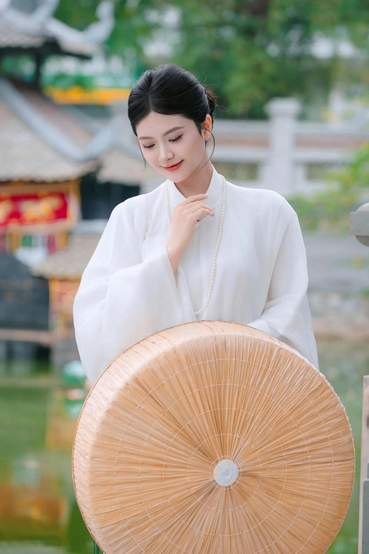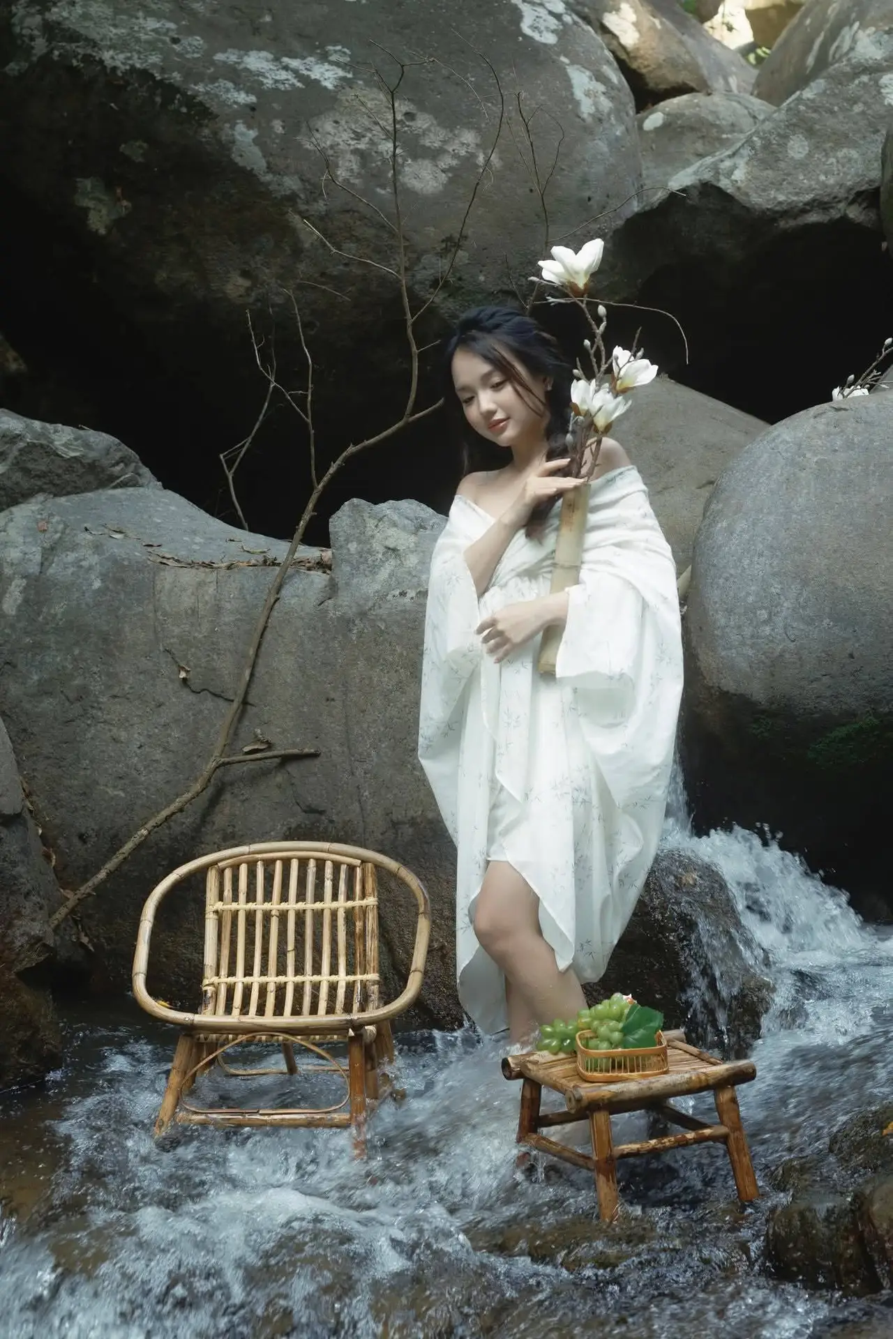Pure Beauty: Girl in White with Orchids - Grace and Serenity of East Asian Charm