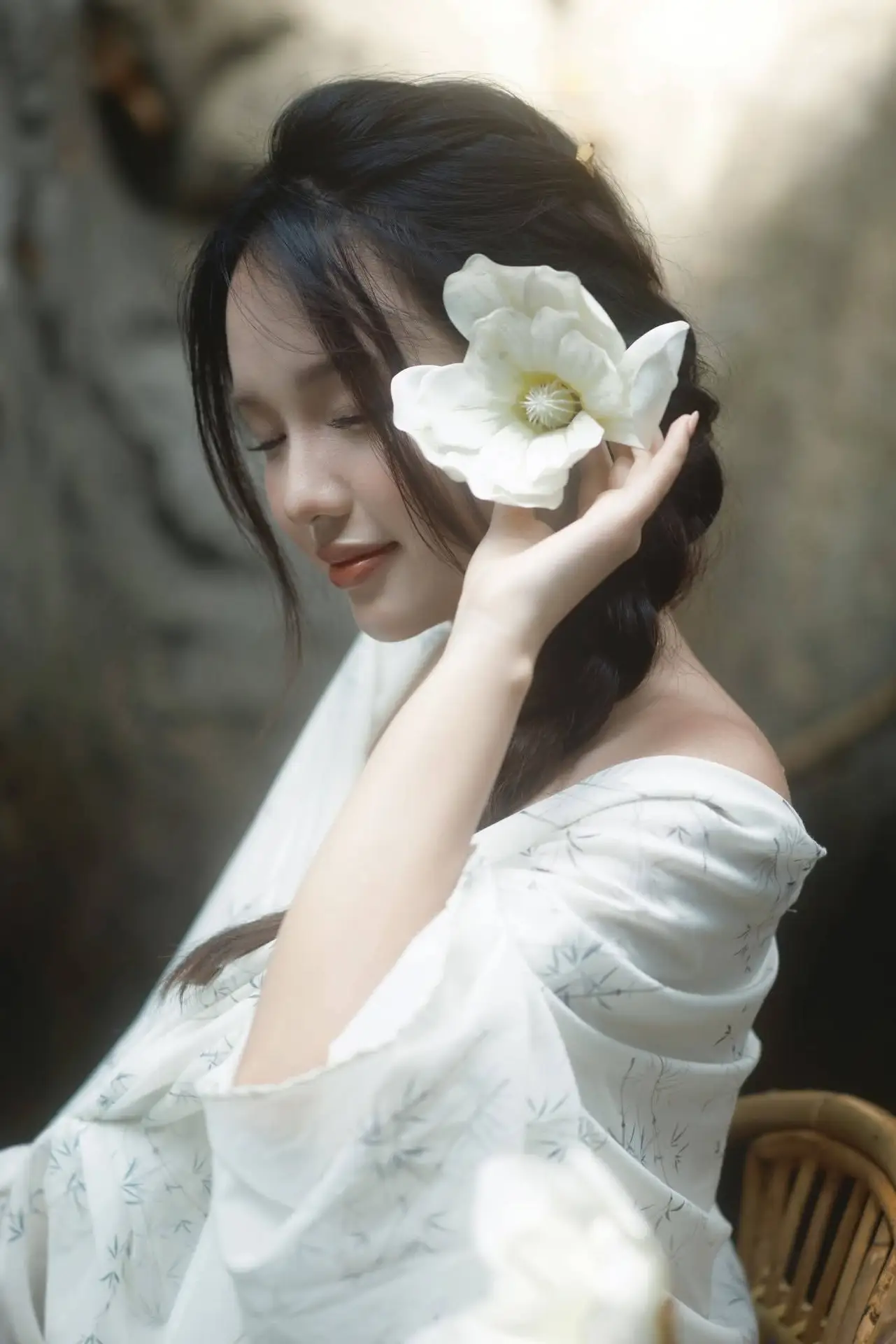 This beautiful photograph captures a peaceful moment of an East Asian woman with gentle and pure beauty. She softly closes her eyes or looks down, conveying deep tranquility and contemplation. A pristine white flower, gently placed near her ear, enhances her natural and pure aesthetic. Her long dark hair, elegantly styled, along with her pristine white attire, creates a harmonious and captivating overall look. Soft light highlights her smooth skin and delicate facial features. This image represents timeless grace, ethereal beauty, and brings a sense of calm to the viewer.#AsianBeauty #PureBeauty #WhiteFlower #ArtisticPortrait #PeacefulMoment