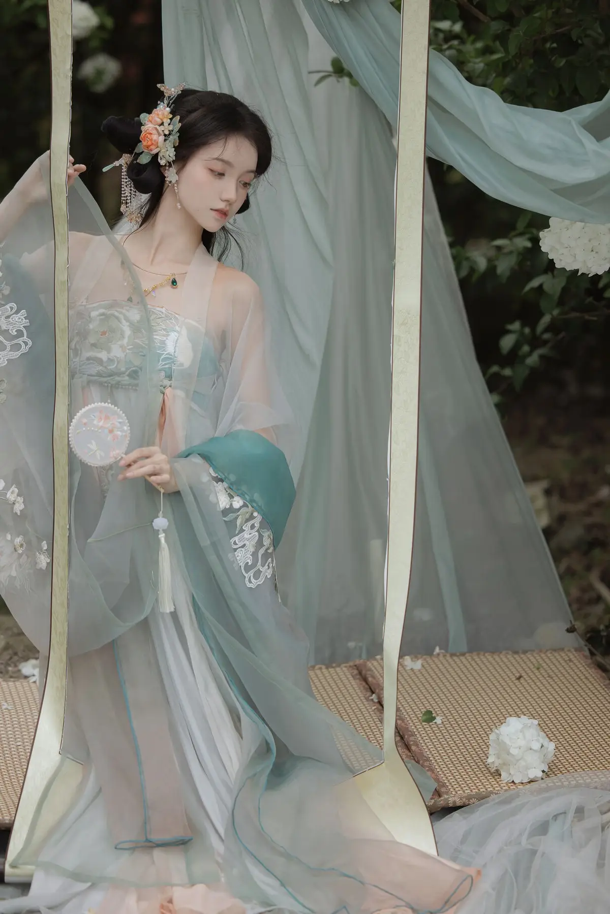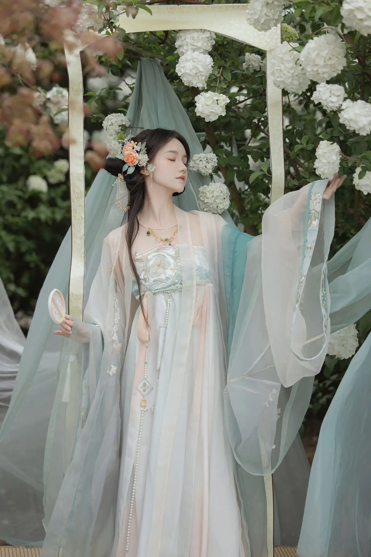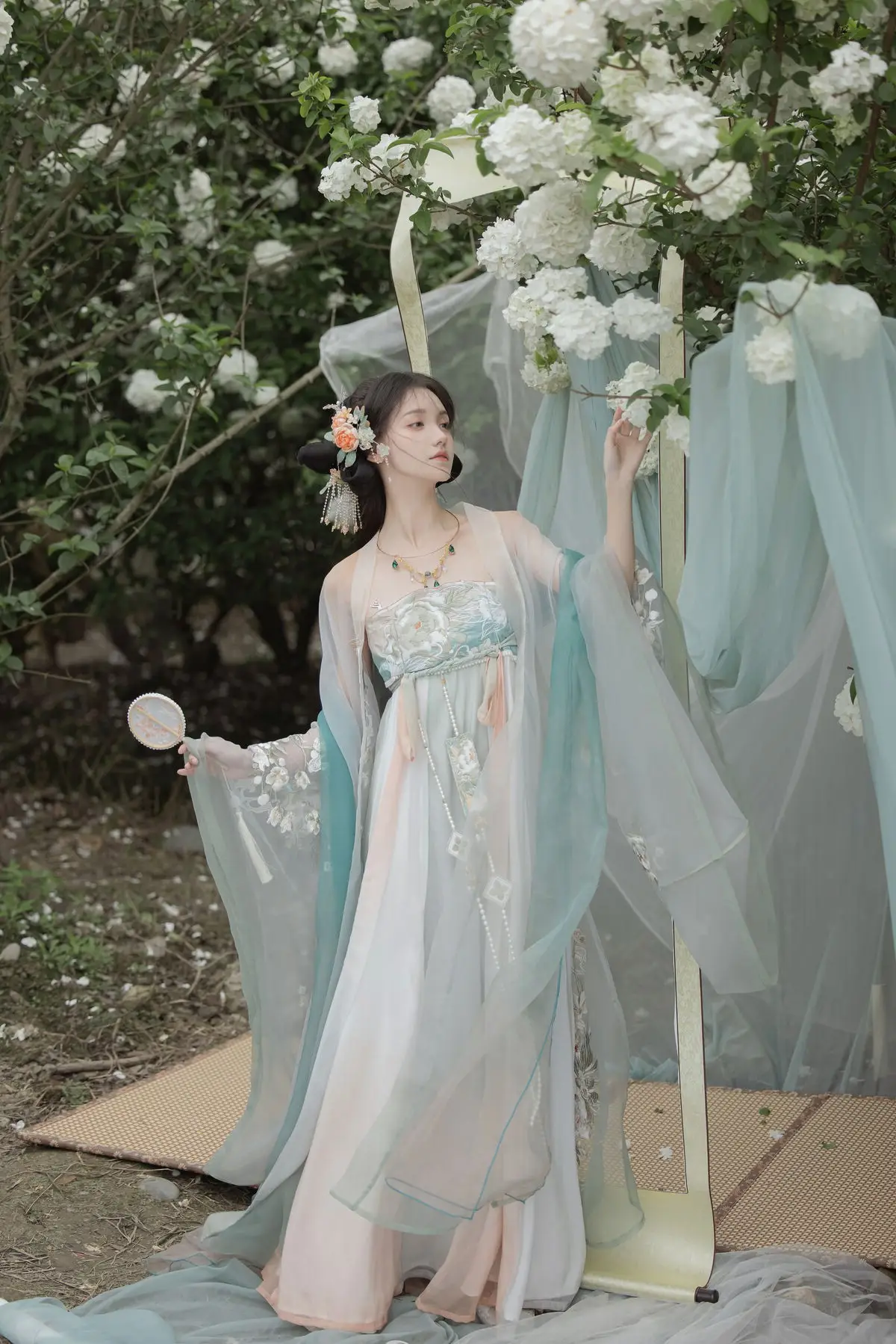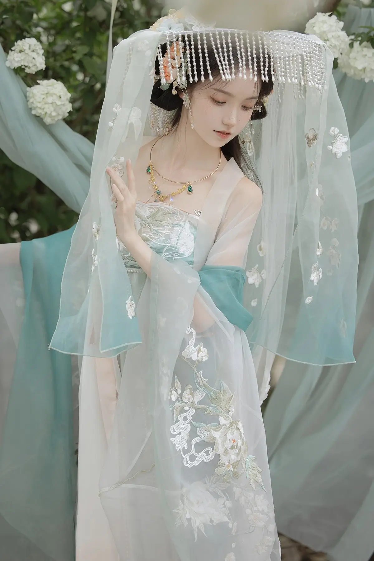 Immerse yourself in the enchanting world of Bao Zou Qi Qi with the captivating YiTuYu Vol.8607 photo collection. The model embodies ethereal beauty, gracefully adorned in a stunning Hanfu gown featuring delicate pastel shades of teal and blush pink. Every intricate detail of her attire, from the flowing fabric to the sheer veil, exudes a timeless elegance and classical charm. Posed amidst a lush garden of white blossoms, Bao Zou Qi Qi creates a scene that is both poetic and mystical. Her serene gaze and fluid posture compose a living work of art, evoking inspiration for traditional aesthetics and tranquil beauty. This collection beautifully showcases the harmonious blend of artistic photography and ancient culture.
