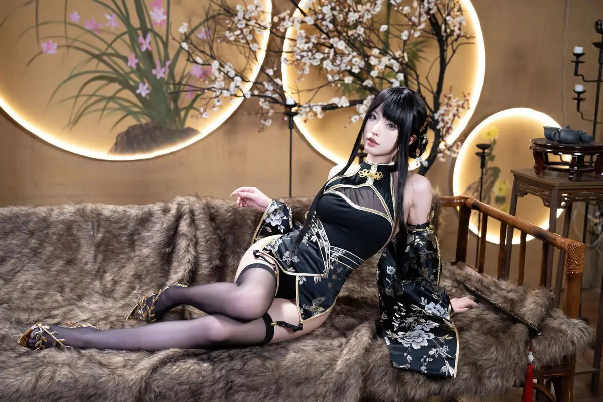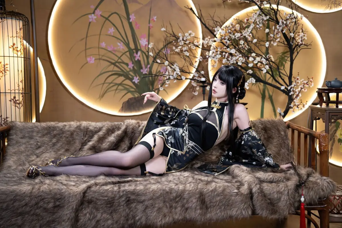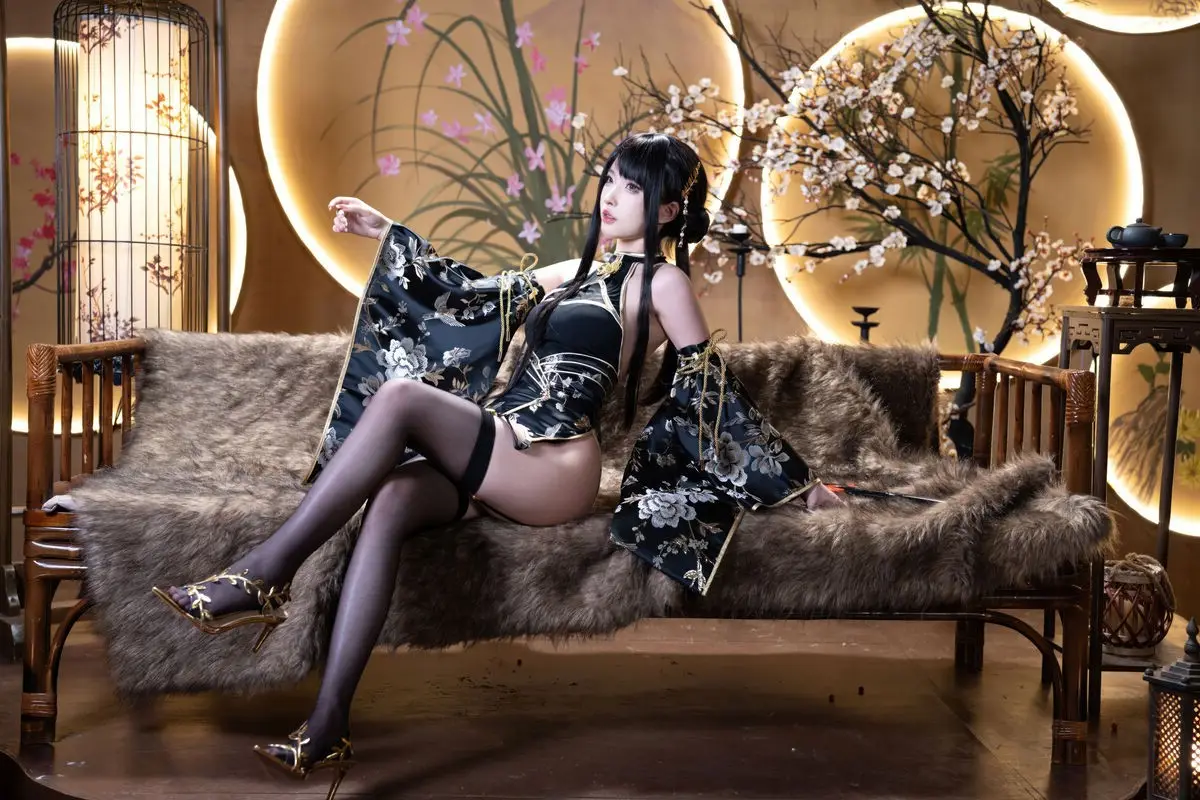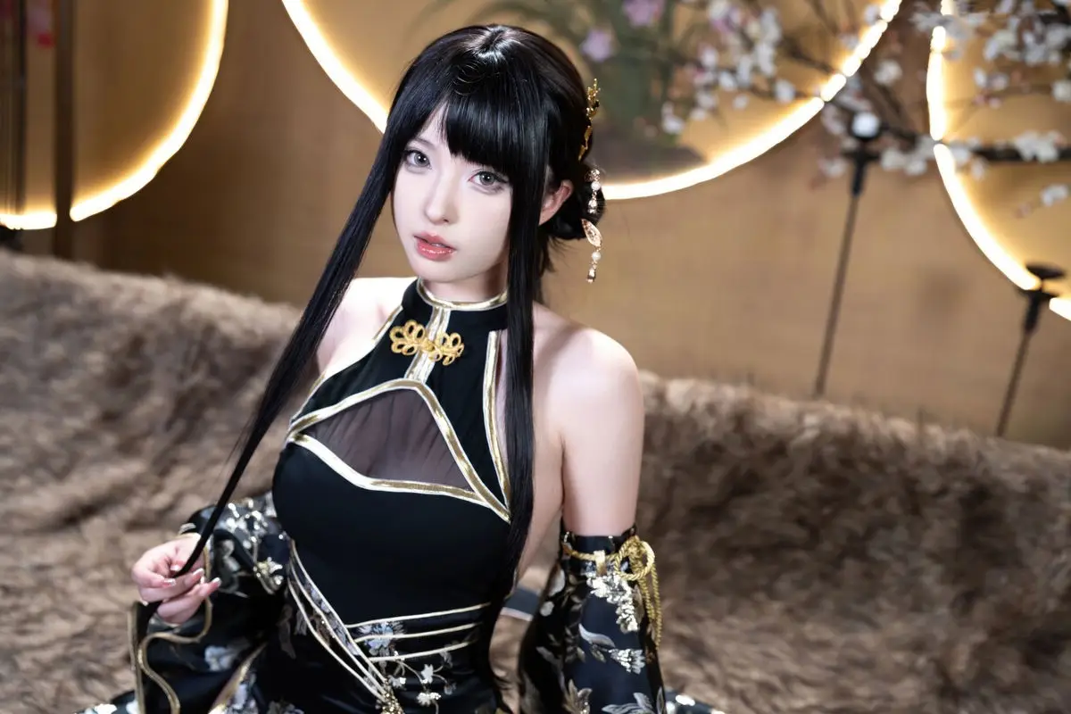 This exquisite Jin Zhi Yu Ye photo set features Coser Qing Shui You Nai in a captivating and regal depiction. She dons a modernized traditional black gown intricately adorned with golden patterns exuding an aura of nobility and power. Her long sleek black hair and delicate facial features coupled with sharp expressive eyes highlight the character’s mysterious and alluring charm. The antique-inspired backdrop illuminated by warm lantern light further enhances the ethereal and sparkling beauty of the cosplayer. Each photograph showcases meticulous attention to detail from the elaborate costume to the subtle expressions offering a mesmerizing visual experience that draws viewers into the vibrant world of cosplay.#Coser #QingShuiYouNai #JinZhiYuYe #CosplayArt #AsianFantasy #ElaborateCostume