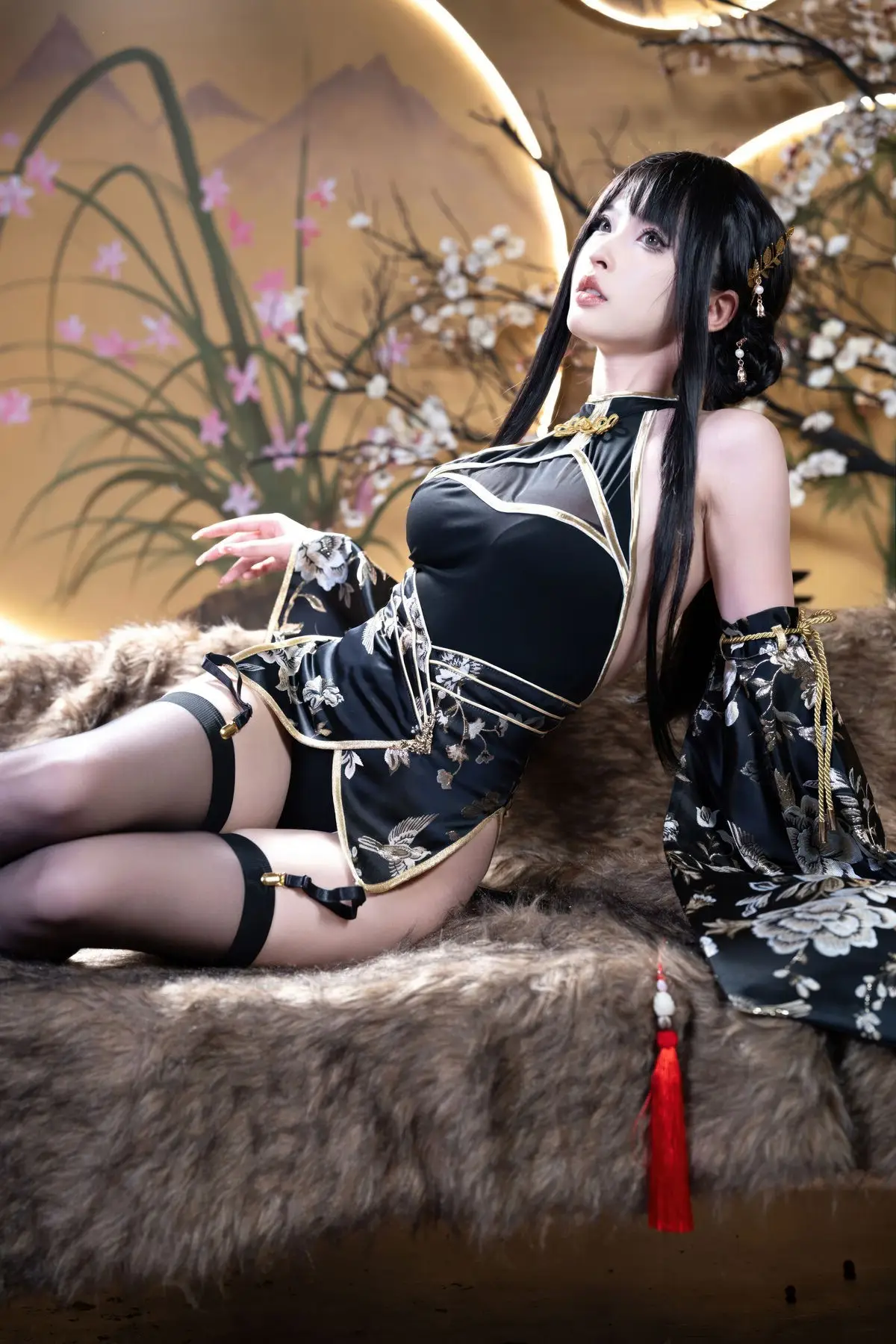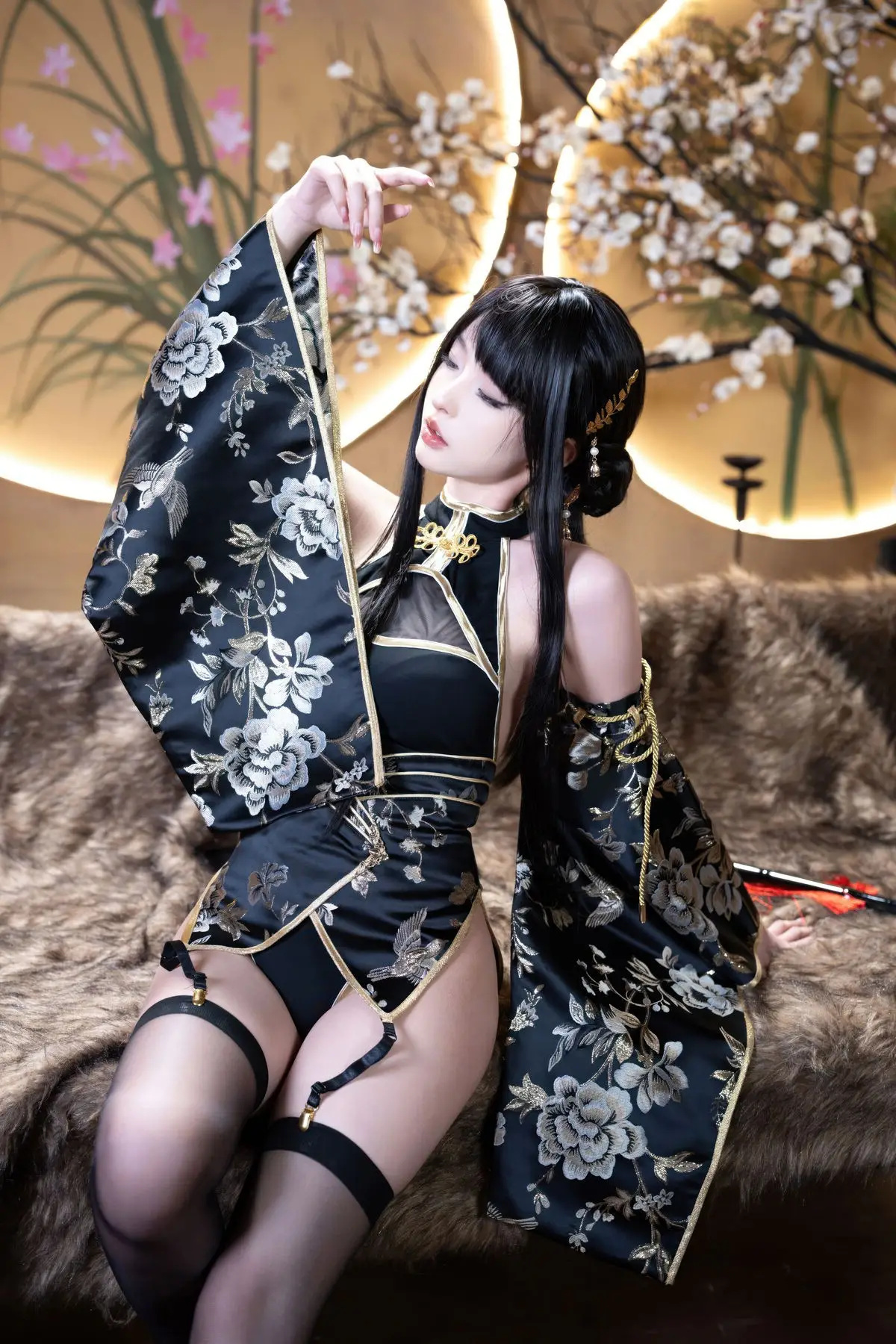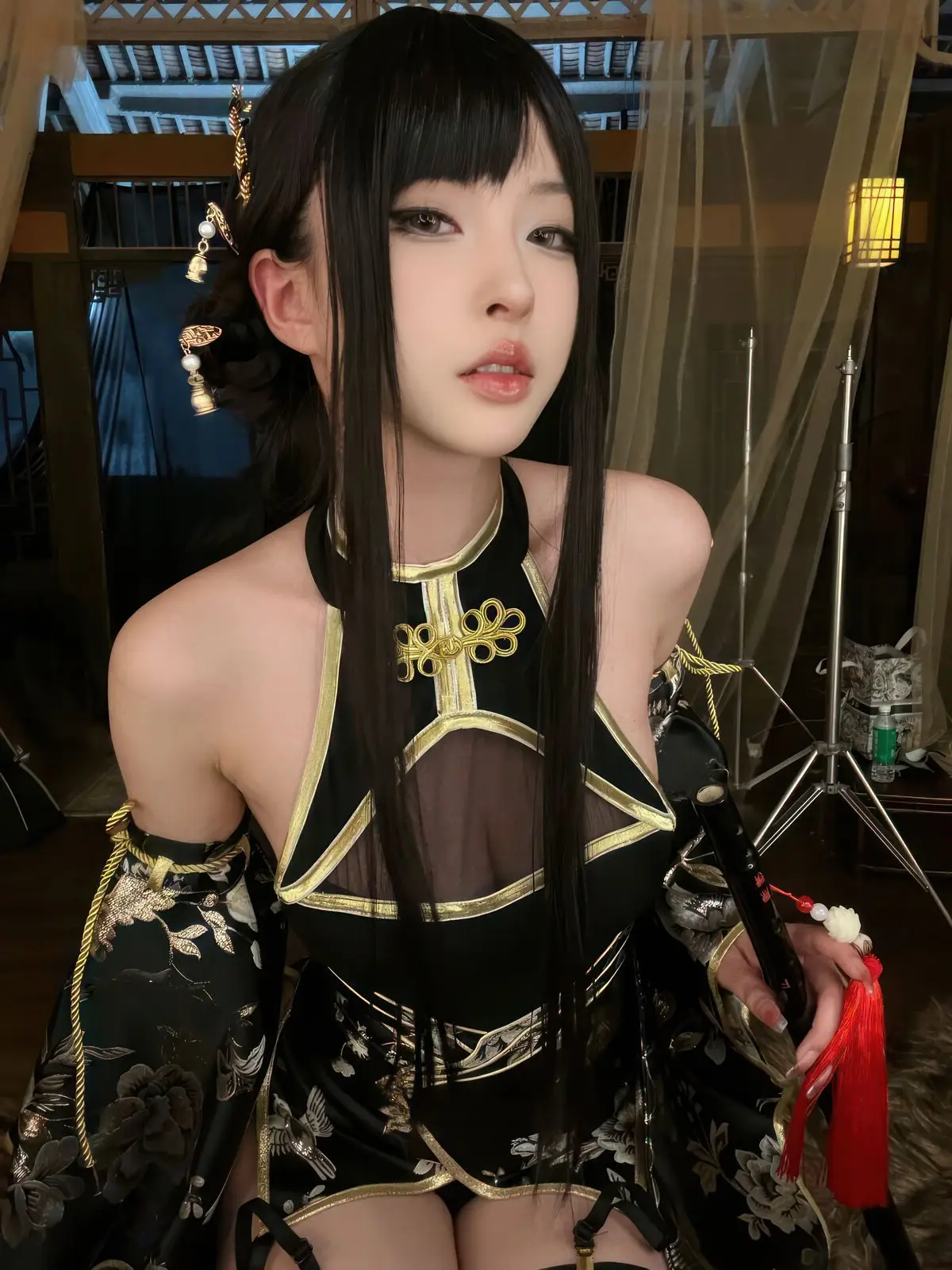 This exquisite Jin Zhi Yu Ye photo set features Coser Qing Shui You Nai in a captivating and regal depiction. She dons a modernized traditional black gown intricately adorned with golden patterns exuding an aura of nobility and power. Her long sleek black hair and delicate facial features coupled with sharp expressive eyes highlight the character’s mysterious and alluring charm. The antique-inspired backdrop illuminated by warm lantern light further enhances the ethereal and sparkling beauty of the cosplayer. Each photograph showcases meticulous attention to detail from the elaborate costume to the subtle expressions offering a mesmerizing visual experience that draws viewers into the vibrant world of cosplay.#Coser #QingShuiYouNai #JinZhiYuYe #CosplayArt #AsianFantasy #ElaborateCostume