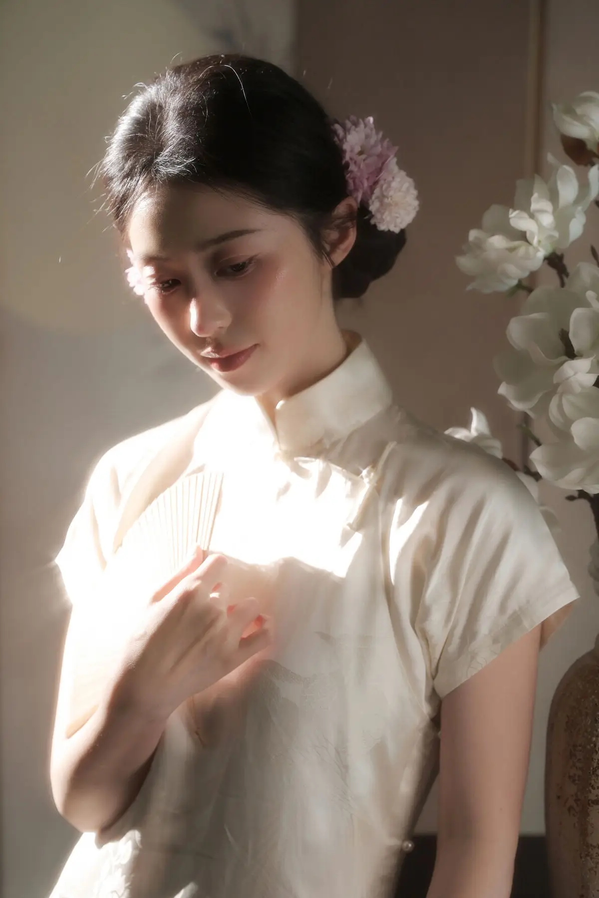 This captivating portrait showcases Fen Mian Gu Niang's ethereal and gentle beauty. Dressed in a delicate cream-colored Qipao, her slender silhouette and noble demeanor are exquisitely highlighted. A subtle purple flower adorning her classic updo adds a touch of timeless elegance to her features. Soft golden light streams through the window, caressing her smooth skin and creating a serene, romantic ambiance. Her contemplative gaze, directed slightly away, evokes a sense of introspection and nostalgia, reminiscent of a bygone era. This image transcends mere photography, offering a profound artistic expression of grace and enduring East Asian charm.