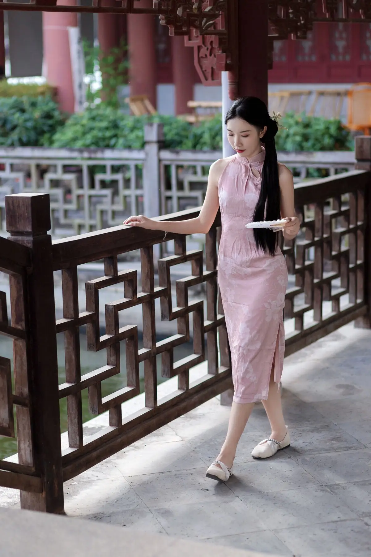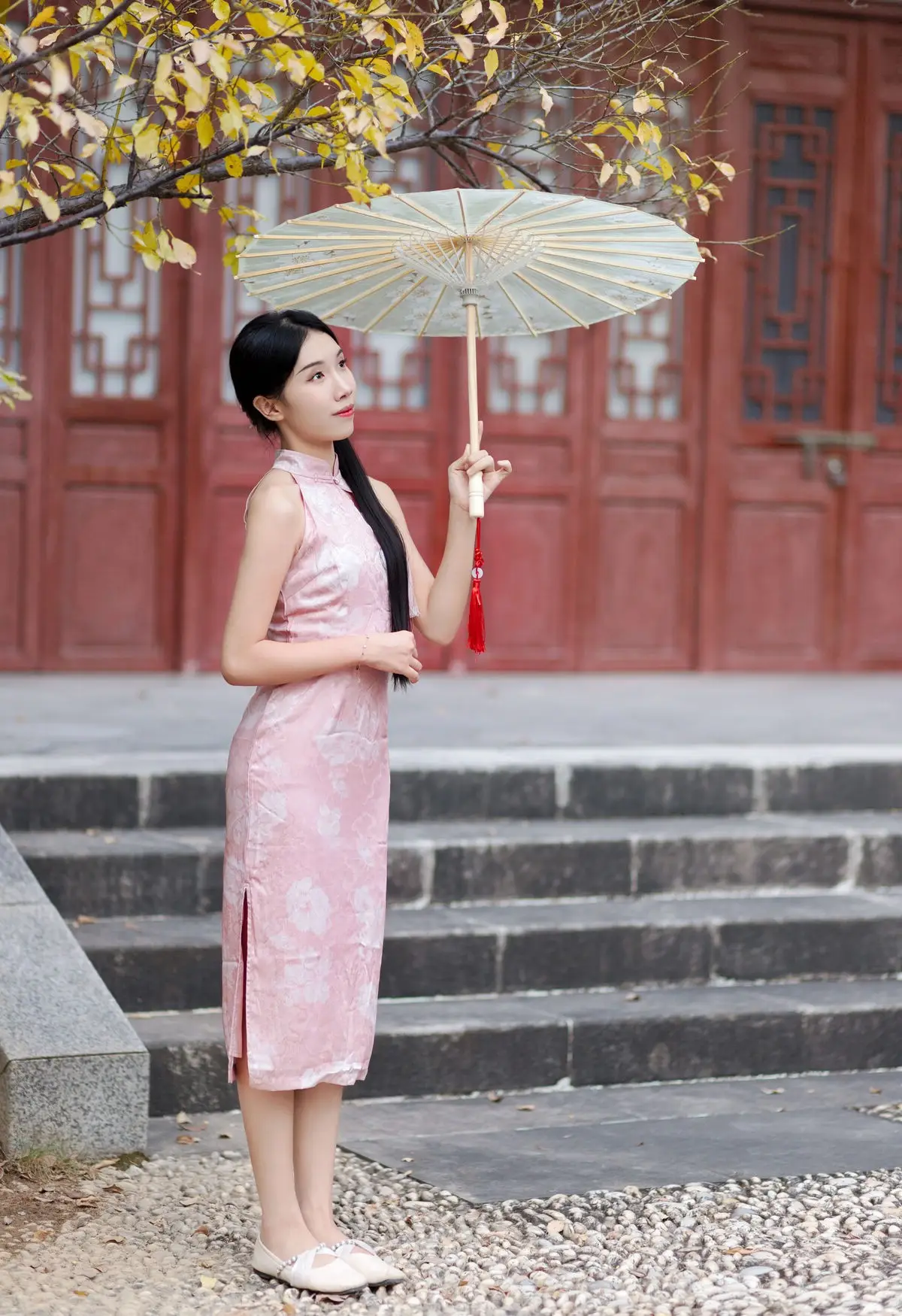 This stunning photograph features model Chu Yin in a delicate pink qipao exuding classic elegance and grace She stands amidst traditional Chinese architecture under the golden leaves of autumn creating a poetic backdrop Chu Yin gently holds a traditional parasol her gaze wistfully directed upwards evoking a sense of tranquility and depth The formfitting qipao highlights her slender figure blending perfectly with her distinct East Asian beauty This is more than just a fashion photo it is an artistic piece where Chu Yin's beauty and traditional attire are celebrated echoing Eileen Chang's famous sentiment about the perfect union of qipaos and beauties