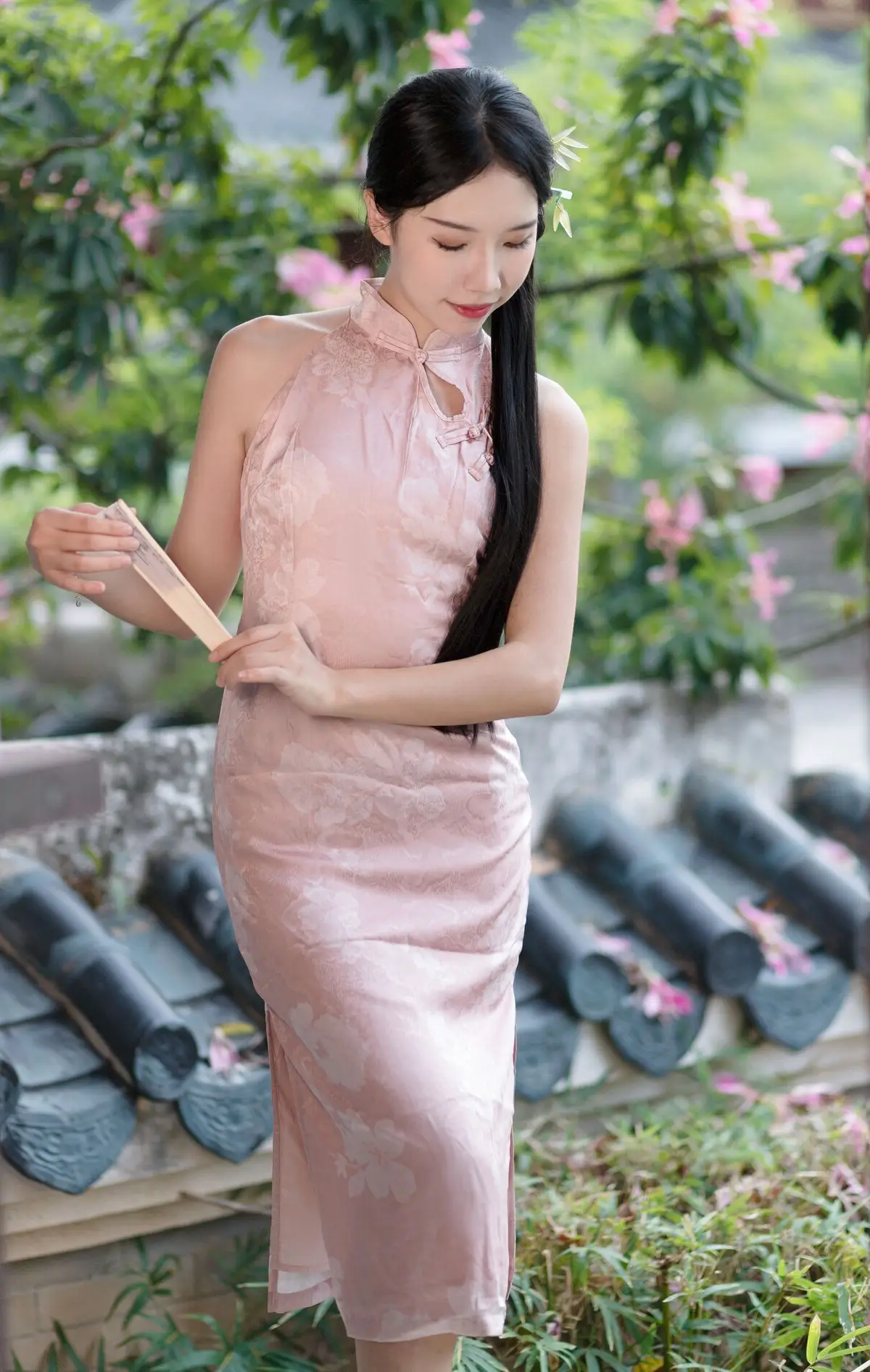 This photograph captures the ethereal beauty of a young Asian woman in an exquisite pale pink Qipao She stands gracefully against an ancient stone wall evoking a sense of nostalgia and tranquility The traditional attire featuring subtle embroidered patterns accentuates her elegance and nobility Soft light illuminates her fair skin and silky dark hair adorned with a delicate flower This moment is not merely a harmonious blend of human and architecture but also a symbol of the timeless beauty of Asian women The woman resembles a shy blossom amidst an aged setting